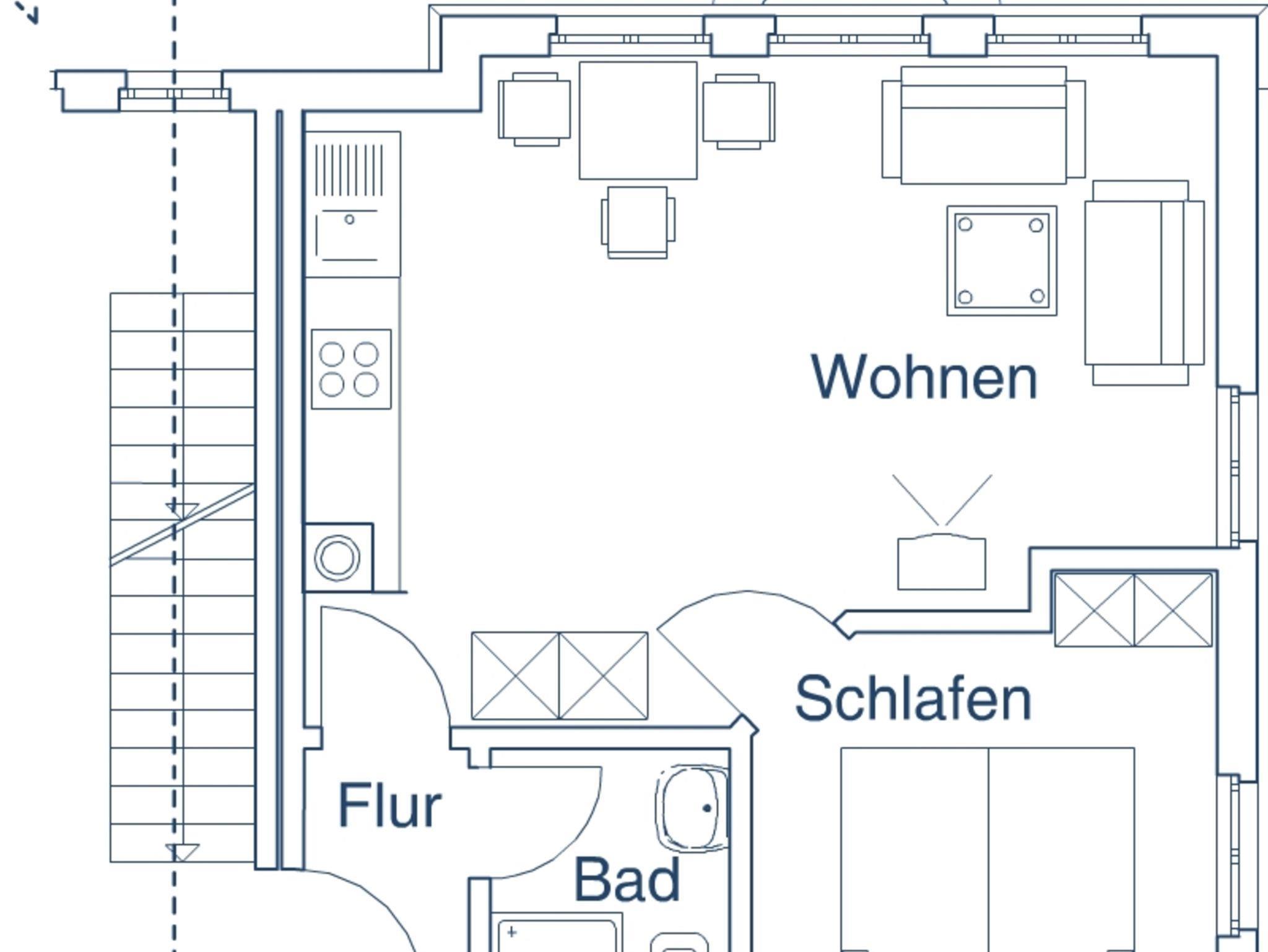 Diese stilvoll eingerichtete Wohnung mit 40² liegt im Erdgeschoss. Es gibt einen Wohnraum mit kompletter, gut ausgestatteter Küchenzeile, ein separates Schlafzimmer mit 1,80 m breitem Doppelbett, ein Bad mit Dusche (Wo. 1) oder Badewanne mit Duschvorrichtung (Wo. 4) sowie eine möblierte Terrasse. Glatte Fußböden, Ledercouch und abwischbare Bezüge kommen Allergikern entgegen. Die Nichtraucherwohnung wirkt durch viele, auch bodentiefe Fenster hell und freundlich.