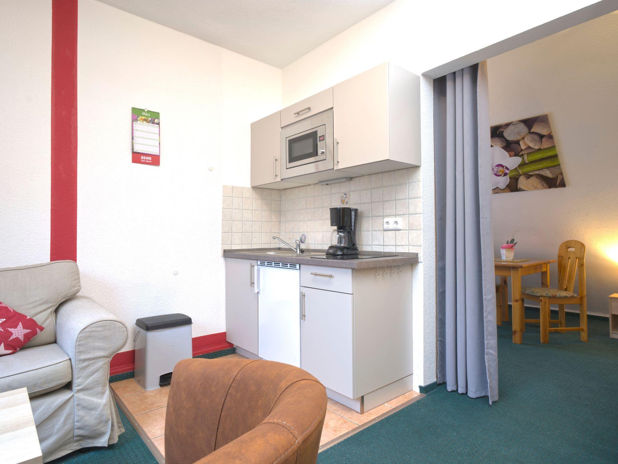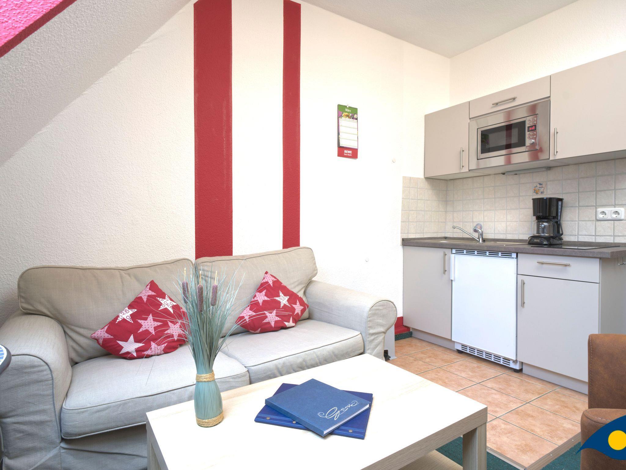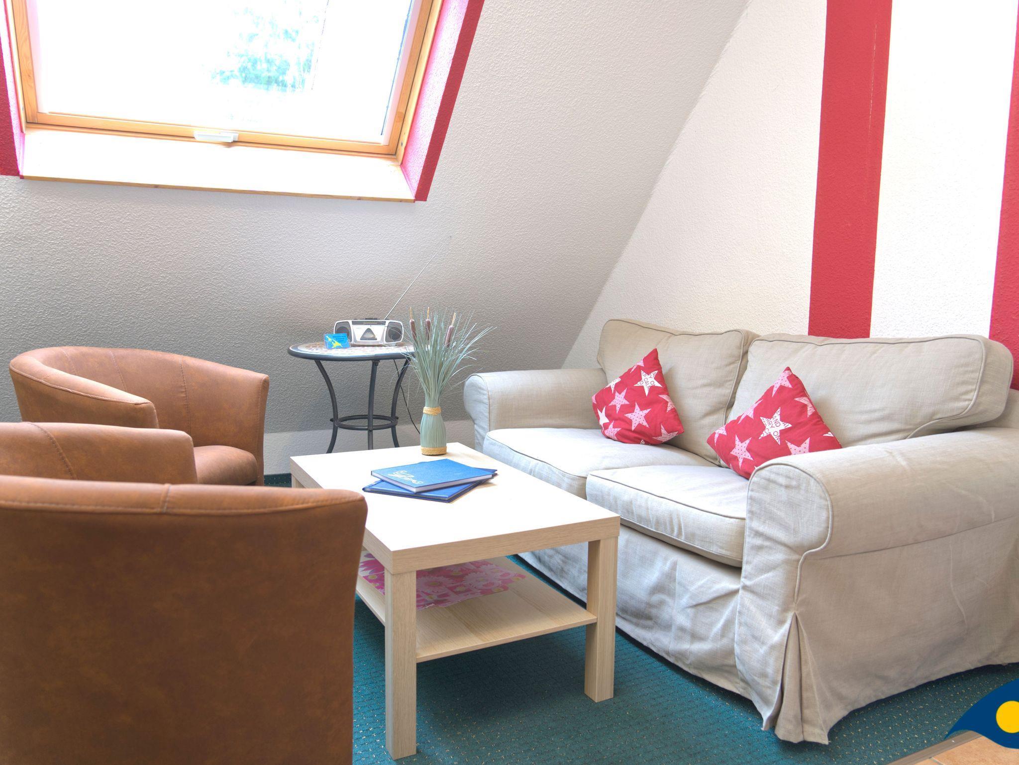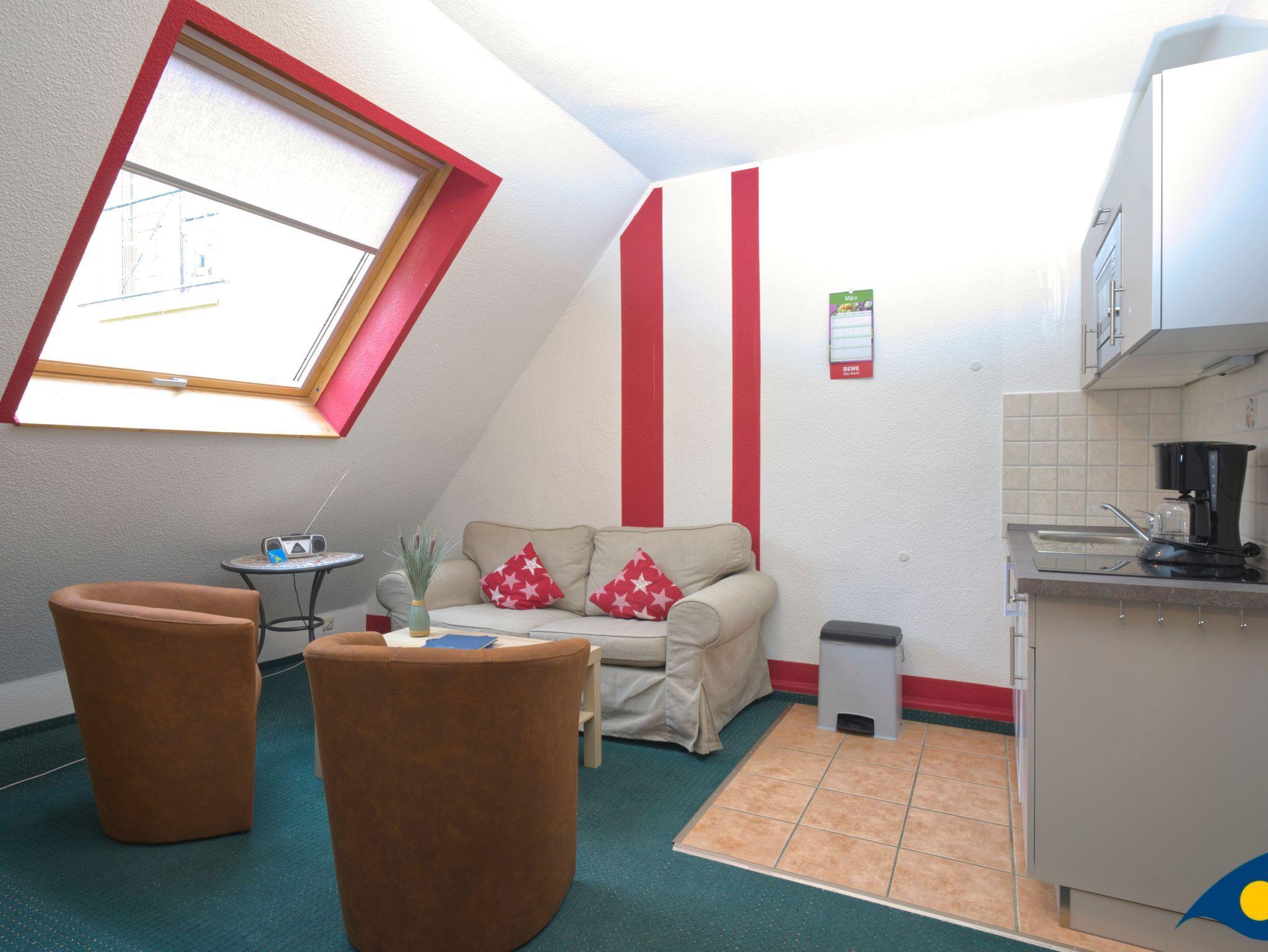 Diese 2-Zimmer-Ferienwohnung bietet Ihnen auf 36 qm Wohnfläche Gemütlichkeit unterm Dach im Haus der Ferienwohnungen „Kirchstraße“. Hier verbringen 2 Personen einen erholsamen Urlaub. Neben dem Wohnzimmer mit der kleinen Essecke steht Ihnen ein Schlafzimmer mit einem bequemen Doppelbett und genügend Stauraum für Ihre Urlaubsgarderobe zur Verfügung. Die kleine Pantryküche ist im Wohnraum integriert. Der Balkon lädt zum Sonnenbaden oder einem Frühstück unterm freien Himmel ein. Das Badezimmer mit WC und Dusche ist mit einem Fenster ausgestattet. Das Appartement hat einen offen gestalteten Grundriss. Auf eine Tür zwischen dem Wohn- und Schlafraum wurde verzichtet, dadurch wirkt das Appartement noch großzügiger.