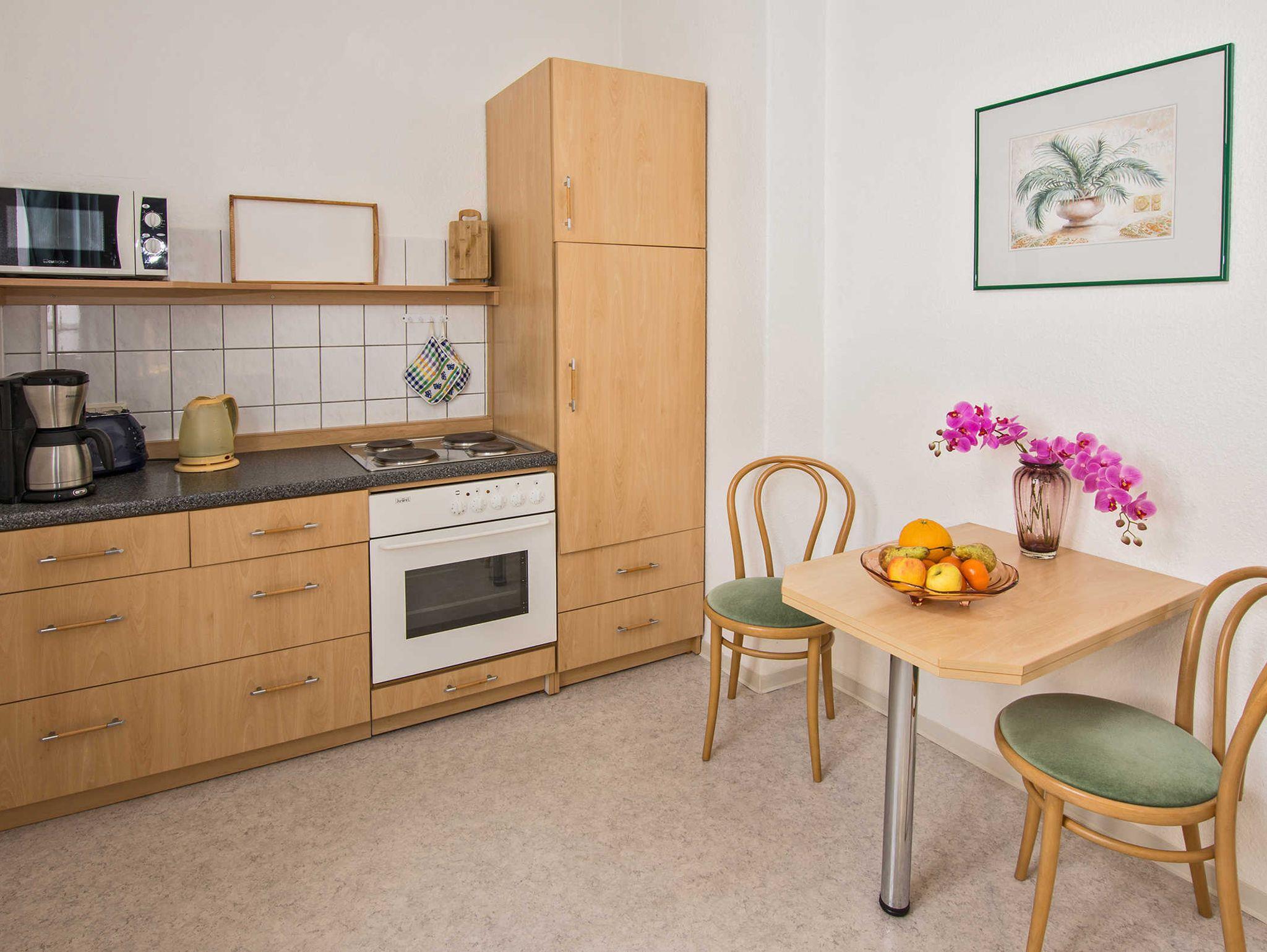 Für 1-4 Personen, 55 qm, Küche mit Küchenzeile und Esstisch, DU/WC, im EG oder 1. OG, Blick zum Waldrand.