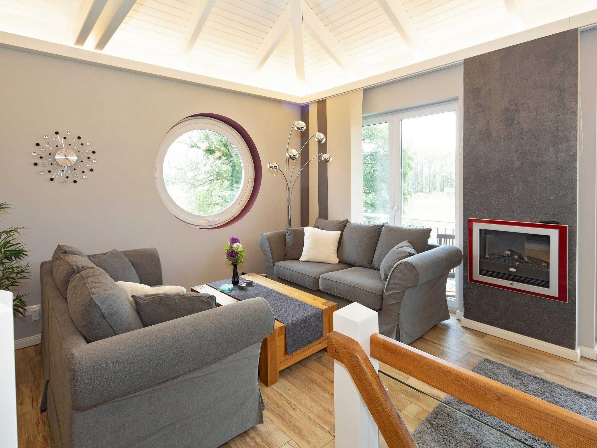 Im Wohnbereich im Obergeschoss sorgt das großes Sofa für kuschelige Stunden und der Kamin für romantische Stimmung. Vom Balkon aus haben Sie einen unverwechselbaren Blick auf den Gothensee und auf Wiesen und Wälder. Der LED Fernseher bietet ein augenschonendes Fernseherlebnis. Das Bockspringbett lässt ebenfalls keine Wünsche offen.