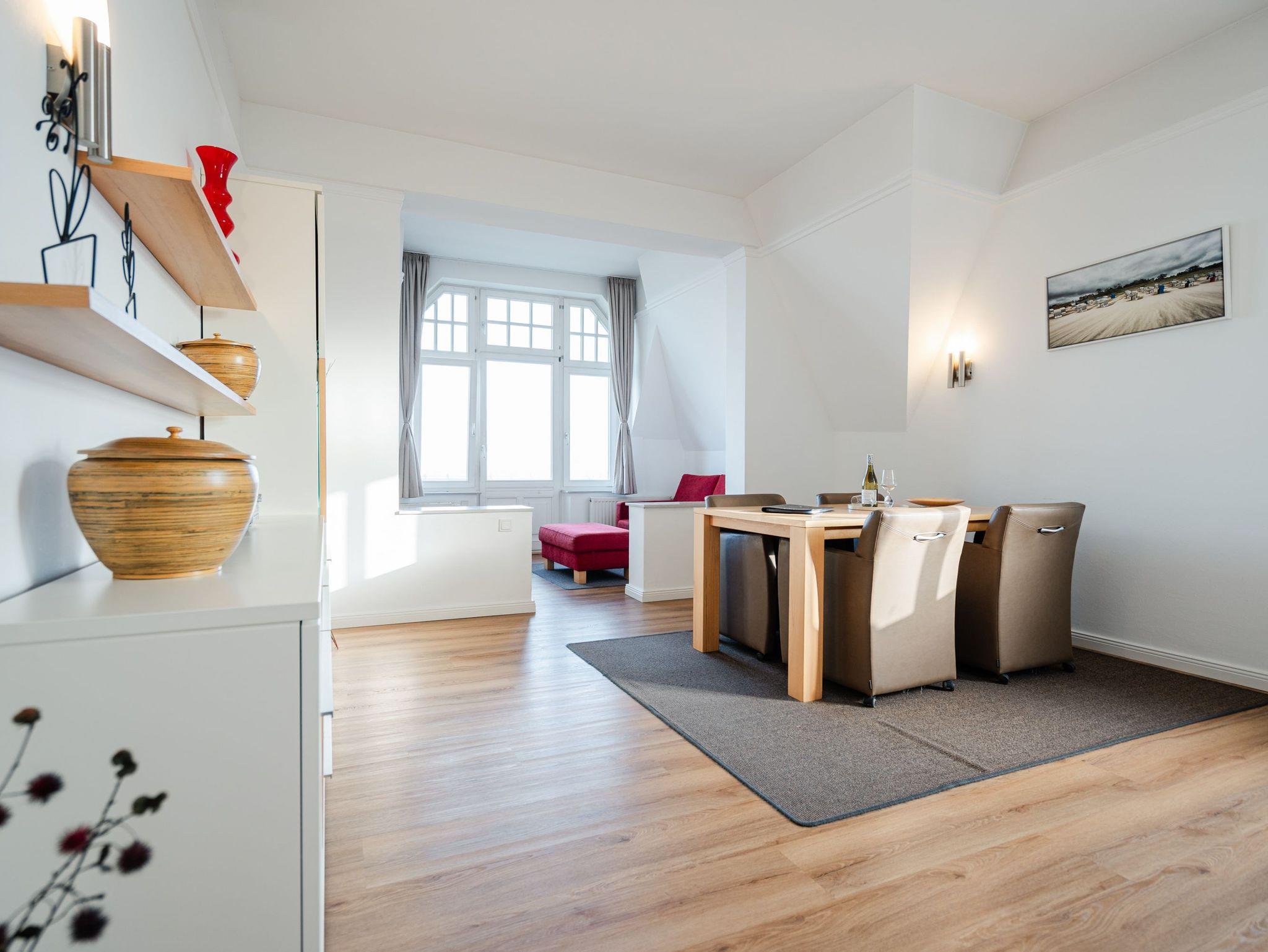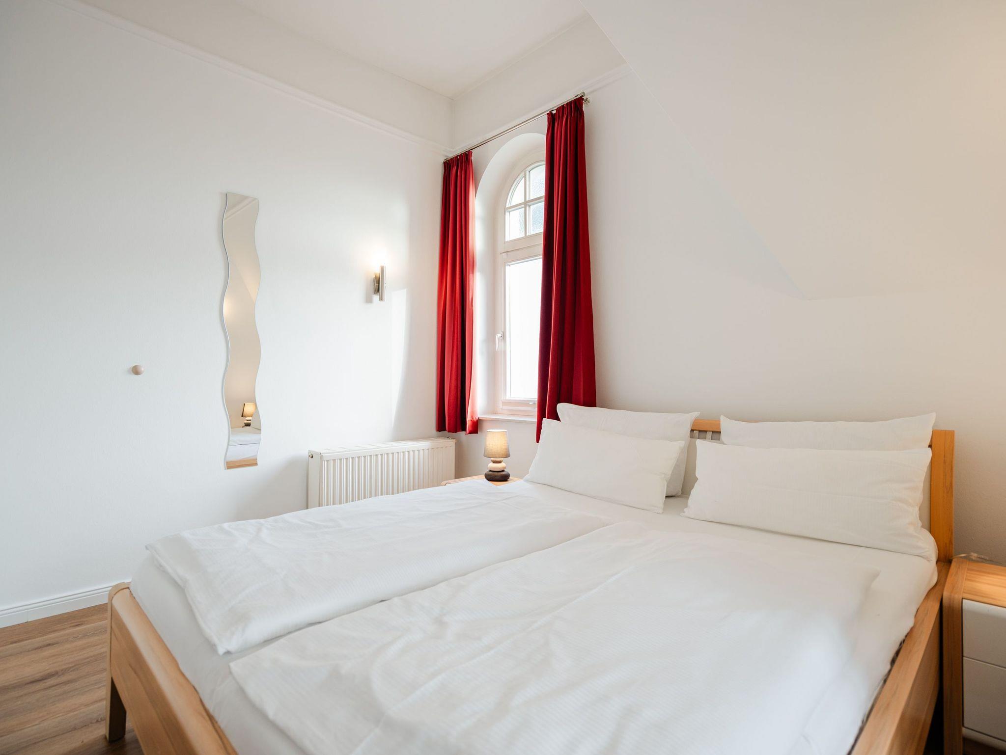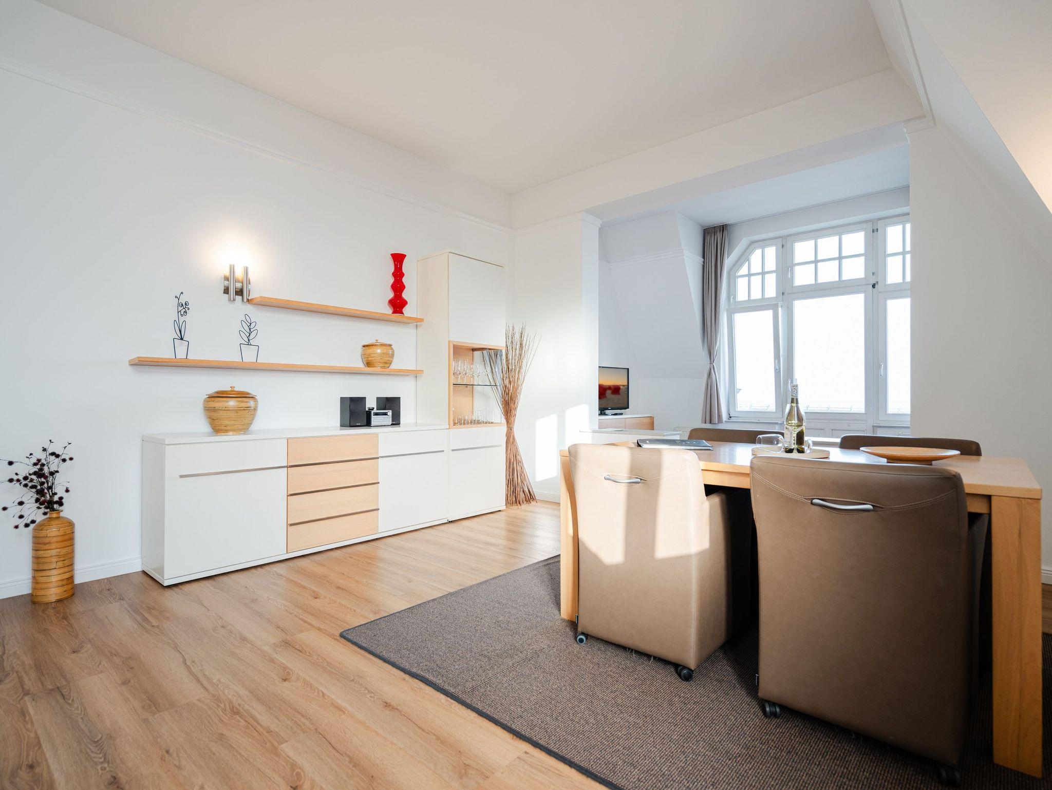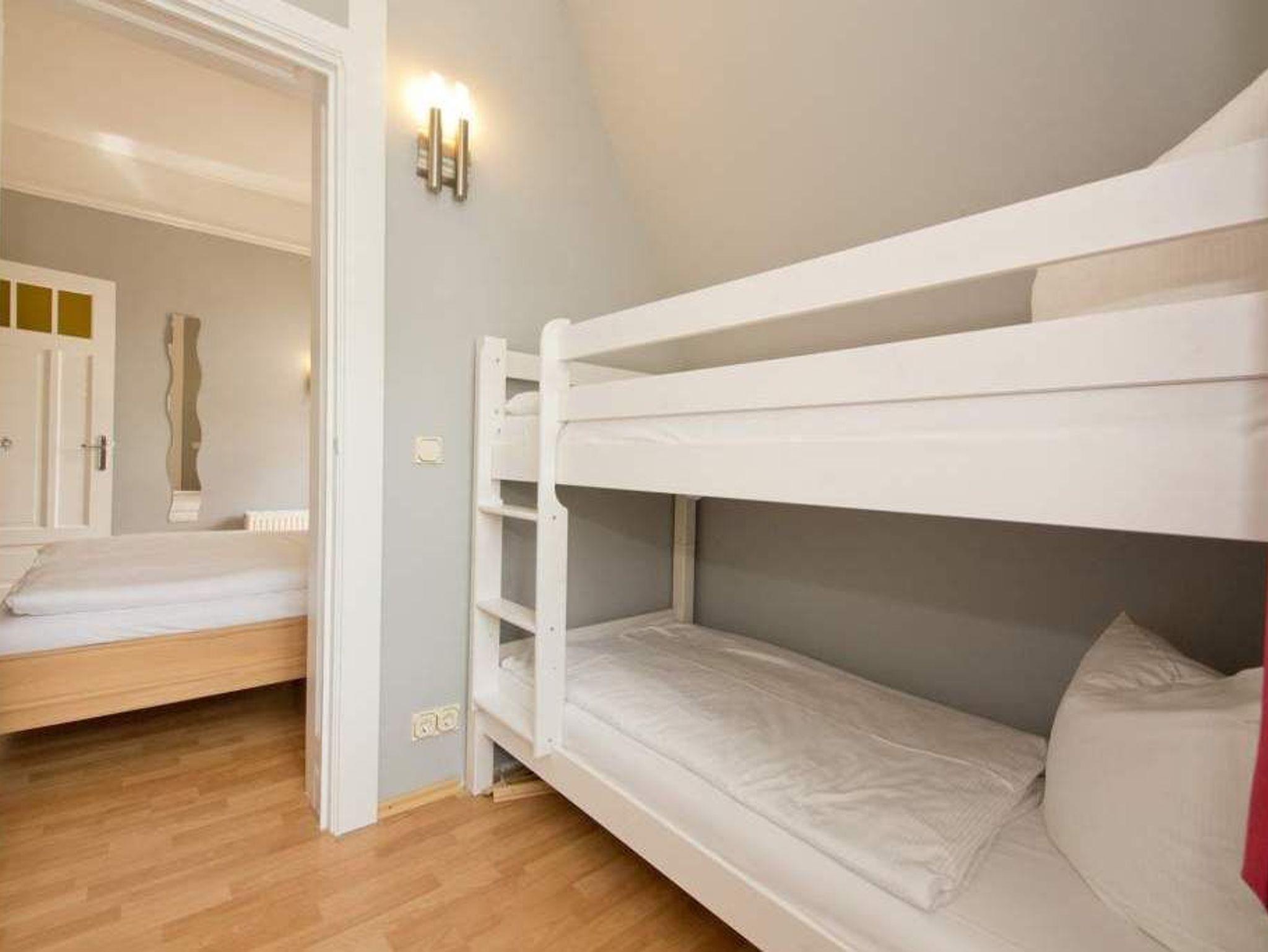 Ein atemberaubender Blick auf das Meer und die pommersche Bucht bietet sich hier - fantastische Aussichten also und dies nicht nur in Hinsicht auf die Blickachsen! Das Appartement 12 ist eine wunderschöne 3-Raum-Ferienwohnung und begrüßt Sie im 3. Obergeschoss der Villa Dora. Entstanden ist ein modernes Domizil, das durch seine wohnliche Gemütlichkeit besticht. Auf 70 qm finden bis zu 4 Personen genügend Platz für einen erholsamen Urlaub. Der lichtdurchflutete Wohnbereich ist mit einer bequemen Sitzgruppe und Flat-TV ausgestattet, hier findet auch der großzügige Essbereich seinen Platz. Die farbigen Akzente und der tolle Ausblick werden Sie sicher begeistern! Die Küche ist komplett ausgestattet und separiert. Für die Nacht ist ein Schlafzimmer mit Doppelbett (1,60m x 2,00m) vorhanden, es ist ein Durchgangszimmer zum zweiten kleinen Schlafzimmer mit einem Etagenbett (0,90m x 1,90m - ideal für Kinder). Ein großes Bad mit zwei Waschbecken, WC, Bidet und Dusche ergänzt die Wohnung. Auch der schöne Balkon mit Meerblick wird sicher schnell zu Ihrem Lieblingsplatz! Für Ihren Komfort sind die Betten bei der Anreise bezogen und Handtücher liegen bereit. Für kleine Gäste kann ein Kinderreisebett (findet im Kinderzimmer Platz) und ein Kinderhochstuhl bestellt werden. Für Ihren PKW steht Ihnen ein Parkplatz mit Poller vor dem Haus zur Verfügung.