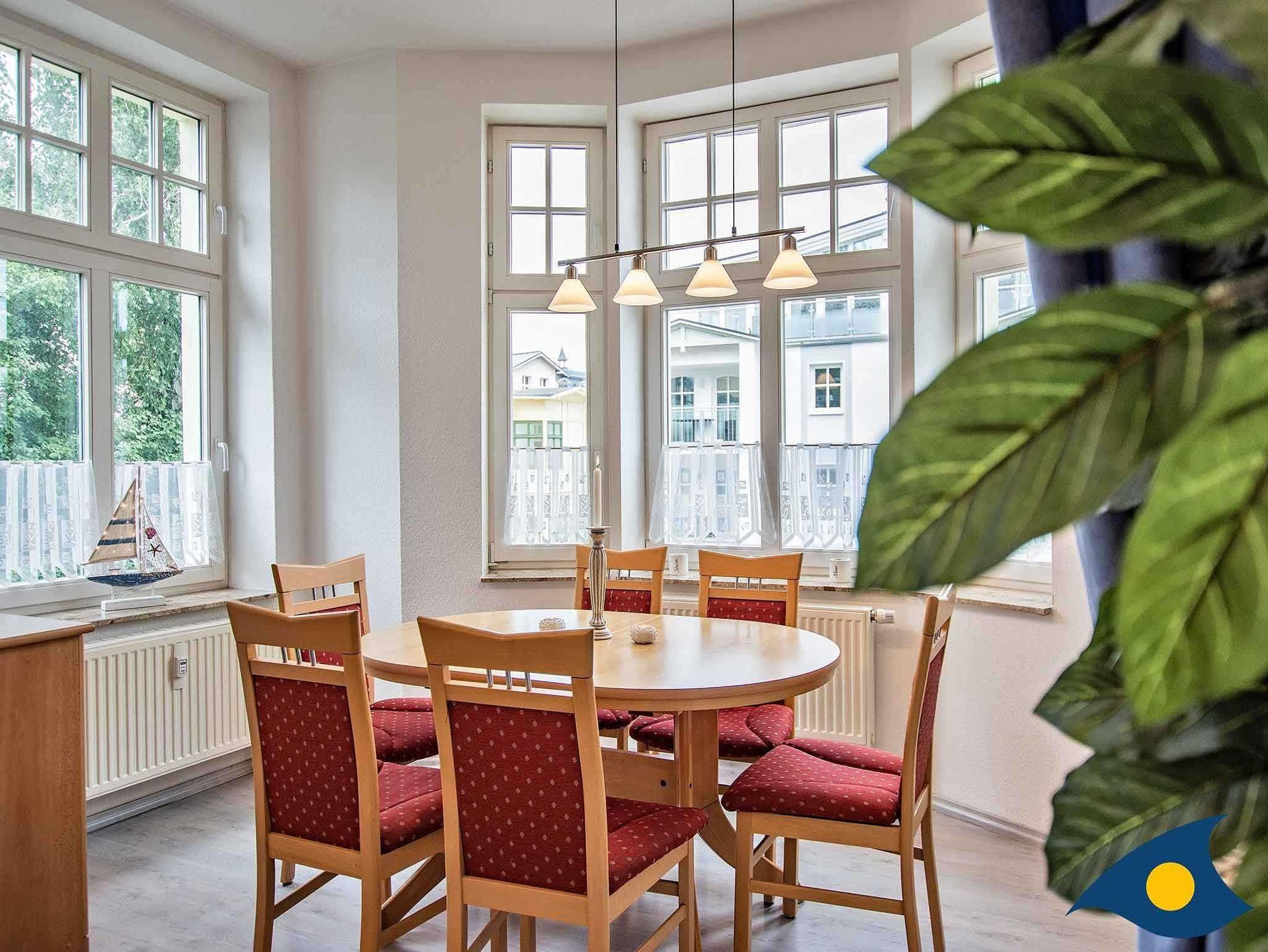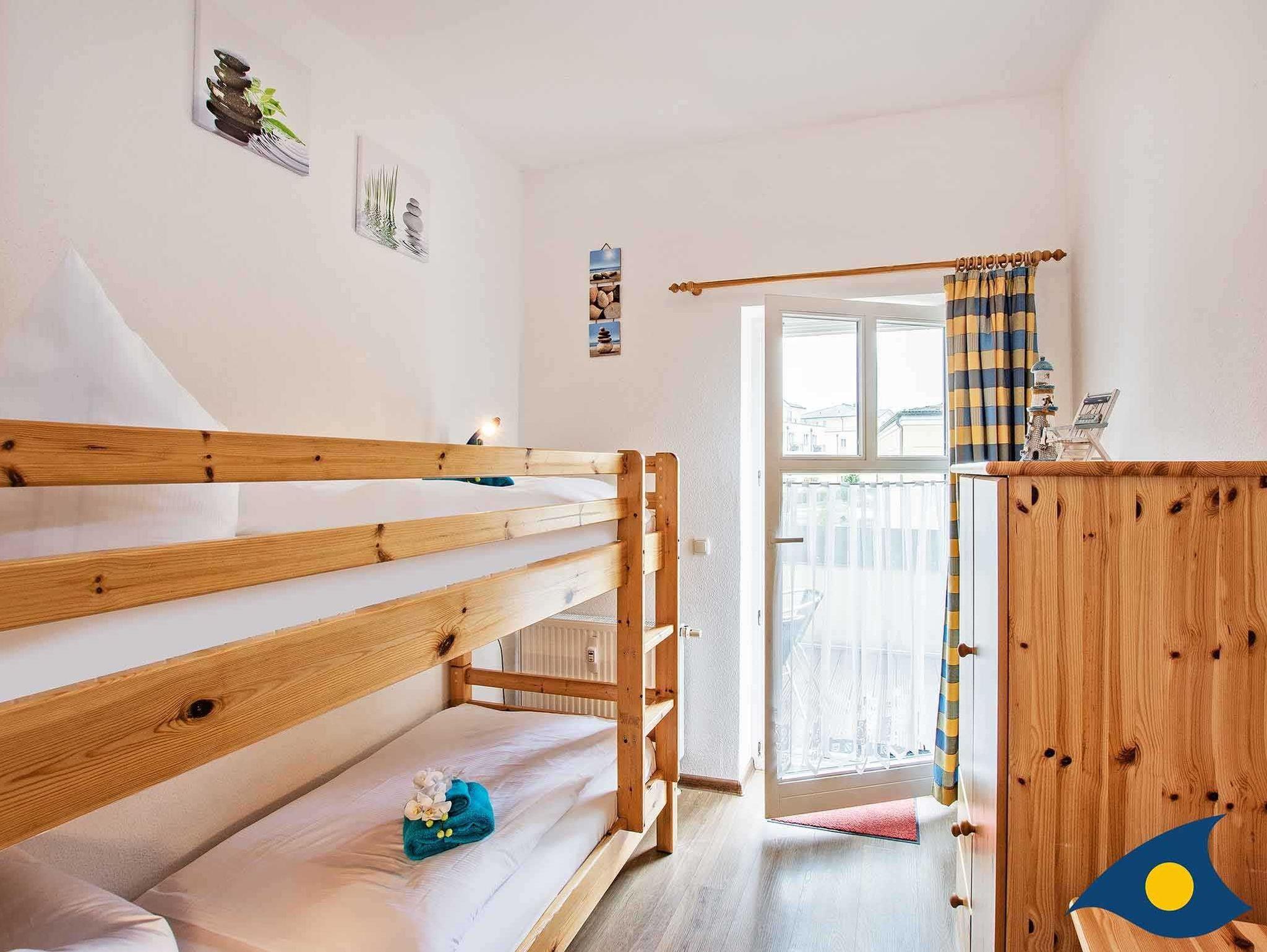 Die großzügige, liebevoll eingerichtete 3-Zimmer-Ferienwohnung befindet sich im 1. Obergeschoss der Villa Malve. Sie besteht aus einem großzügigen Wohnzimmer mit separatem Essbereich in der Loggia, einem komfortablen Schlafzimmer mit Doppelbett und einem separaten Schlafzimmer mit Etagenbett - ideal für einen Familienurlaub. Im Elternschlafzimmer findet ein Kinderreisebett Platz. In den Schlafräumen sorgen Verdunklungsrollos bzw. dunkle Vorhänge für eine angenehme Schlafumgebung.