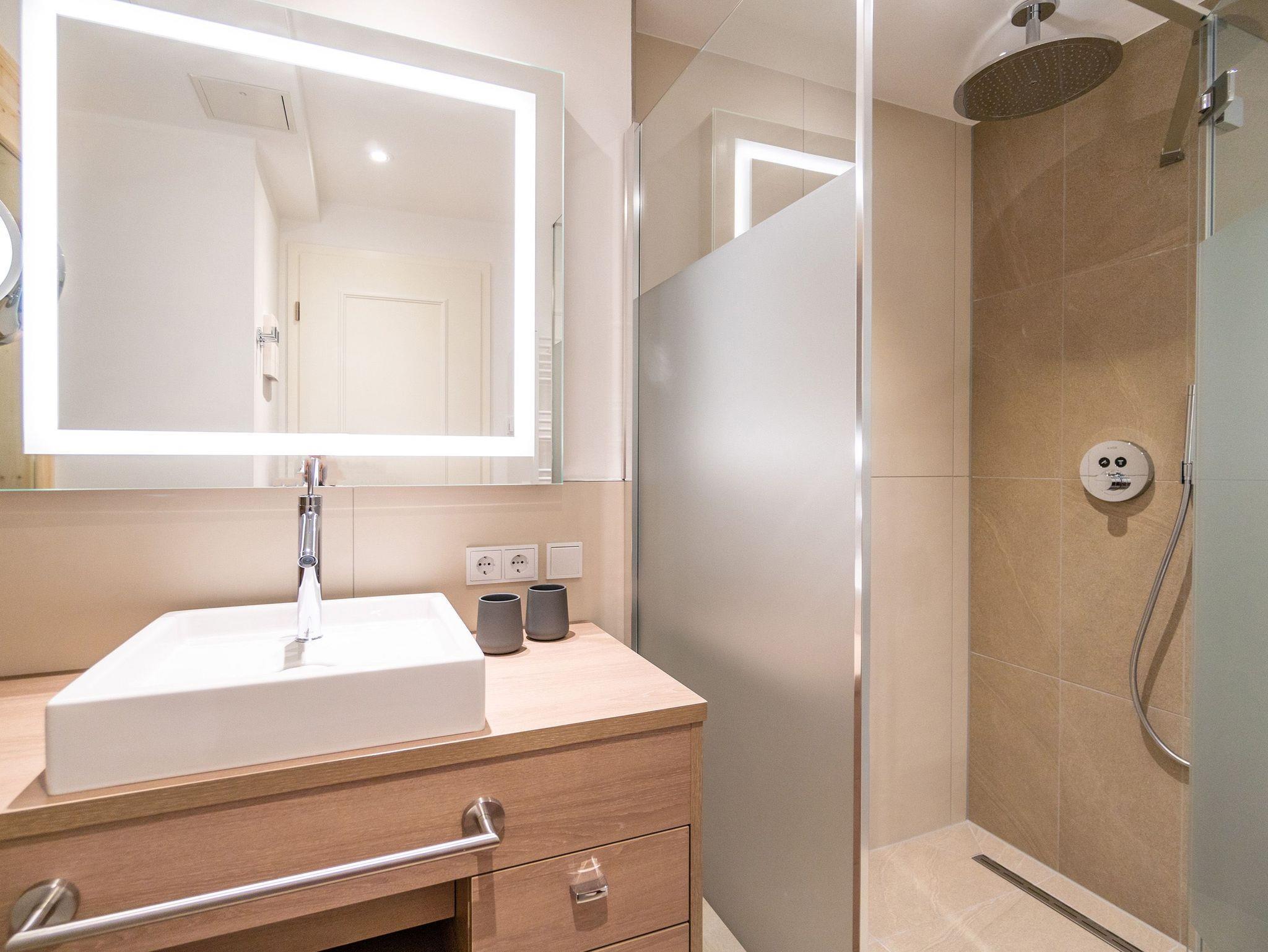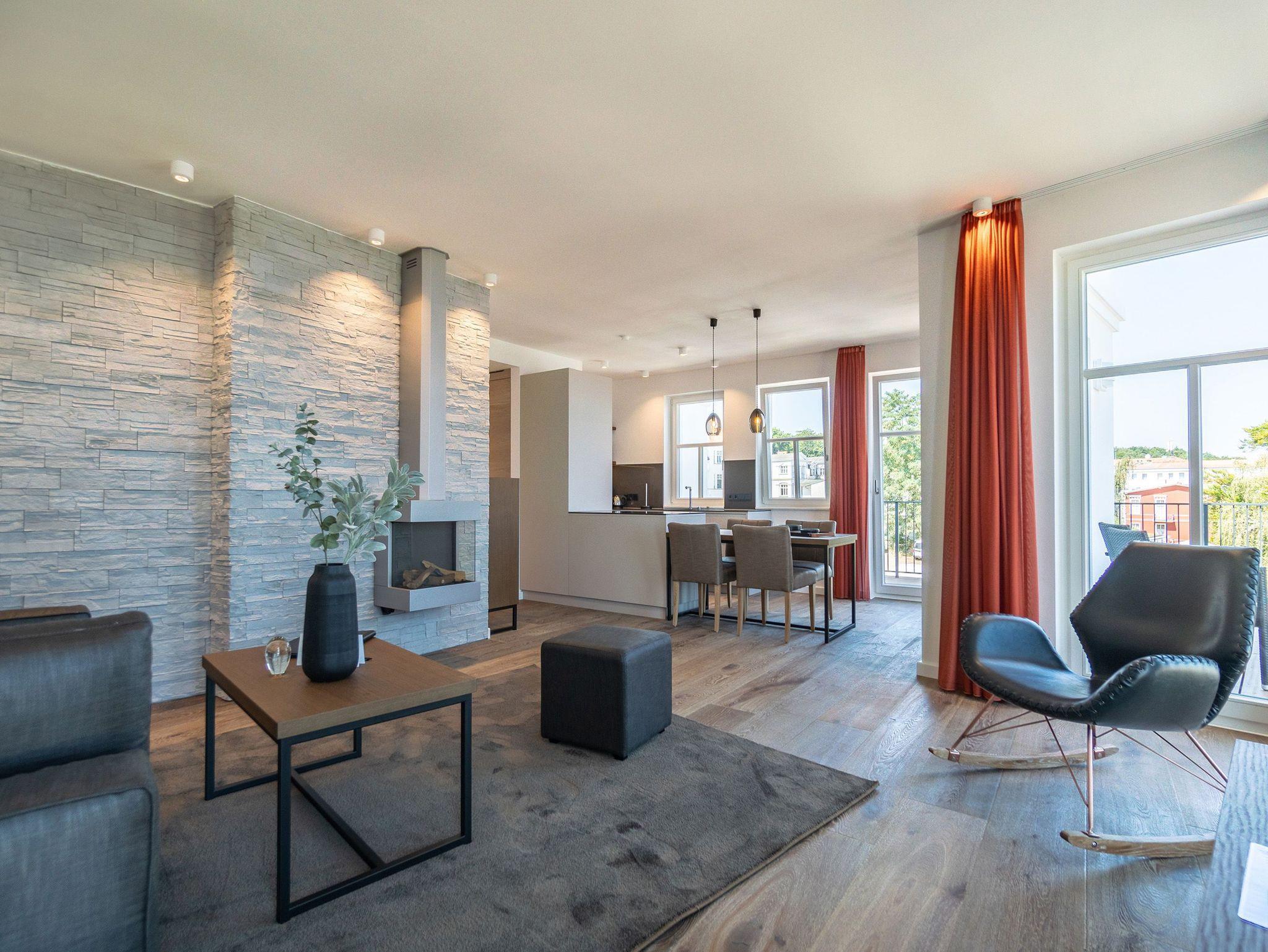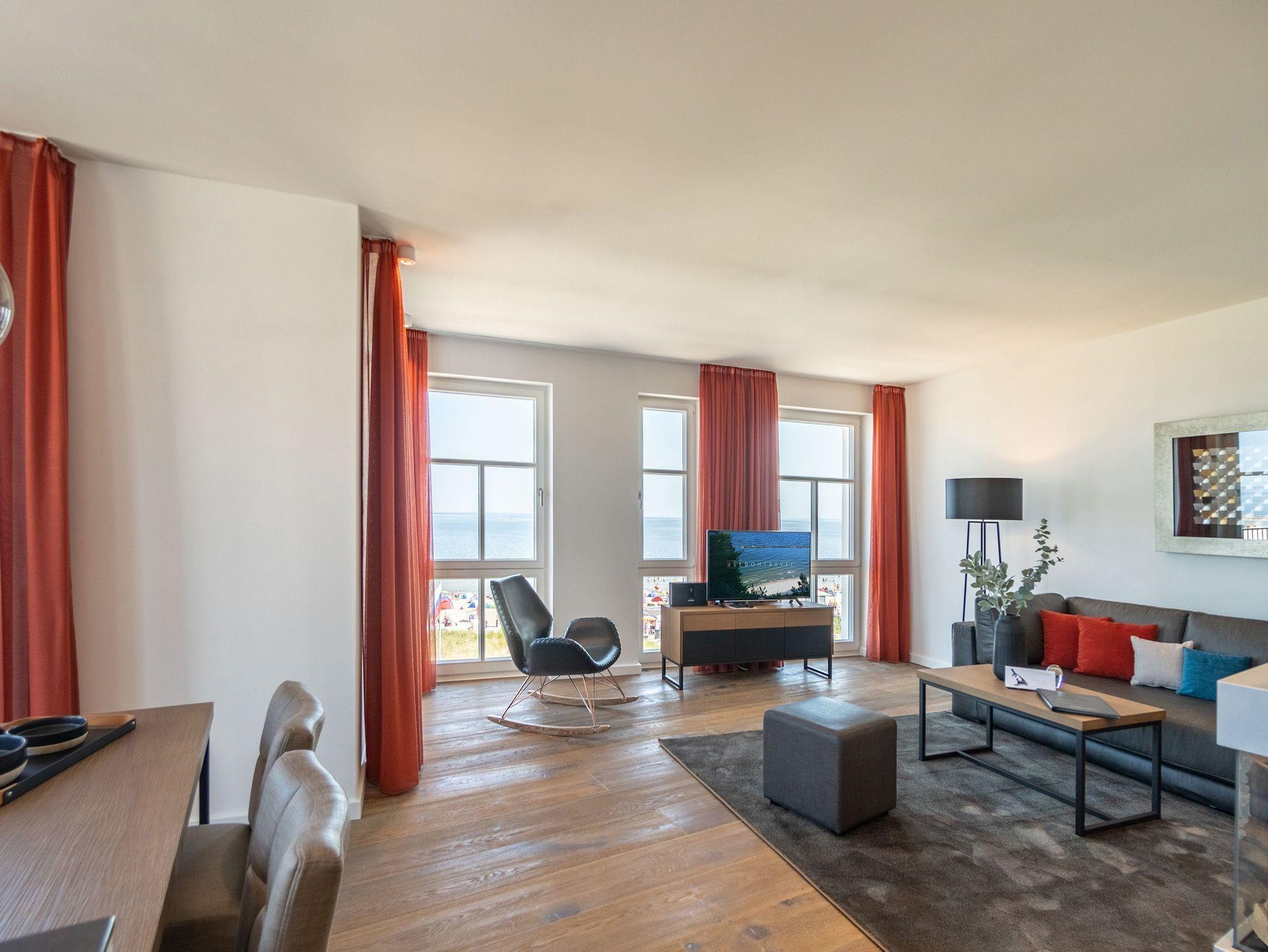 Mehr Meer geht nicht! Denn in dieser wunderschönen und großzügigen, 82 Quadratmeter großen Ferienwohnung in der 3. Etage des Beachhouse wohnen Sie unmittelbar am Meer. Bis zu vier Ostsee-Sehnsüchtige und ein Kleinkind bis drei Jahre (im Kinderreisebett) haben hier direkten Blick auf das endlose Blau. Auf dem umlaufenden Balkon (14 Quadratmeter groß) mit Nord-West-Ausrichtung können Sie die Ostsee sehen, riechen, fühlen ? einfach mit allen Sinnen genießen. Ein Urlaubsparadies der Extraklasse erwartet Sie mit allem Wohnkomfort, den Sie sich nur wünschen können. Die drei Räume sind elegant und zeitlos von Designerhand eingerichtet. Ein geräumiges Wohn-Esszimmer ist der Mittelpunkt des Domizils. Licht und hell besticht es durch seine großen, bodentiefen Fenster und die stylische Einrichtung. Der dezent lachsfarbene Akzent wirkt harmonisierend. Ein Sofa und ein bequemer Schaukelstuhl laden zum Faulenzen und Relaxen vor dem Flat-TV oder dem Flammenspiel des Gas-Kamins ein. Eine Bose-Musik-Anlage mit Bluetooth sorgt für einwandfreien Sound. Das WLAN ist kostenfrei. Der Esstisch mit den vier Stühlen ist bestens für gemeinsame Essen geeignet. Leckere Gerichte kochen, das geht in der offenen Küche ganz einfach. Vollausgestattet birgt sie sämtliche Geräte, die man für die Zubereitung feiner Speisen oder leckerer Brunches brauchen kann. Ob Geschirrspüler, Herd, Backofen oder Kaffeemaschine ? alle sind hochwertige Markengeräte. In den Schränken befindet sich zudem edles Geschirr. Die Liebe zum Detail ist in allen Ecken dieser Wohnung spürbar ? im Lampendesign genauso wie in den Accessoires. Und überall haben Sie die Ostsee im Blick. In den beiden Schlafzimmern warten komfortable Boxspringdoppelbetten (1,80 m x 2,00 m) darauf, Ihnen süße Träume zu schenken. Beide Schlafzimmer verfügen über einen Flat-TV und einen Schrank mit viel Ablagefläche. Das Masterbad ist mit einer Finnischen Sauna ausgestattet. Hier können Sie ganz privat abschalten und mal so richtig ins Schwitzen kommen. Außerdem gibt es eine Regendusche, einen Waschtisch mit Fön und beleuchtetem Spiegel sowie ein WC. Das zweite Badezimmer verfügt ebenfalls über eine ebenerdige und geräumige Regendusche, einen Waschtisch und ein WC. In einem separaten Hauswirtschaftsraum steht ein Waschtrockner zu Ihrer Verfügung. Für eine entspannte Auszeit sind die Betten bei Ihrer Ankunft bezogen und Handtücher liegen bereit. Für Ihr Auto ist der Stellplatz Nr. 19 in der Tiefgarage reserviert.