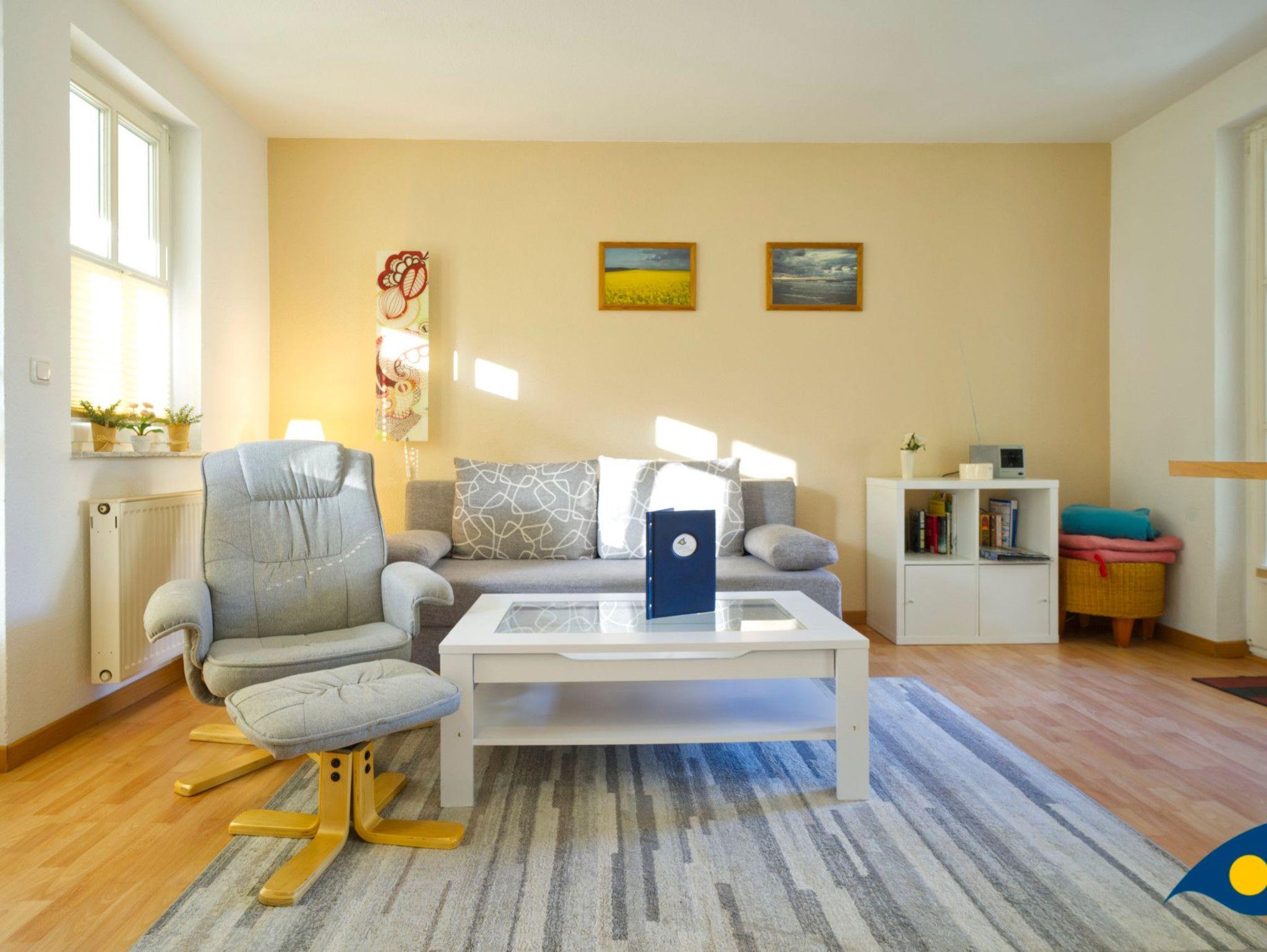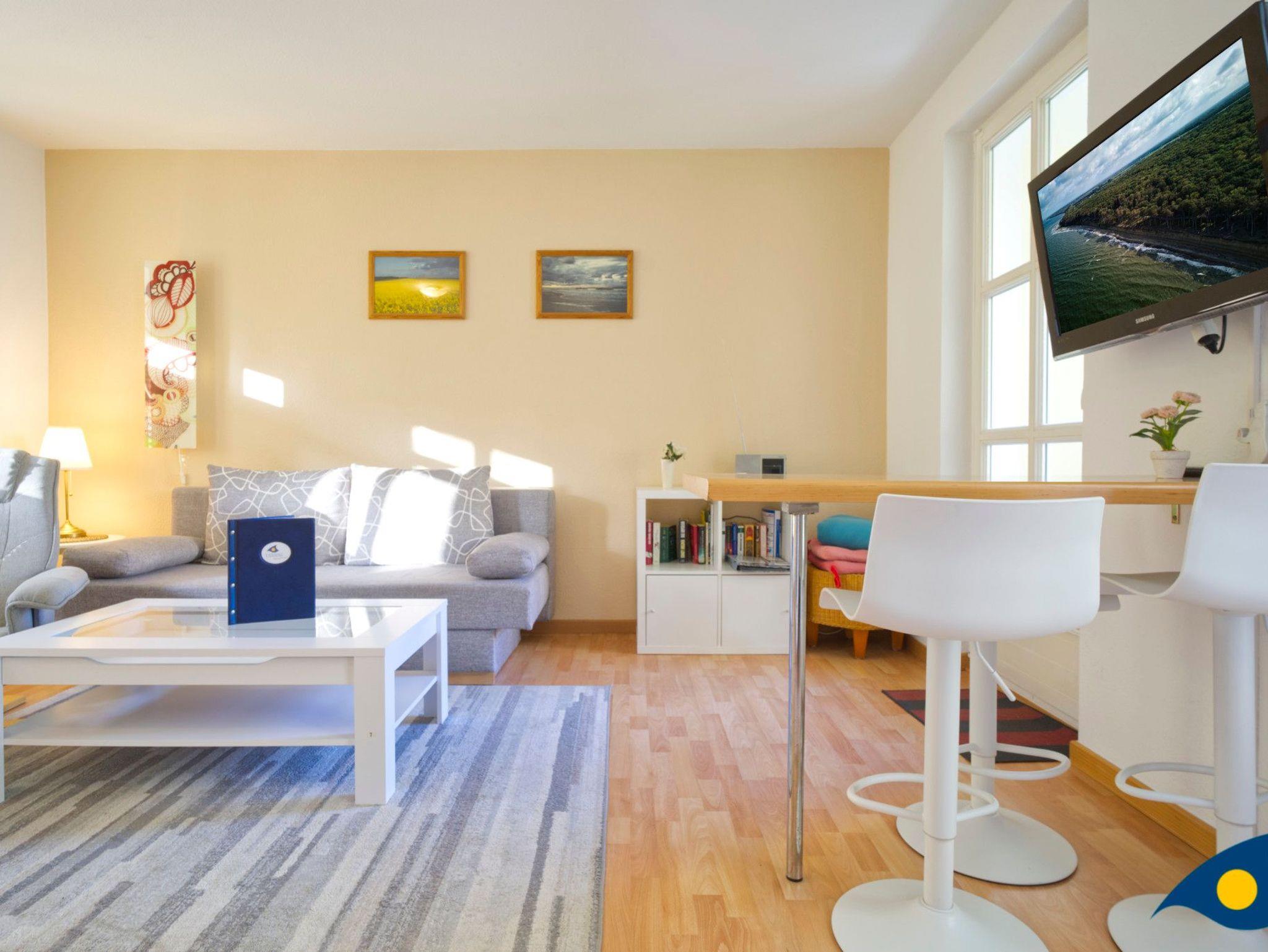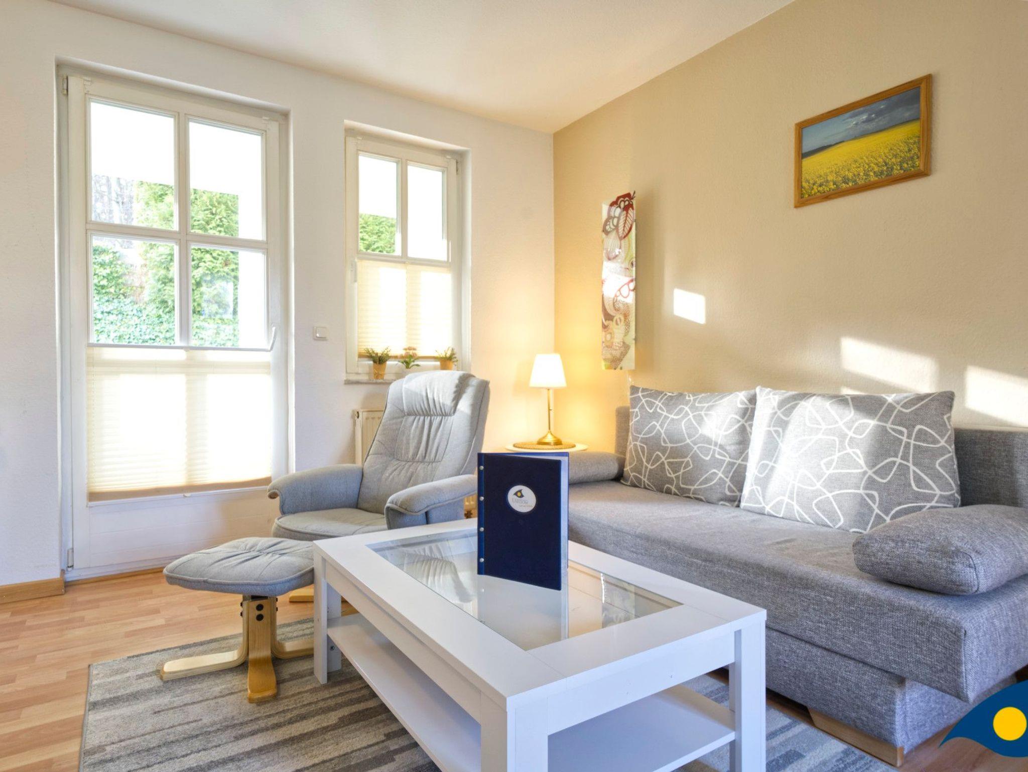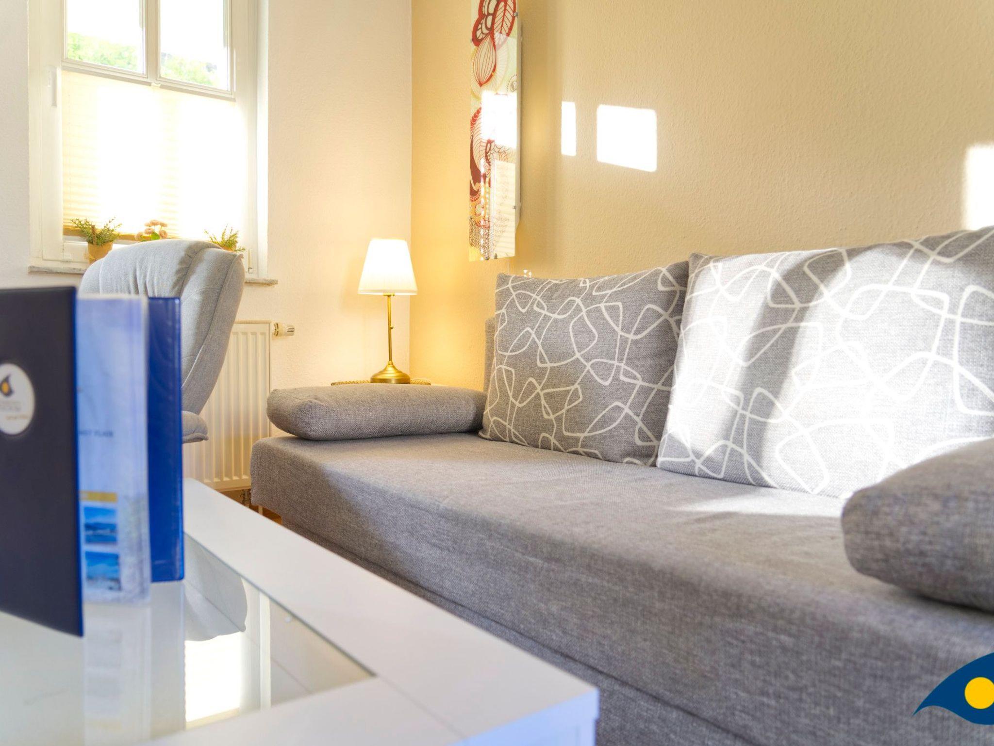 Der mit hellen, freundlichen Möbeln eingerichtete Wohnraum bietet mit einer gemütlichen Schlafcouch eine Schlafmöglichkeit für eine dritte Person.
