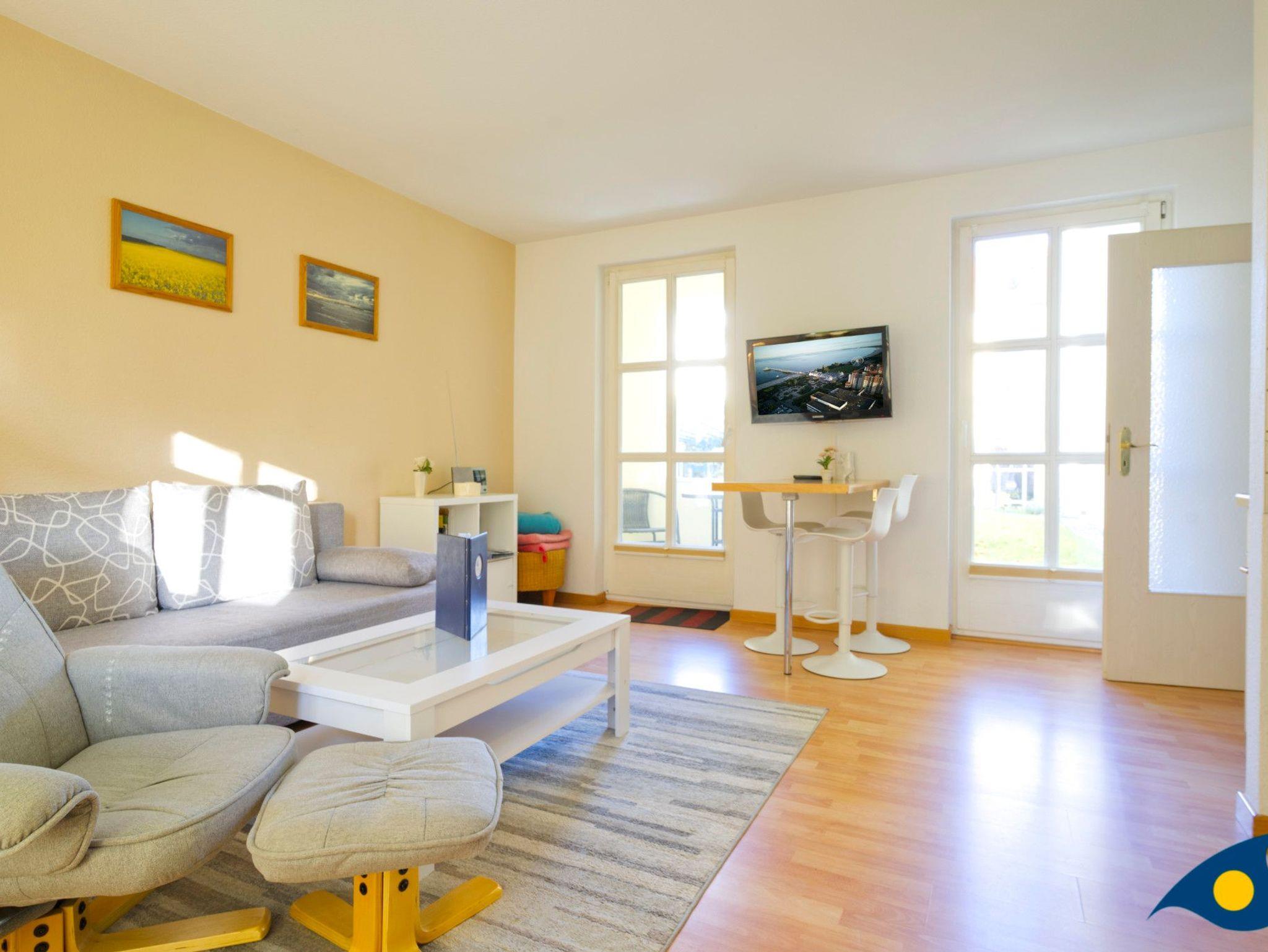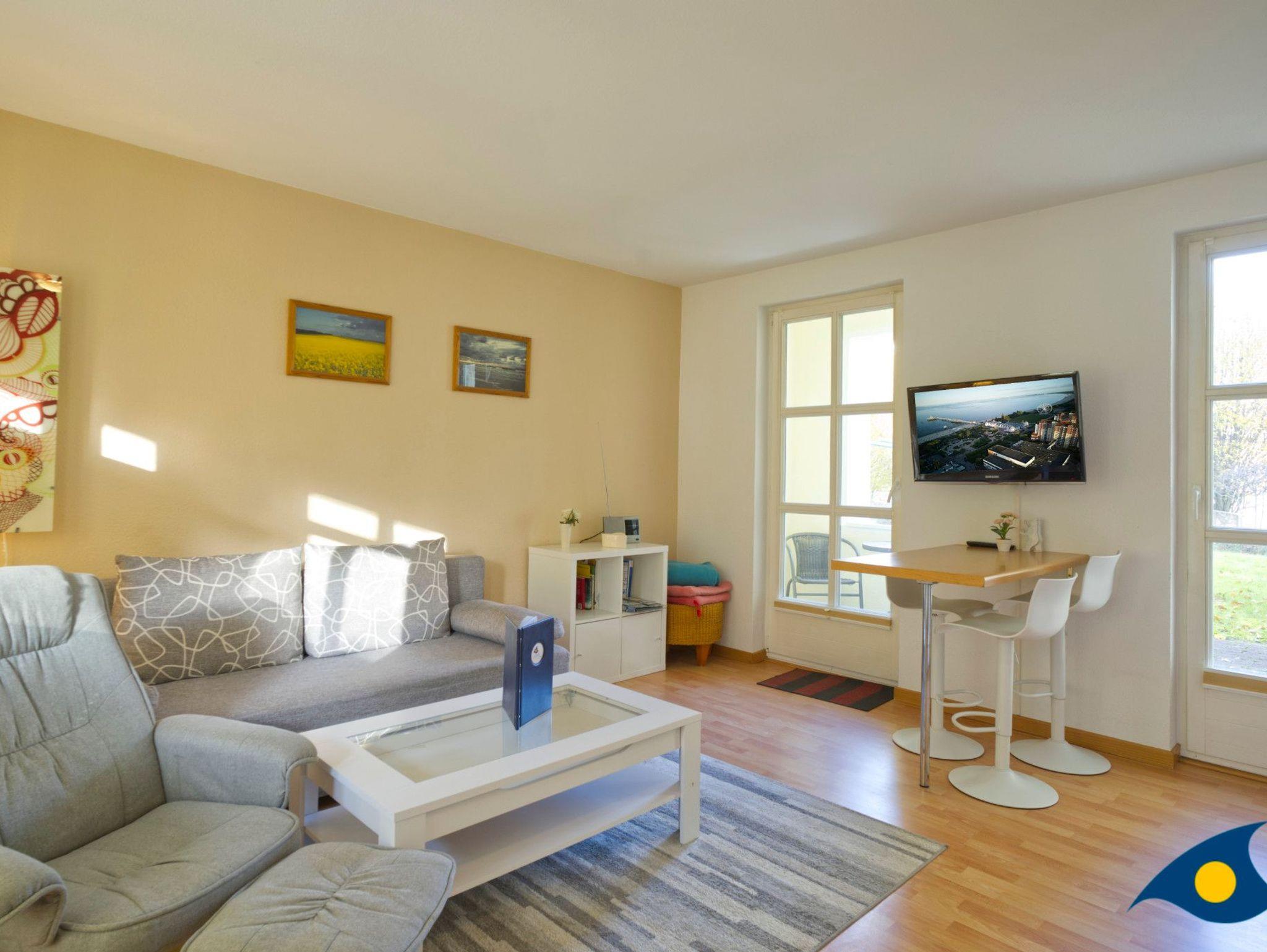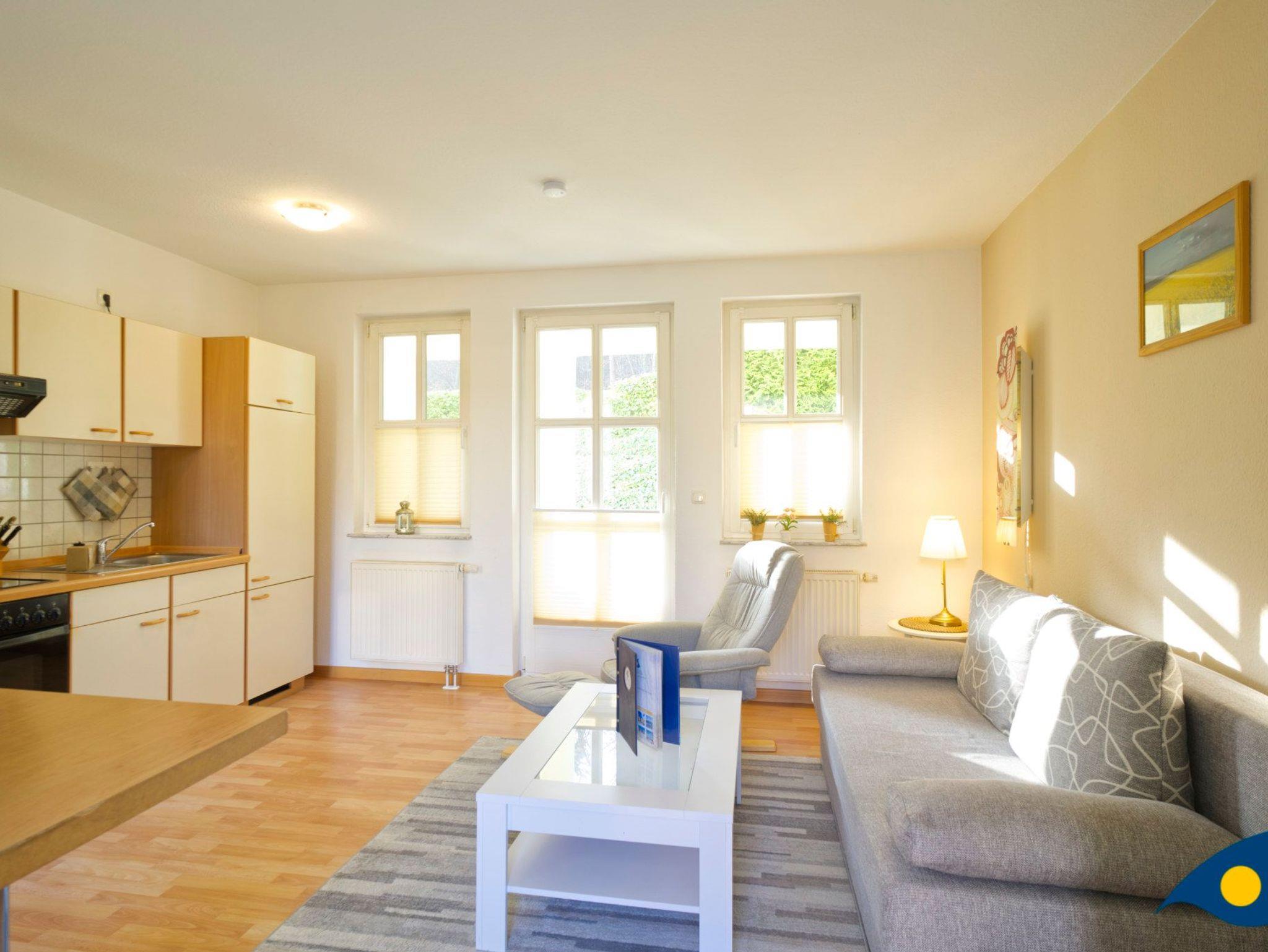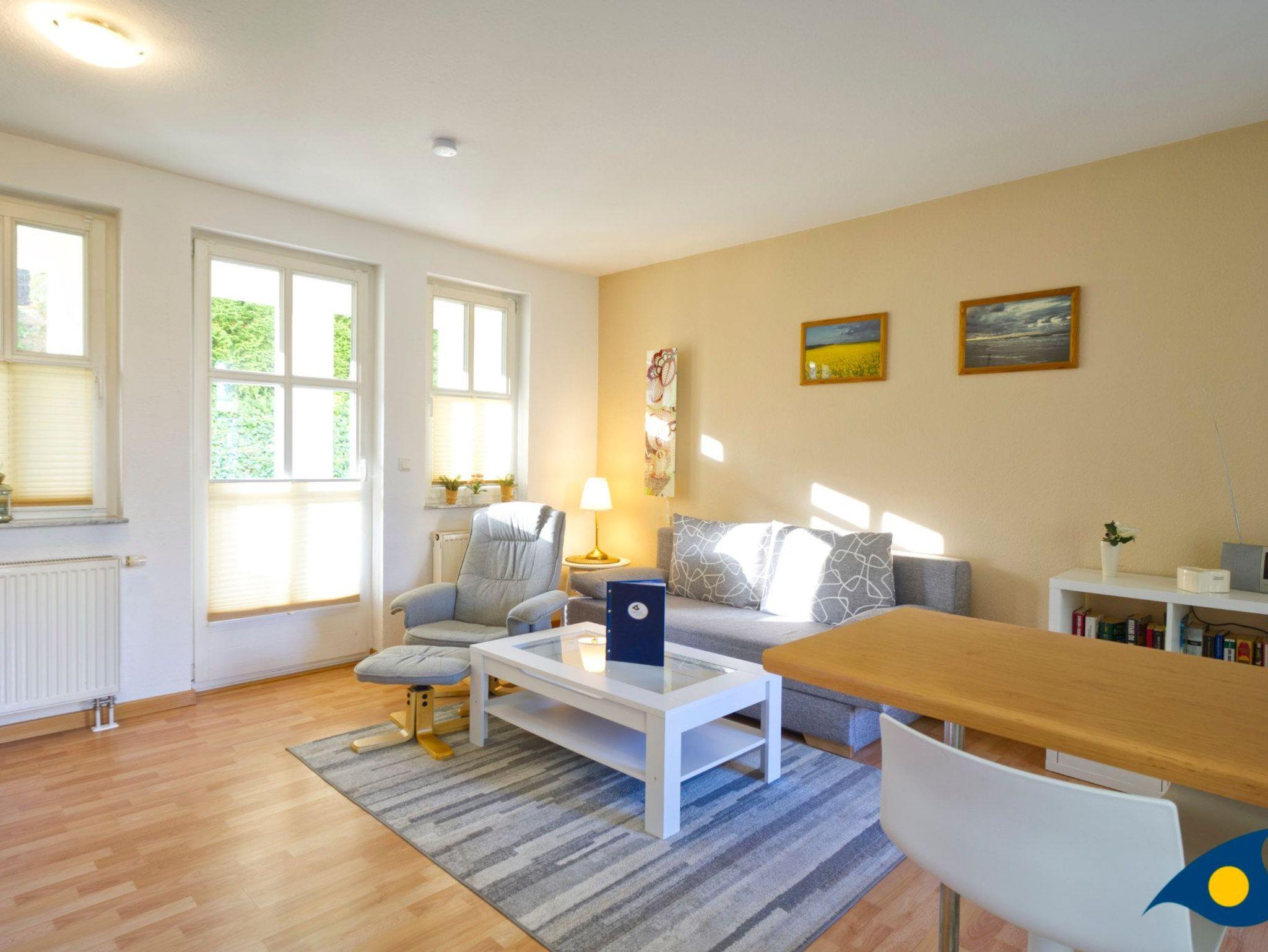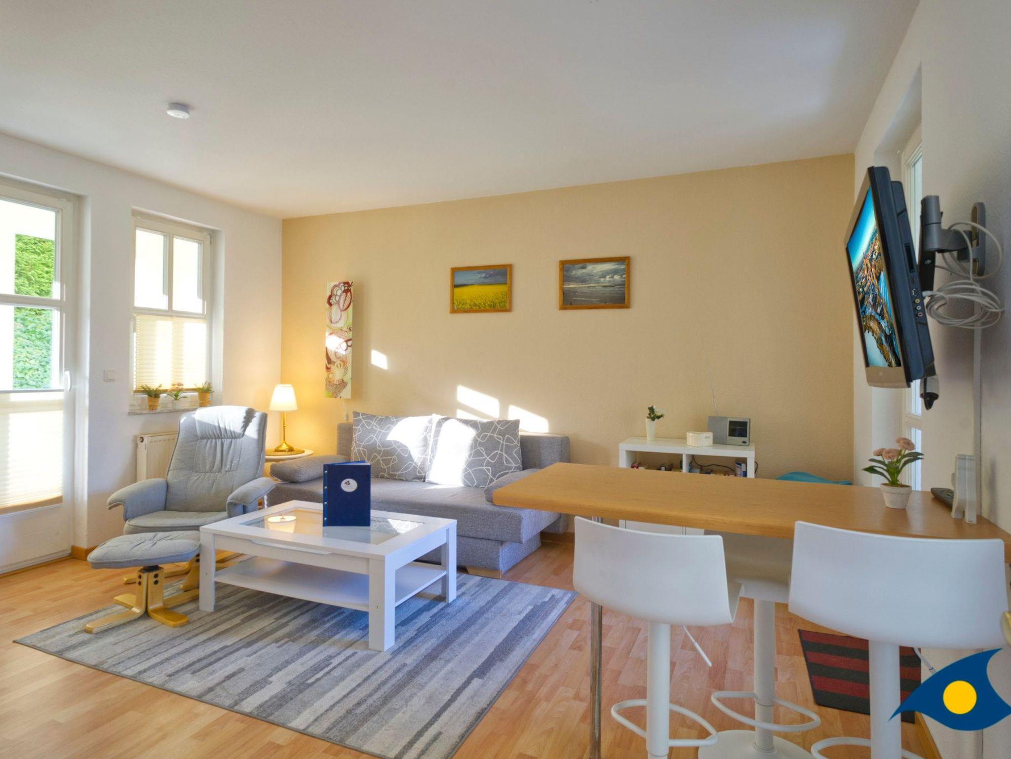 Der mit hellen, freundlichen Möbeln eingerichtete Wohnraum bietet mit einer gemütlichen Schlafcouch eine Schlafmöglichkeit für eine dritte Person.