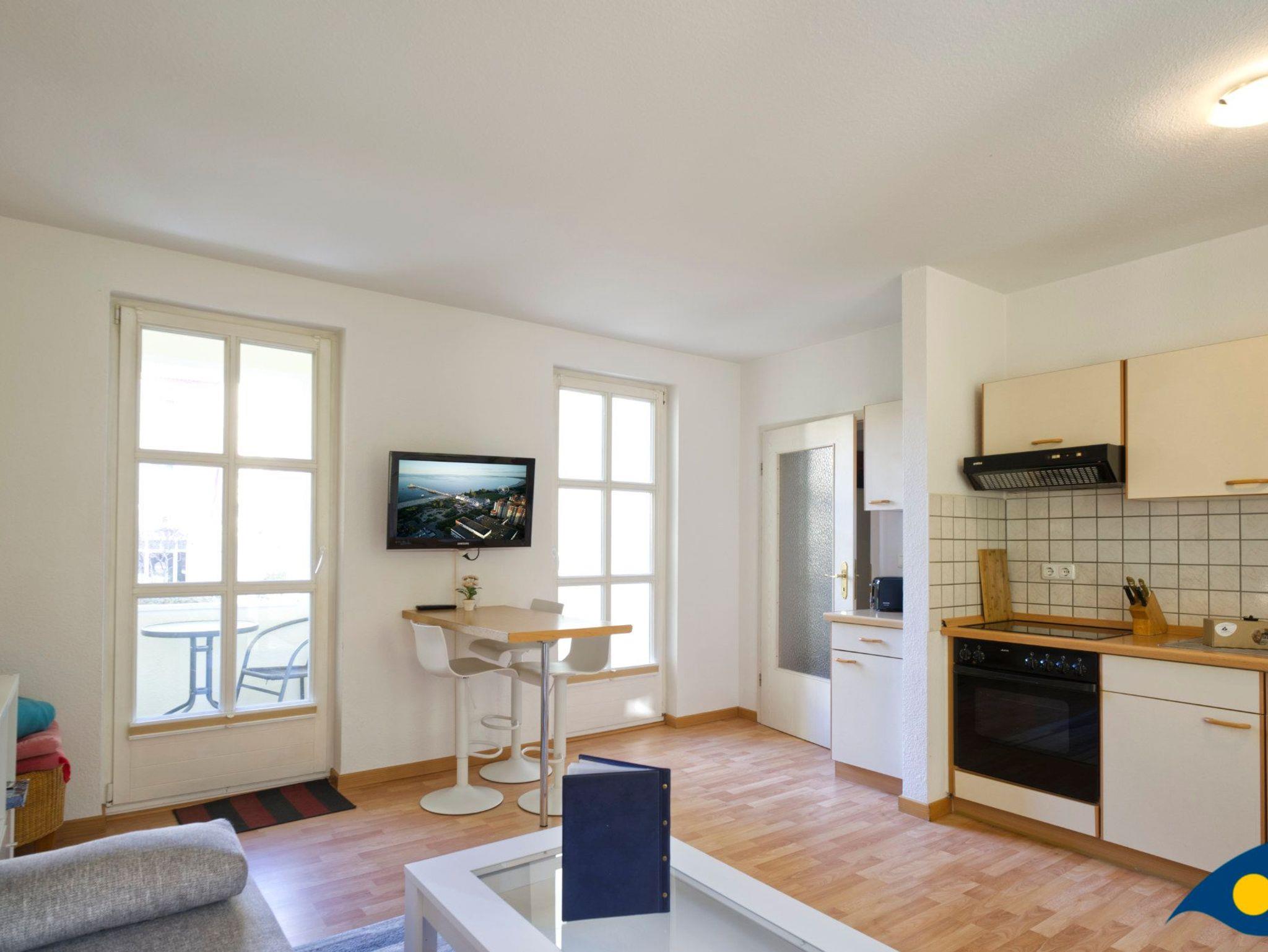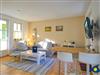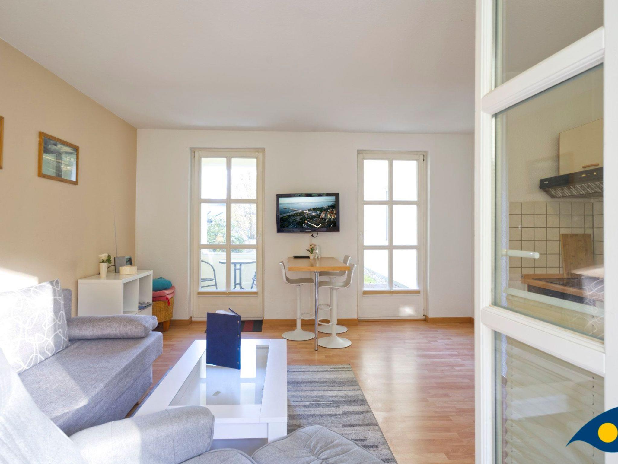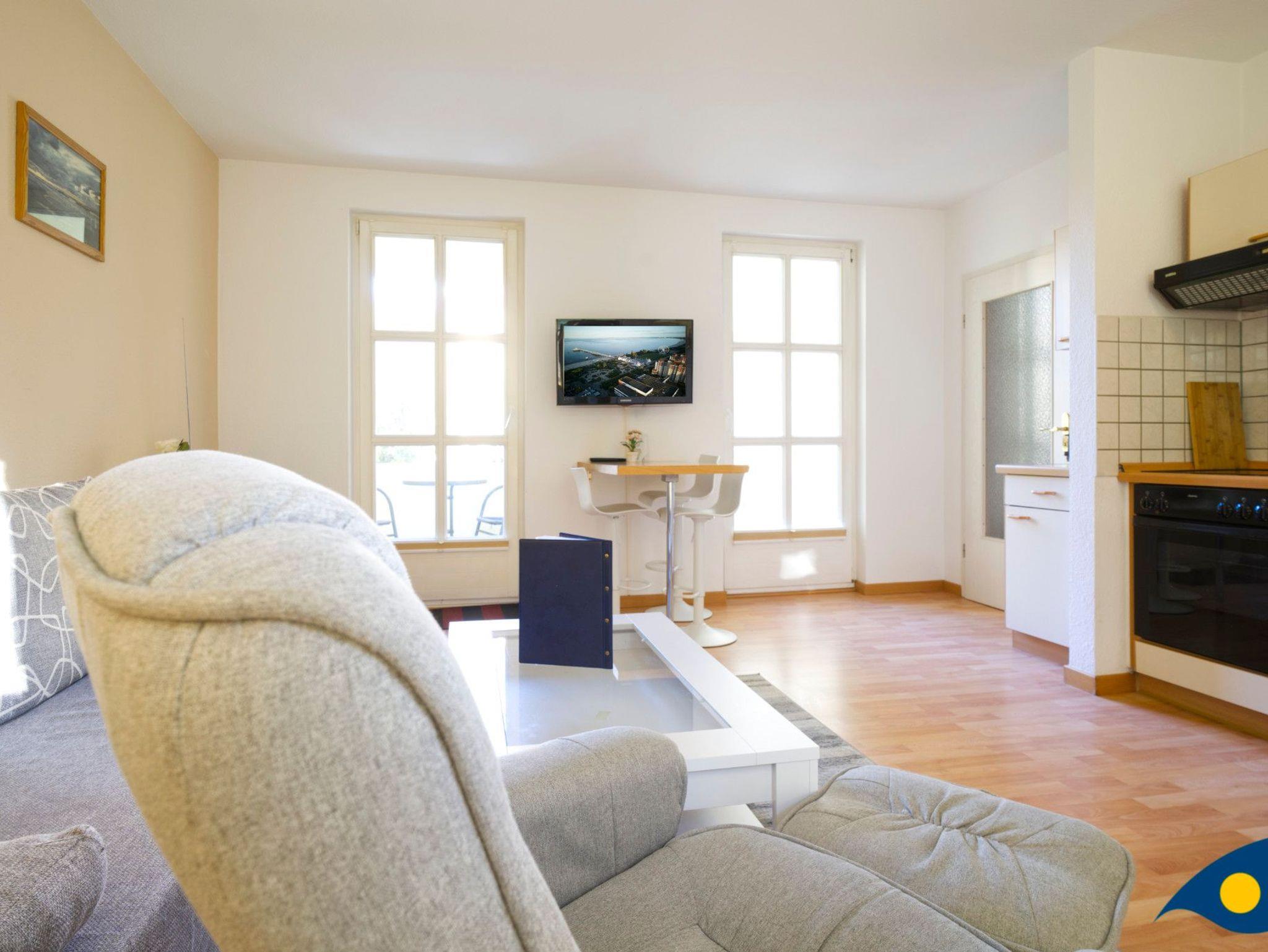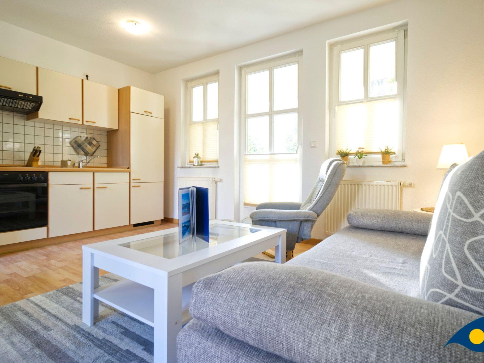 Der mit hellen, freundlichen Möbeln eingerichtete Wohnraum bietet mit einer gemütlichen Schlafcouch eine Schlafmöglichkeit für eine dritte Person.