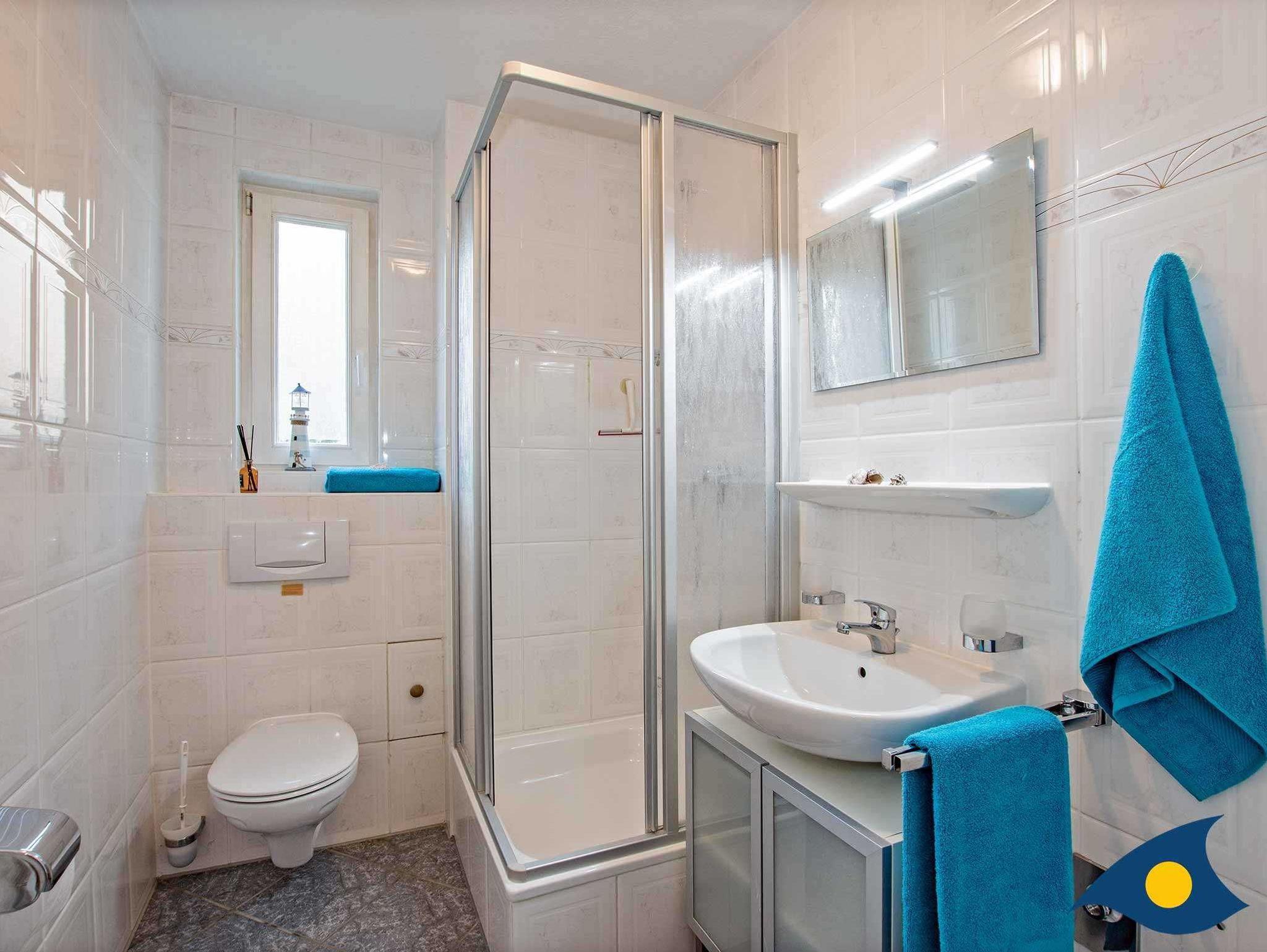Das kleine, aber modern eingeichtete Badezimmer ist mit einer Dusche ausgestattet.