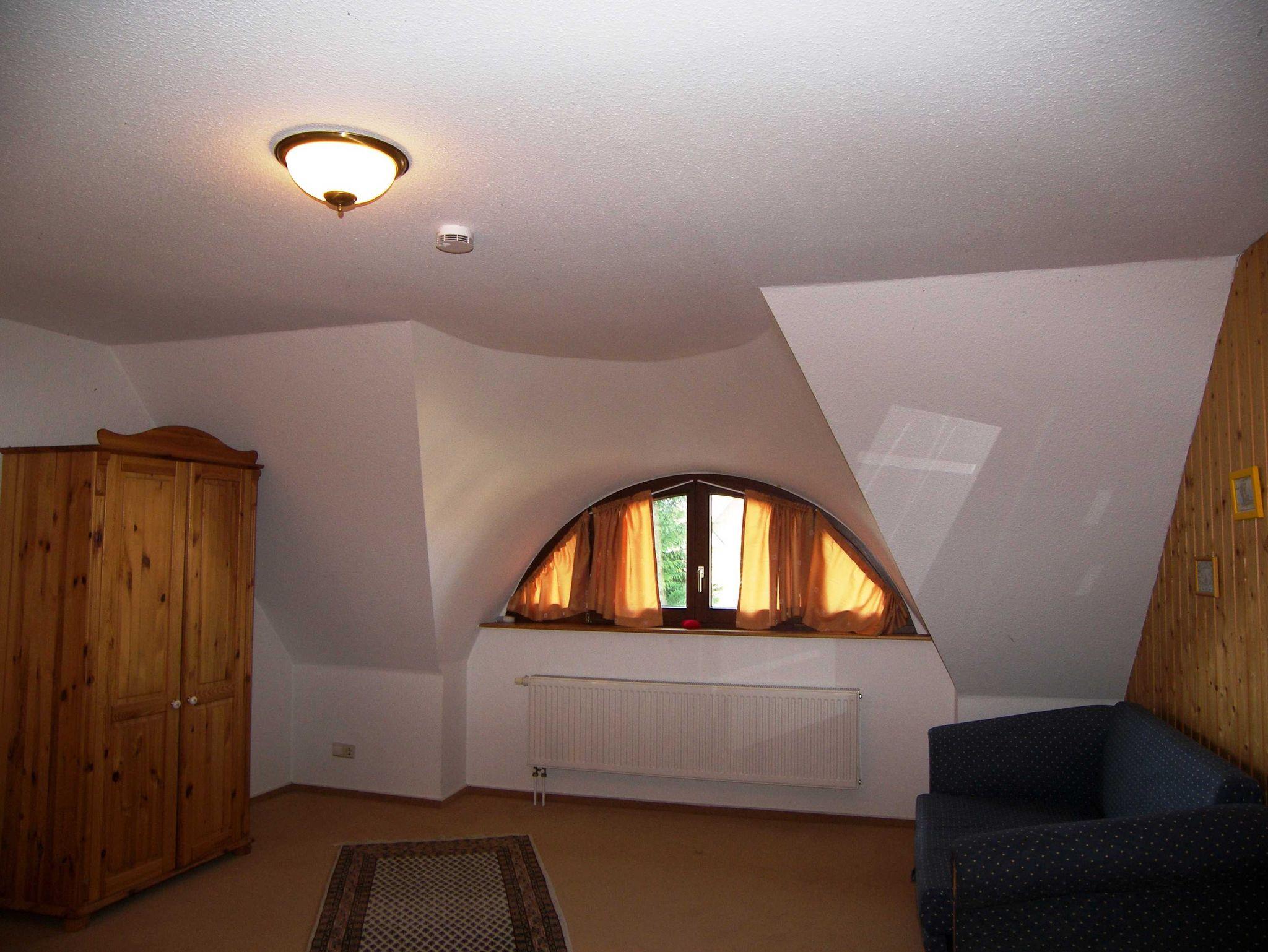 Im Obergeschoss befindet sich das Schlafzimmer mit einem Doppelbett und einer Schlafcouch, die als Aufbettungsmöglichkeiten für die zwei Kinder bis maximal 14 Jahren dient. Das Schlafzimmer ist nicht durch eine Tür vom Wohnbereich abgetrennt.