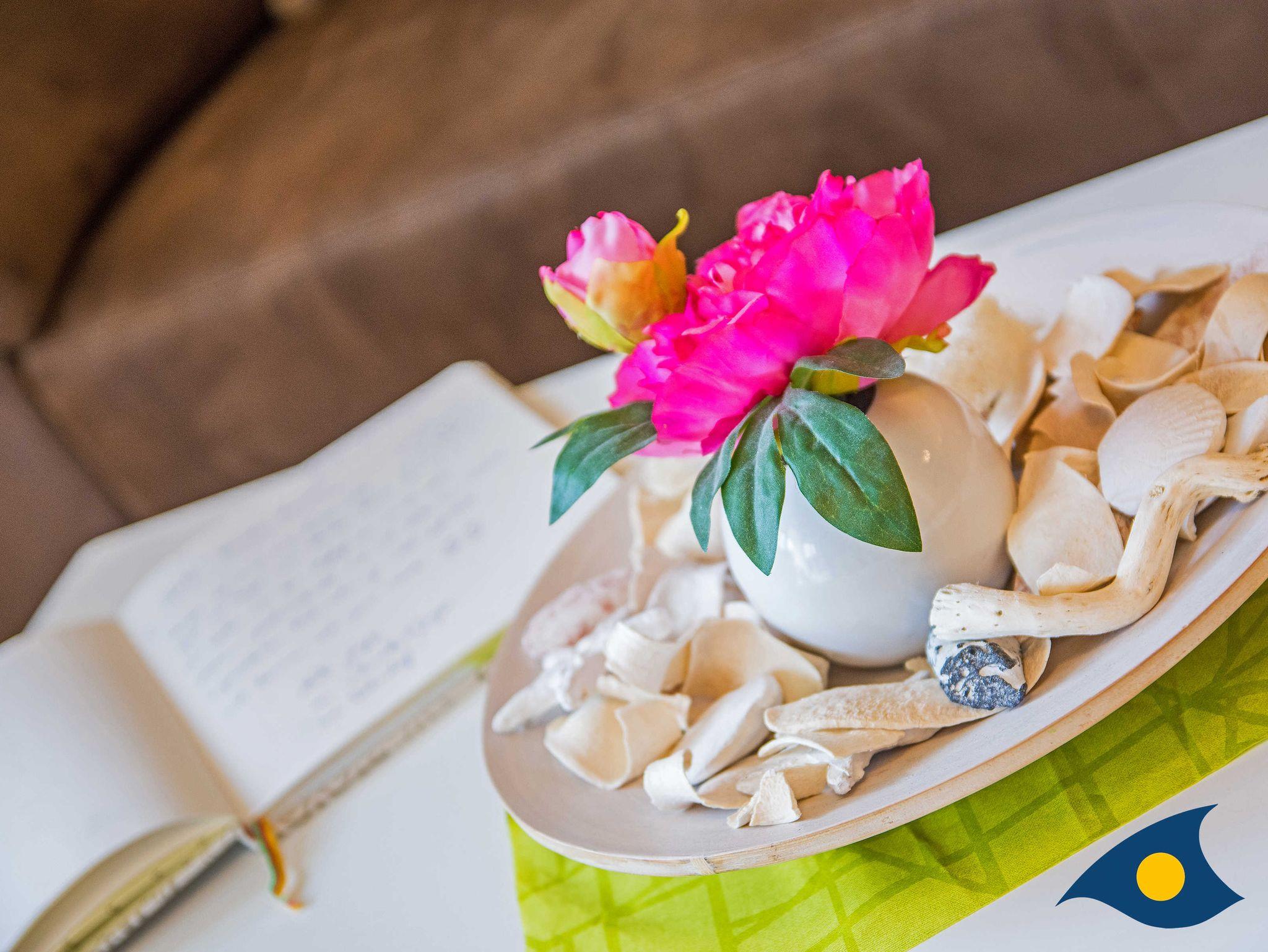 Modern, liebevoll und gemütlich ausgestattet begrüßt Sie diese herrliche 2-Raum-Ferienwohnung. Das Wohnzimmer mit dem bequemen Sofa, der großen Fensterfront und der offenen Küche lässt Sie einen traumhaften Urlaub zu Zweit erleben. Der schöne Balkon lädt zum Frühstücken, zum Stöbern in einem schönen Buch oder einem Gläschen Wein ein. Von hier aus reicht der Blick bis zum Meer und zum weißen Sandstrand. Diesen erreichen Sie in 3 Minuten zu Fuß.