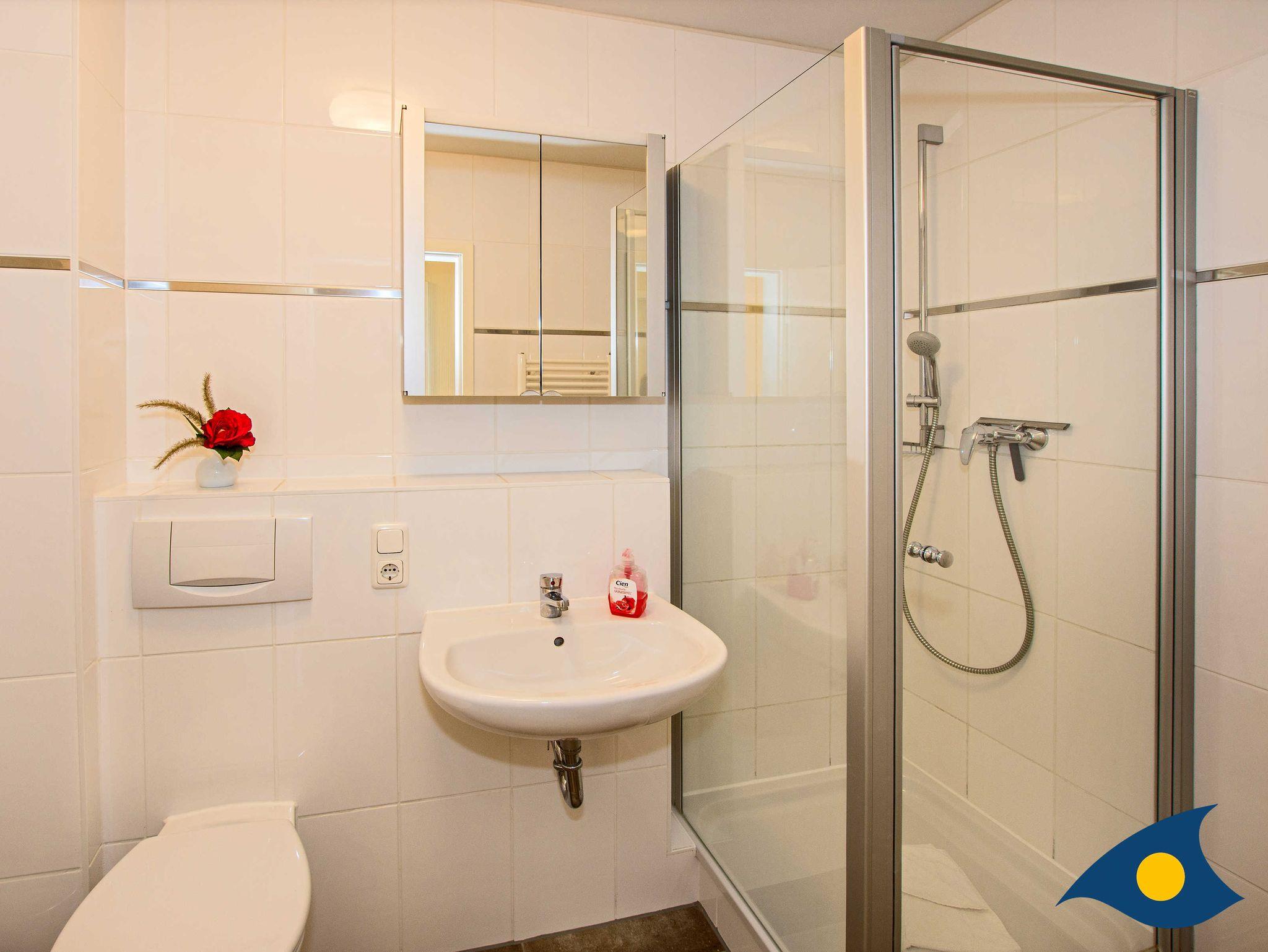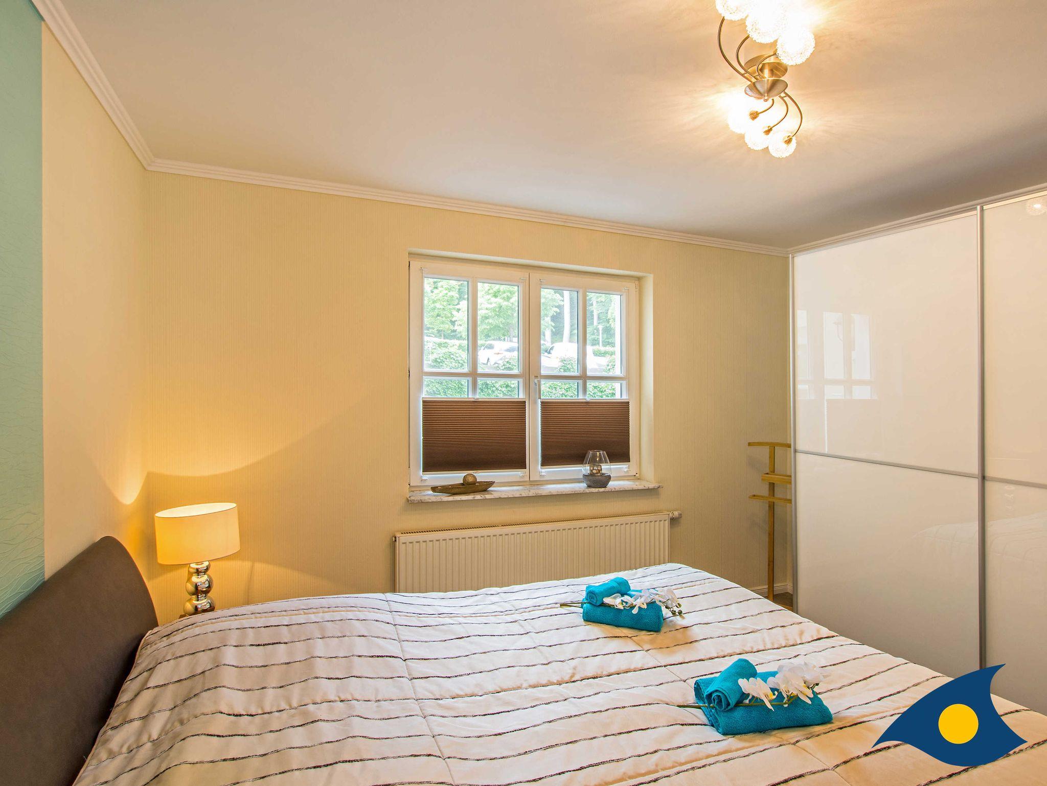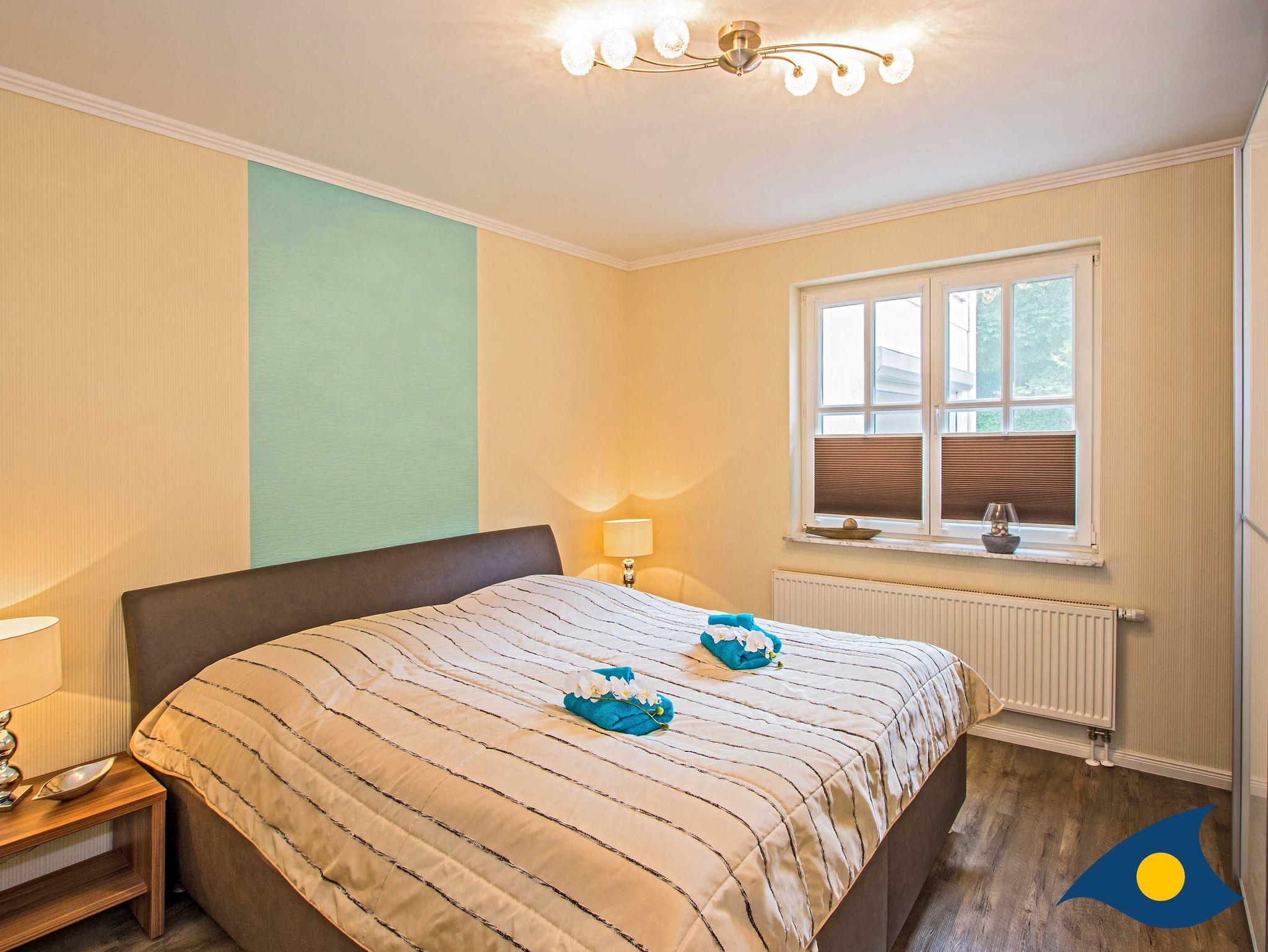 Das Schlafzimmer mit dem gemütlichen Doppelbett und das elegante Badezimmer mit WC und Dusche lassen Ihren Usedom Urlaub perfekt werden.