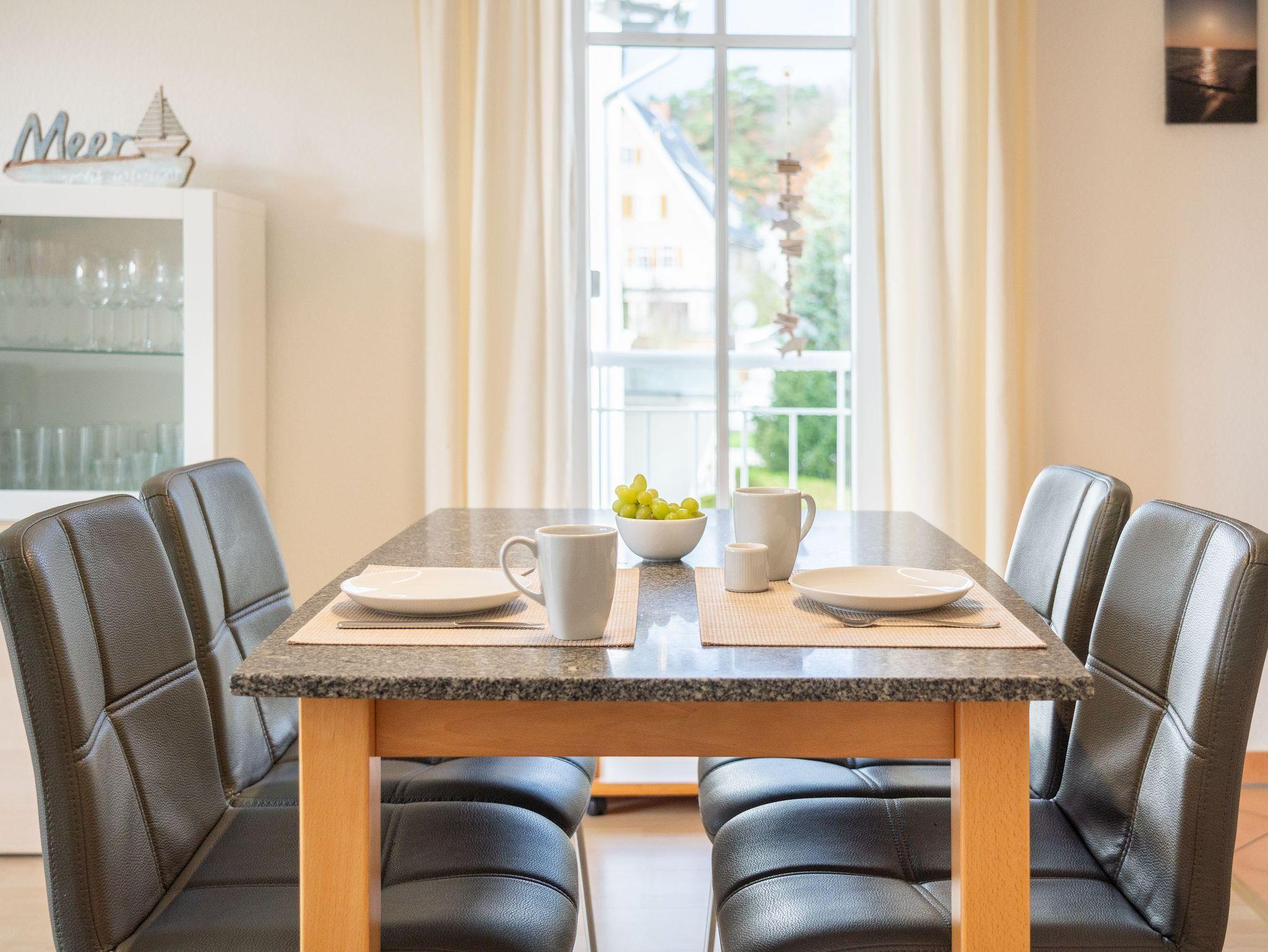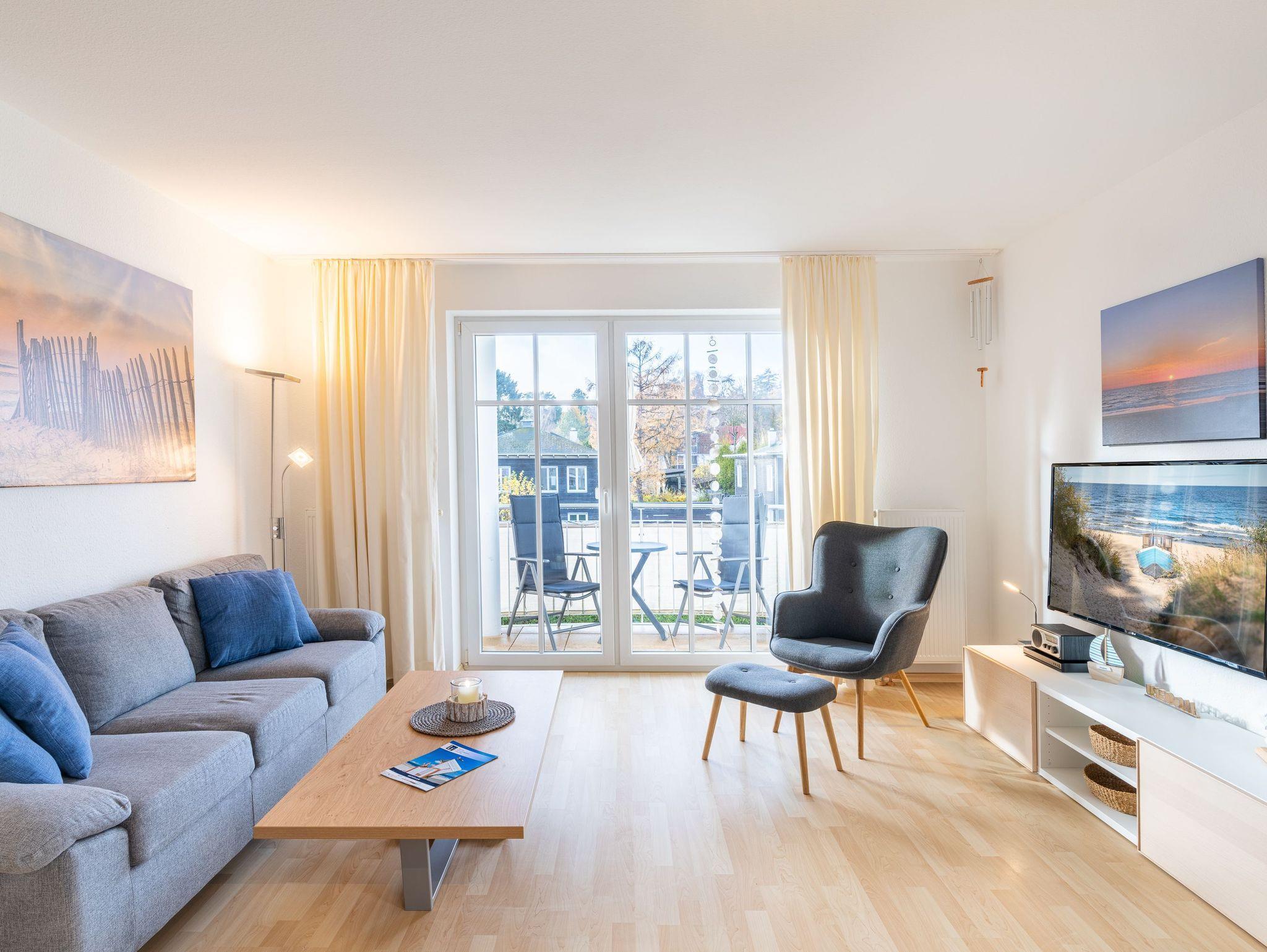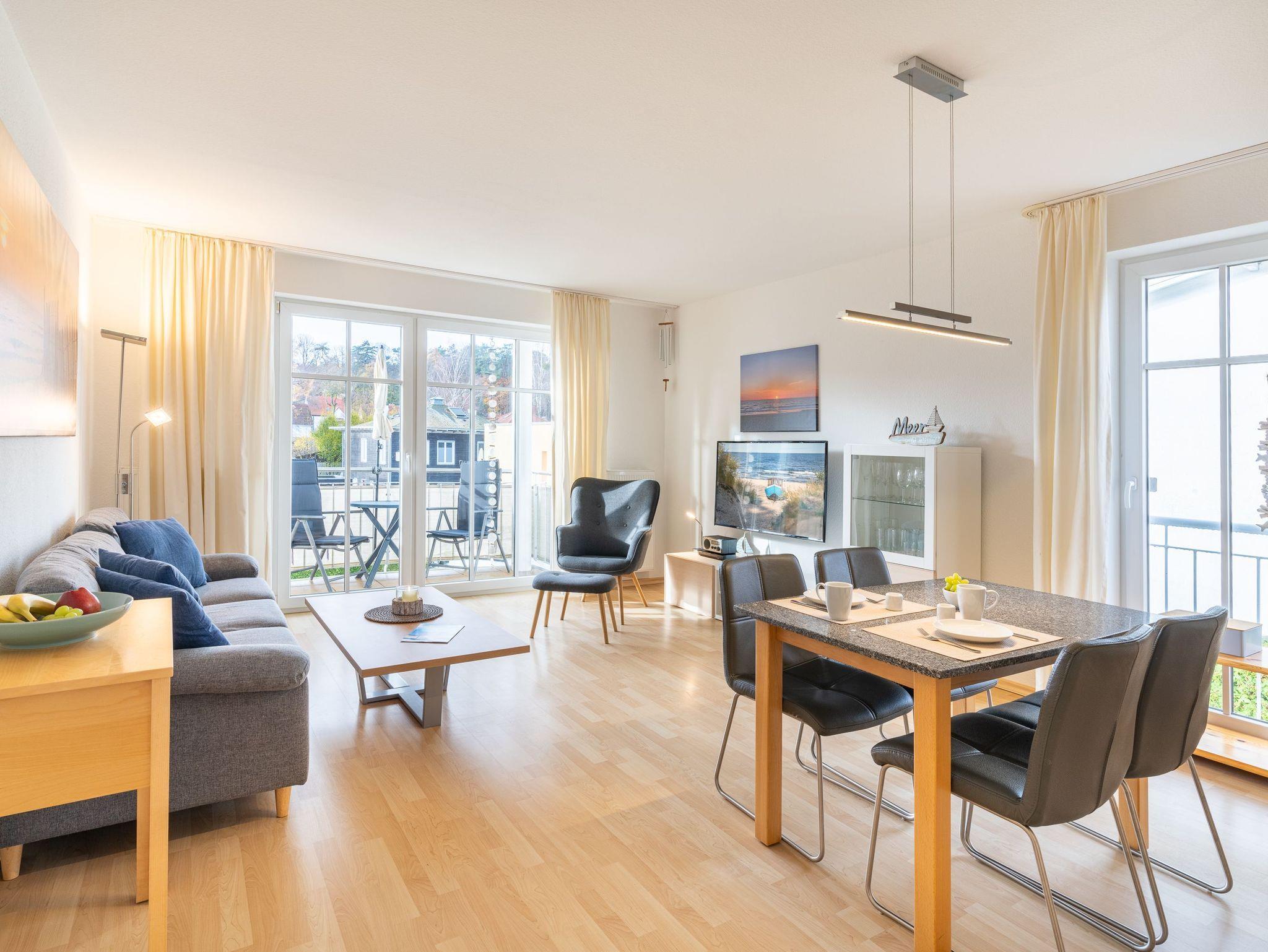 In dem 3-Raum-Appartement im 1. Obergeschoss können bis zu 4 Personen auf 62 Quadratmetern ihre erholsame Urlaubszeit gemeinsam verbringen. Der gemütliche Wohn-, Koch-, und Essbereich ist in warmen Tönen gehalten. Die integrierte Küchenzeile bietet dank Geschirrspüler, Kühlschrank mit Gefrierfach, Backofen, Mikrowelle, Wasserkocher, Toaster, Kaffeemaschine und vielen Extras jeglichen Kochkomfort. Ein bequemes Sofa, ein Sessel, Flat TV sowie ein Esstisch für vier Personen laden zum Entspannen und geselligem Beisammensein ein.