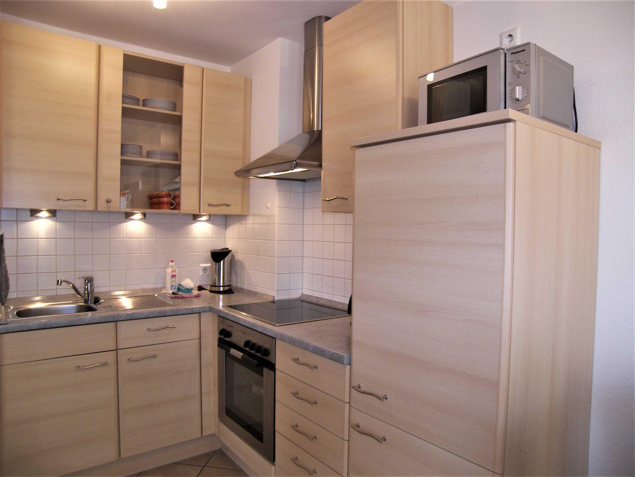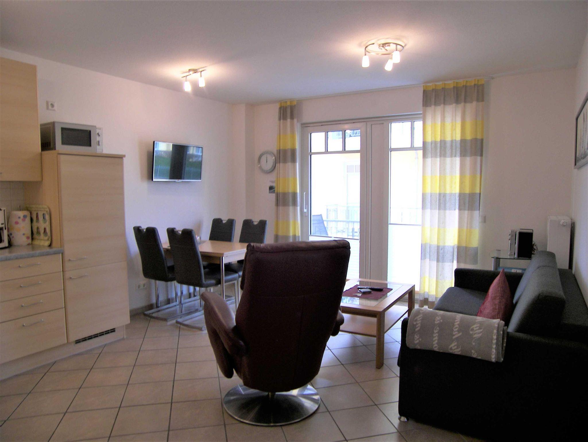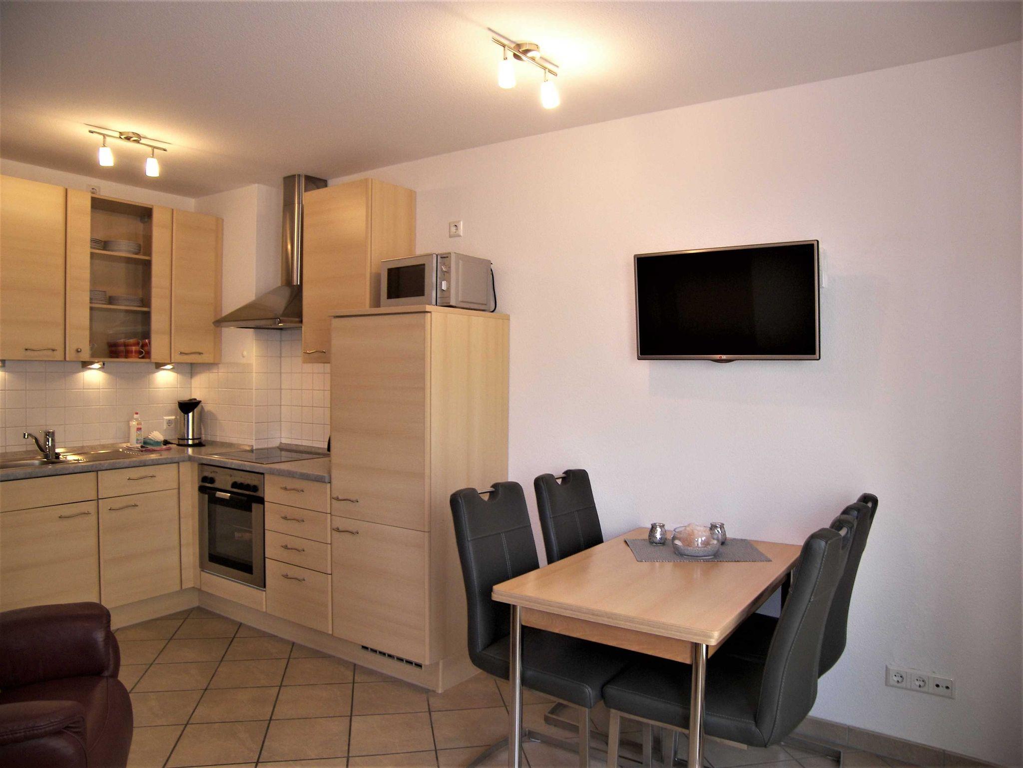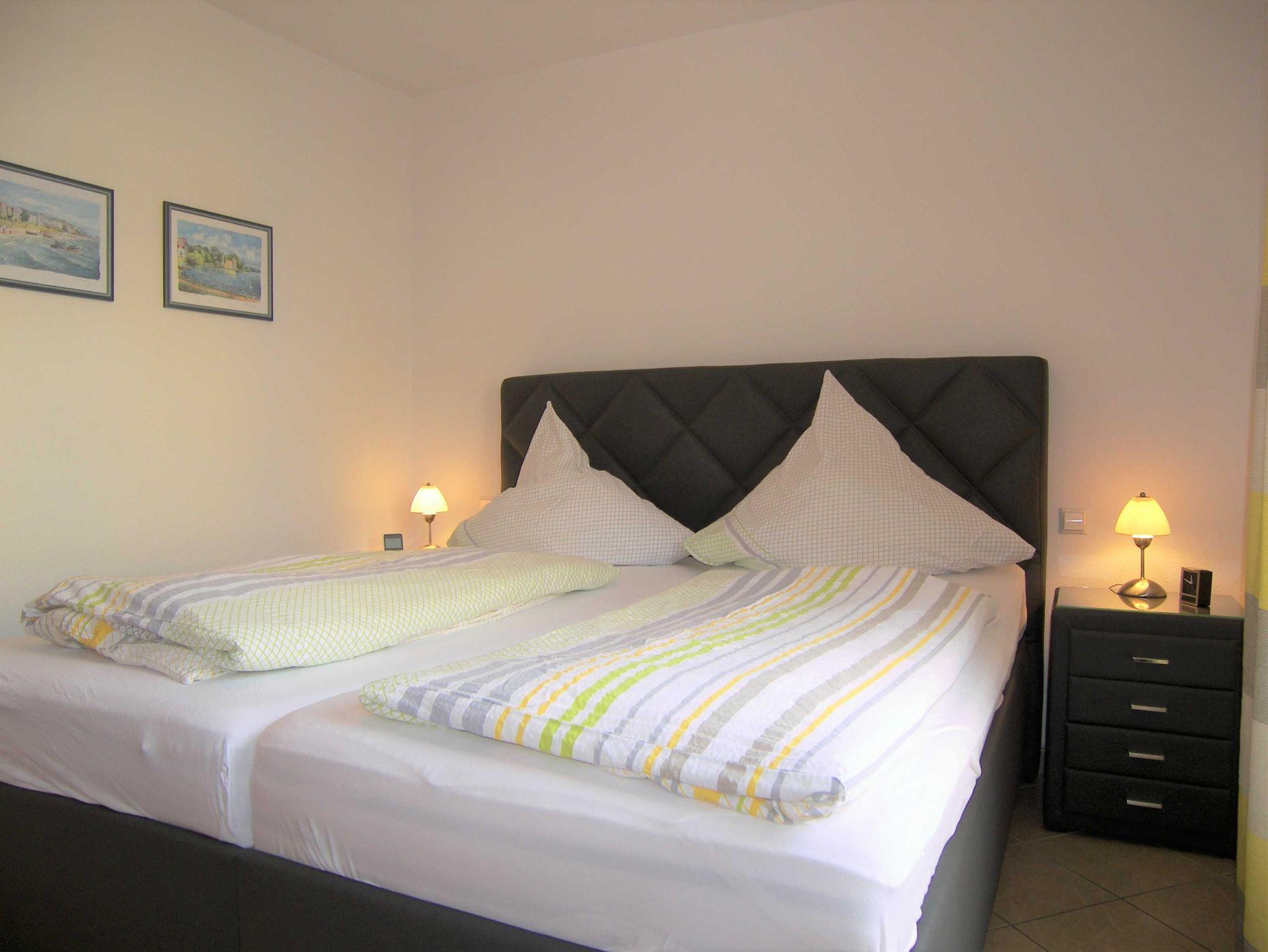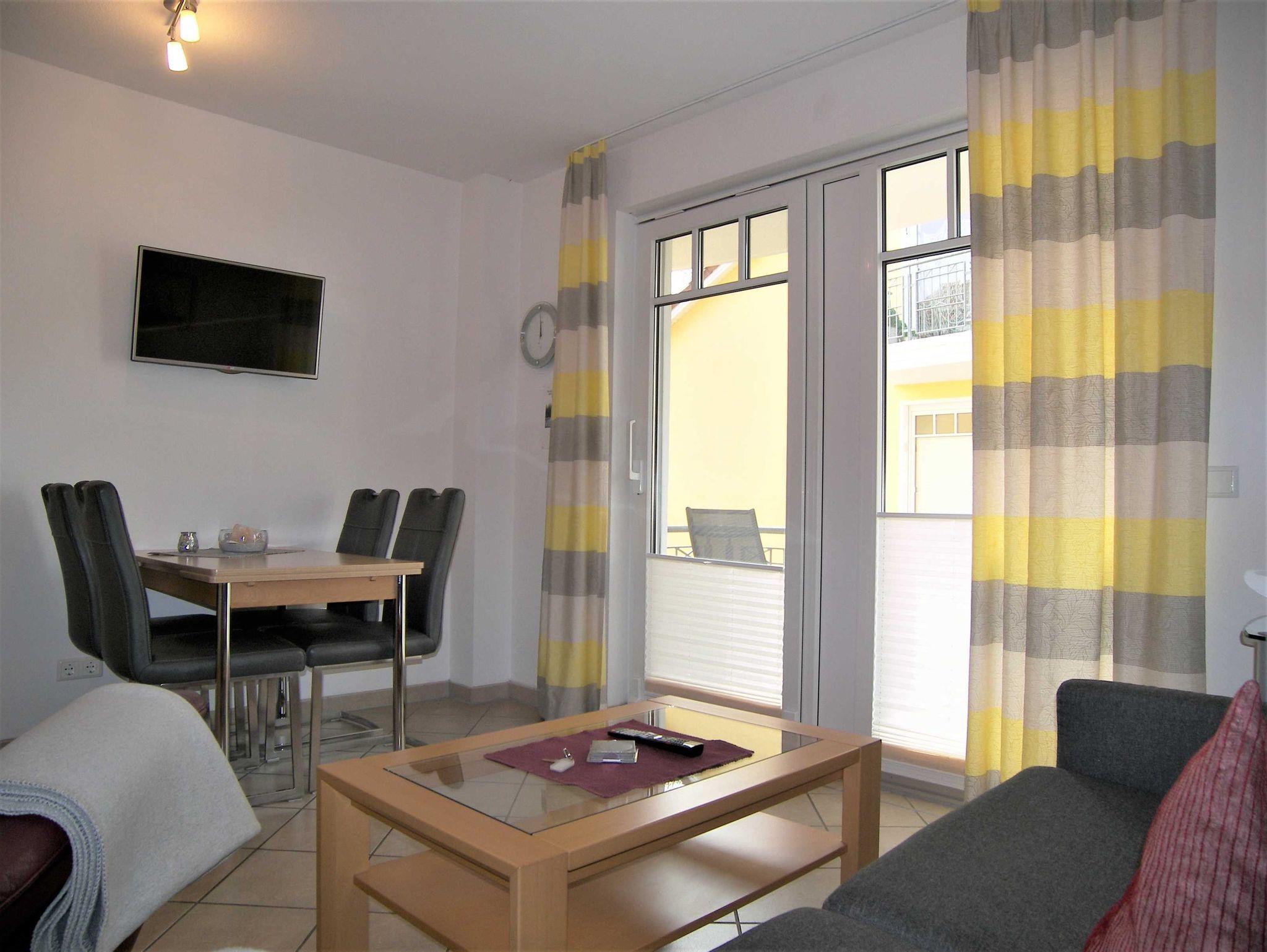 Komfortable 2-Raum Nichtraucher-Ferienwohnung im 1. OG. mit Balkon zur Südwestseite. Die Wohnung verfügt über einen Schlafraum mit Doppelbett und Kleiderschrank, einem kombinierten Wohn- und Schlafraum mit einer ausklappbaren Schlafcouch (Liegefläche 1,40 x 2,00 m), TV, Radio mit CD-Player, gemütliche Couchsitzgruppe und Essbereich sowie eine Küchenzeile mit 4 Platten Herd, Backofen, Mikrowelle, Spüle, Kühlschrank, Kaffeemaschine, Geschirr etc.