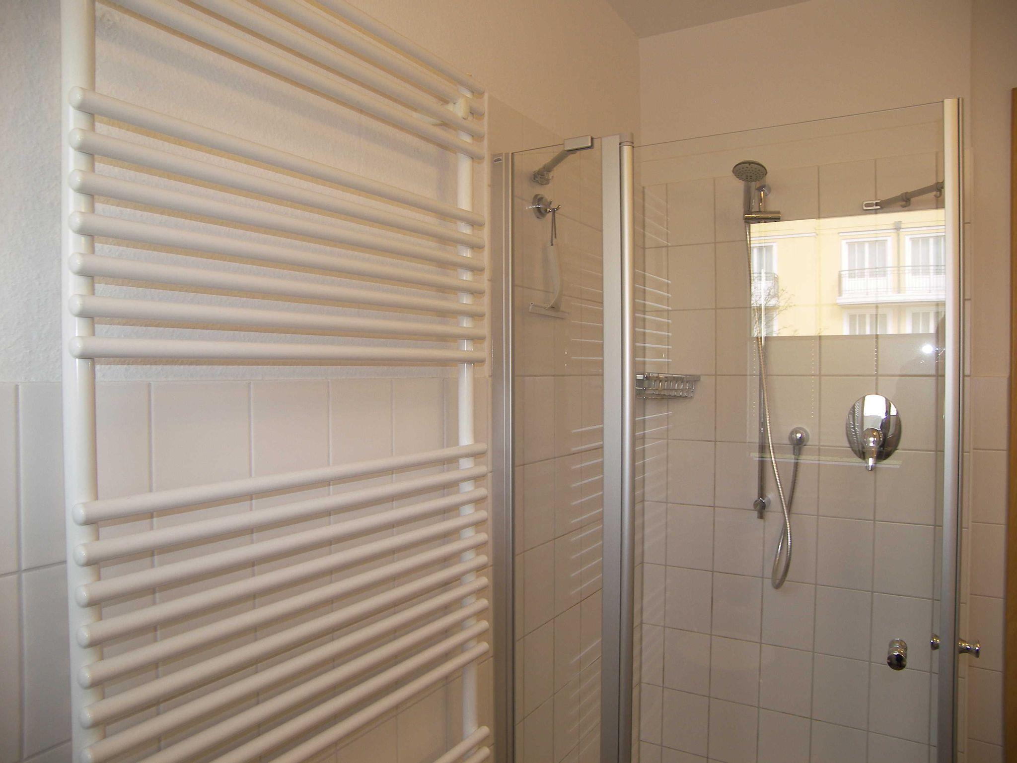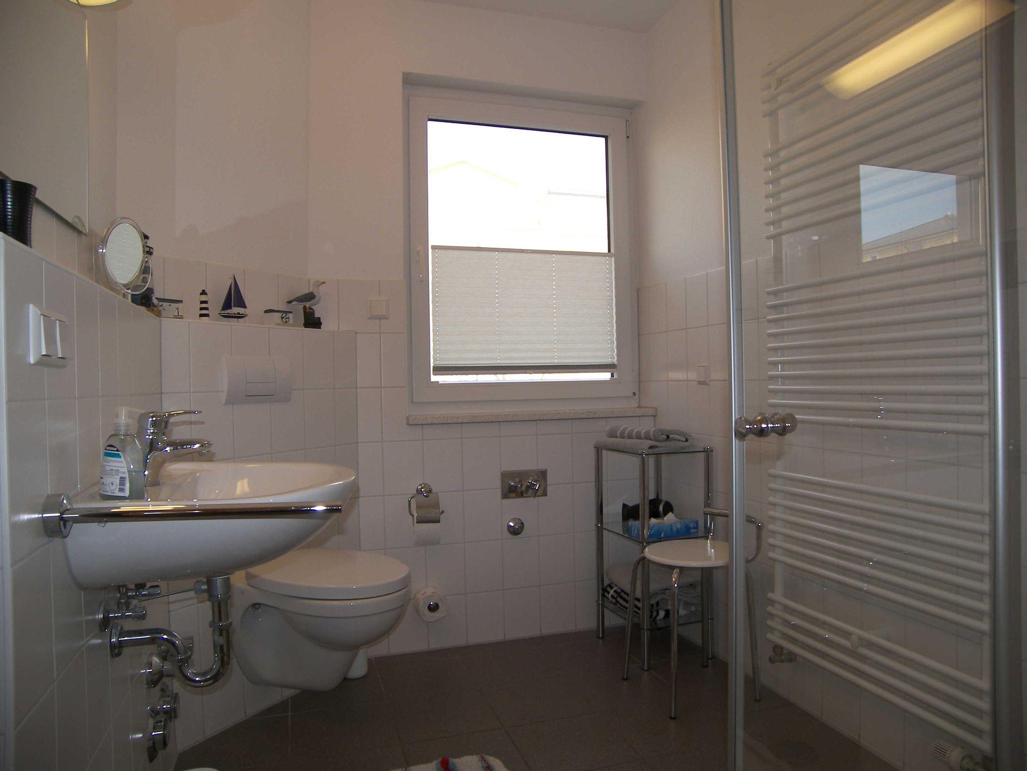Badezimmer mit DU und WC. (Ebenerdiger Einstieg in die Dusche, seniorenfreundlich.) Der Balkon ist vom Wohnraum begehbar. Die Wohnung ist mit hellen Bodenfliesen ausgestattet.