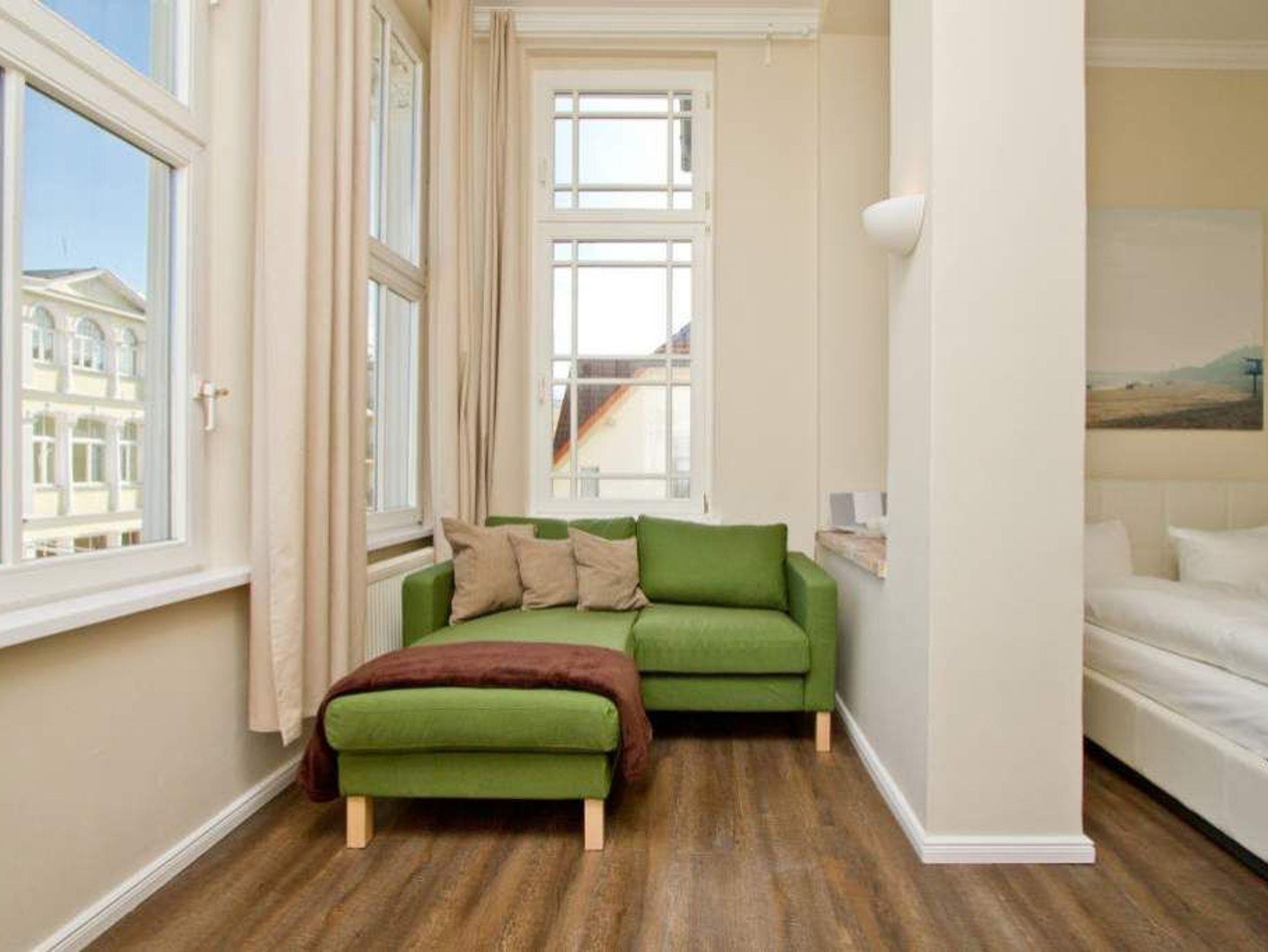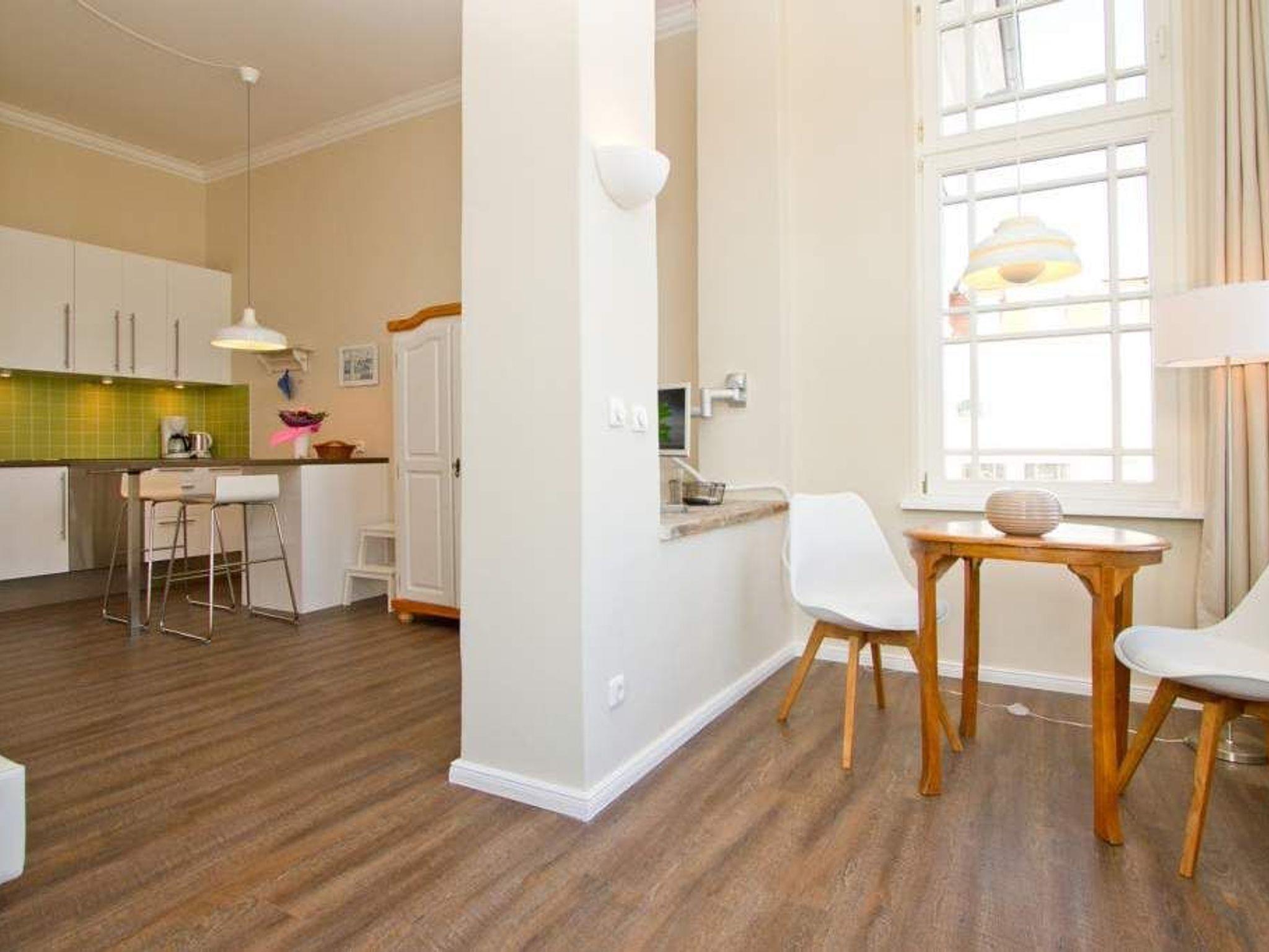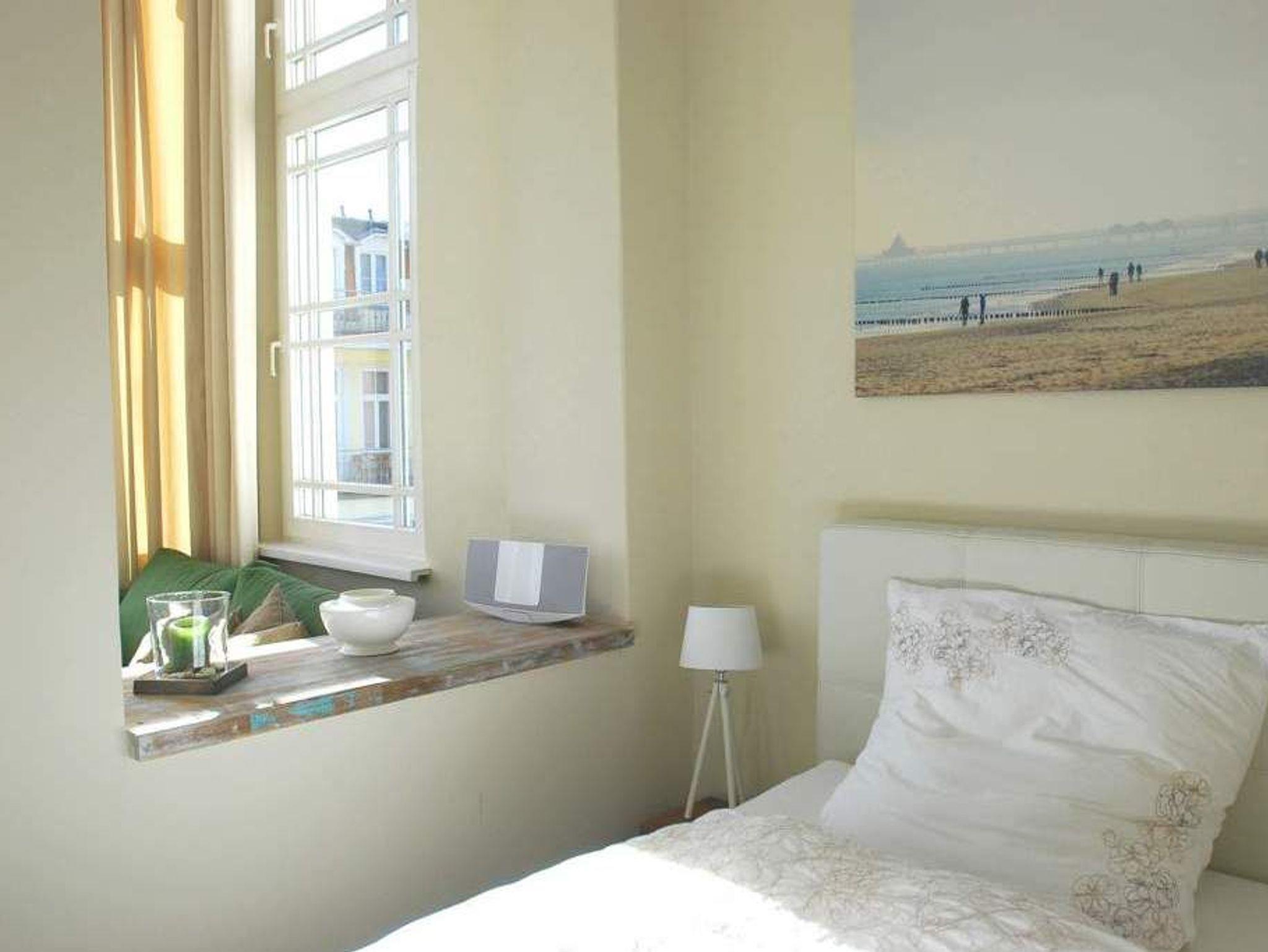 Individueller Charme und persönlicher Stil zeichnen die Wohnung Saphir im 1. Obergeschoss der Villa Anna aus. Das großzügig geschnittene, offen gestaltete Apartment (36 m²) bietet ein stilvolles Zuhause auf Zeit für 2 Personen. Helle Räume, geschmackvolles Interieur und hochwertige Ausstattung schaffen ein entspanntes Urlaubsambiente. Frühstücken können Sie entweder am Bistro-Tresen oder in der kleinen Essecke mit Blick auf die Ostsee. Der LCD-Fernseher lässt sich dank Schwenkarm wahlweise auf den Wohn- oder Schlafbereich ausrichten. Die moderne Küche mit Cerankochfeld, Kühlschrank und Geschirrspüler sowie das Duschbad lassen keine Wünsche offen. Ein Highlight ist die gemütliche Veranda mit breiter Glasfront und Sofa mit Récamiere ? der perfekte Platz für entspannte Stunden mit Panoramaausblick. Für Ihren Komfort sind die Betten bei Anreise bezogen, Handtücher liegen als Erstausstattung bereit. Ein Pkw-Stellplatz befindet sich auf dem Grundstück.