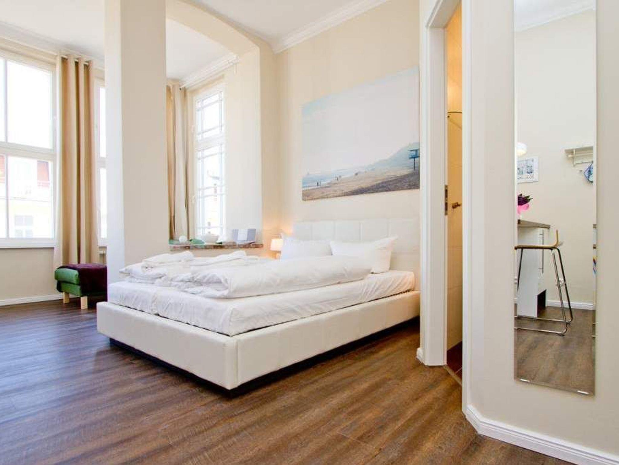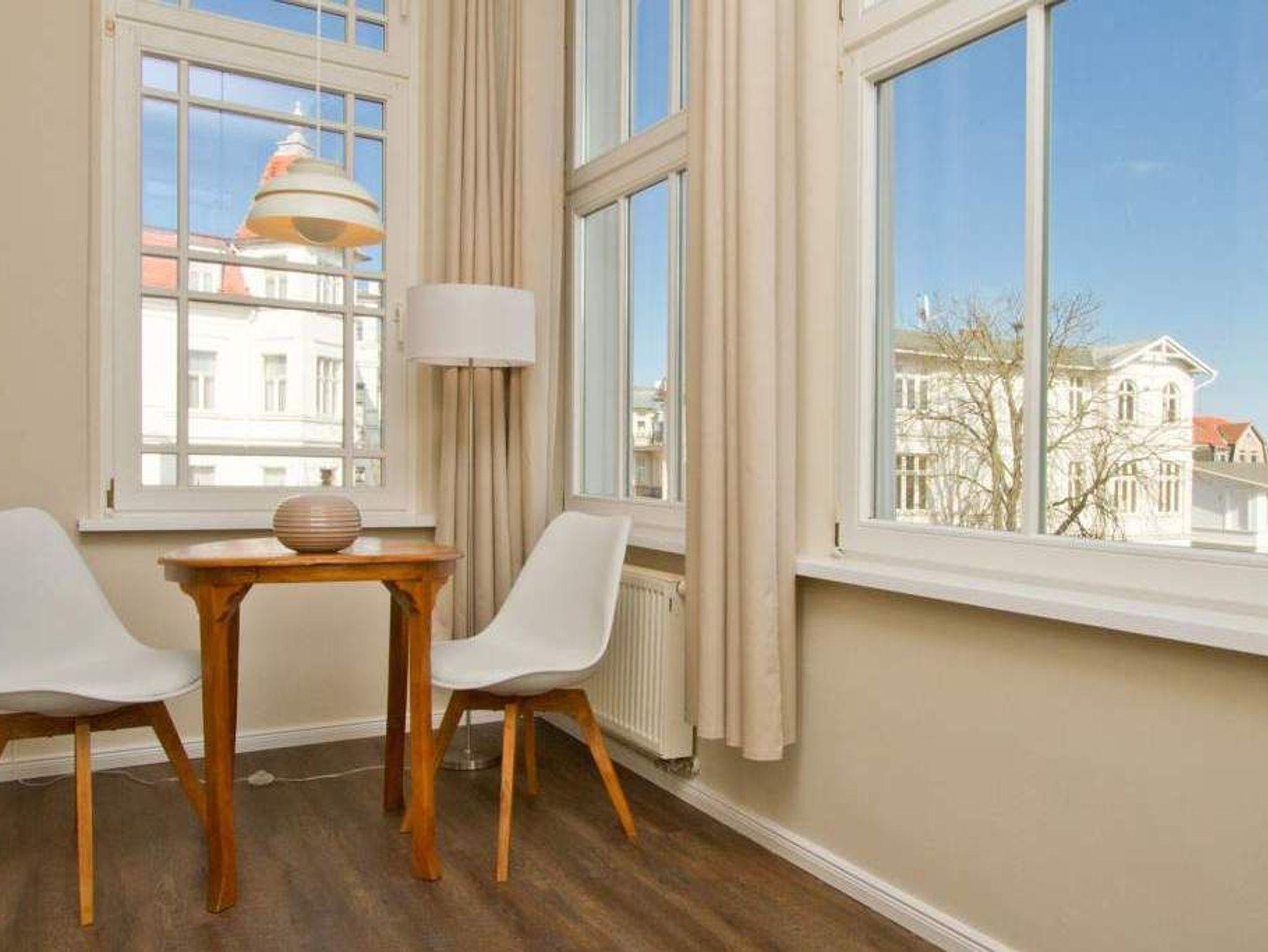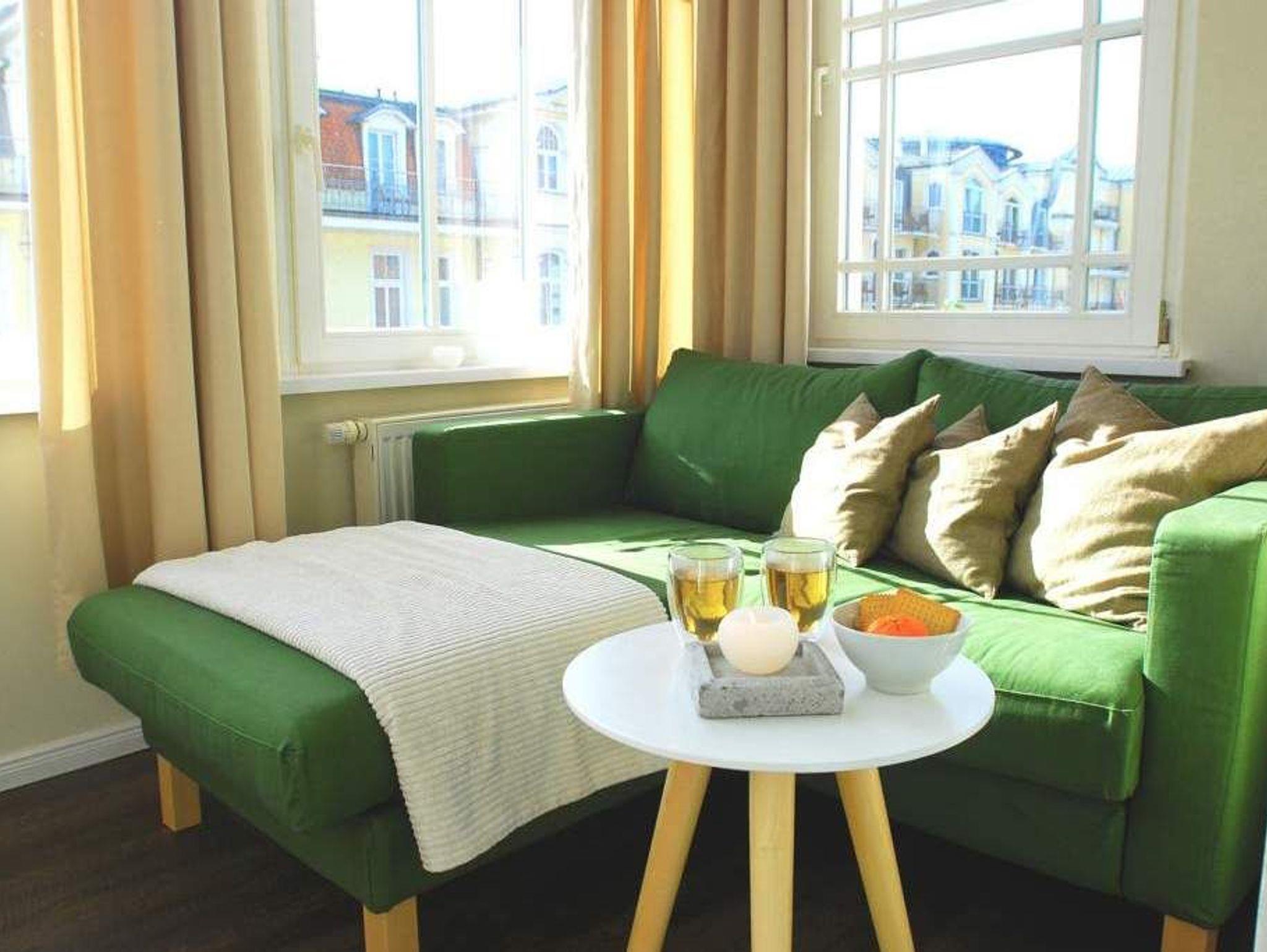 Individueller Charme und persönlicher Stil zeichnen die Wohnung Saphir im 1. Obergeschoss der Villa Anna aus. Das großzügig geschnittene, offen gestaltete Apartment (36 m²) bietet ein stilvolles Zuhause auf Zeit für 2 Personen. Helle Räume, geschmackvolles Interieur und hochwertige Ausstattung schaffen ein entspanntes Urlaubsambiente. Frühstücken können Sie entweder am Bistro-Tresen oder in der kleinen Essecke mit Blick auf die Ostsee. Der LCD-Fernseher lässt sich dank Schwenkarm wahlweise auf den Wohn- oder Schlafbereich ausrichten. Die moderne Küche mit Cerankochfeld, Kühlschrank und Geschirrspüler sowie das Duschbad lassen keine Wünsche offen. Ein Highlight ist die gemütliche Veranda mit breiter Glasfront und Sofa mit Récamiere ? der perfekte Platz für entspannte Stunden mit Panoramaausblick. Für Ihren Komfort sind die Betten bei Anreise bezogen, Handtücher liegen als Erstausstattung bereit. Ein Pkw-Stellplatz befindet sich auf dem Grundstück.