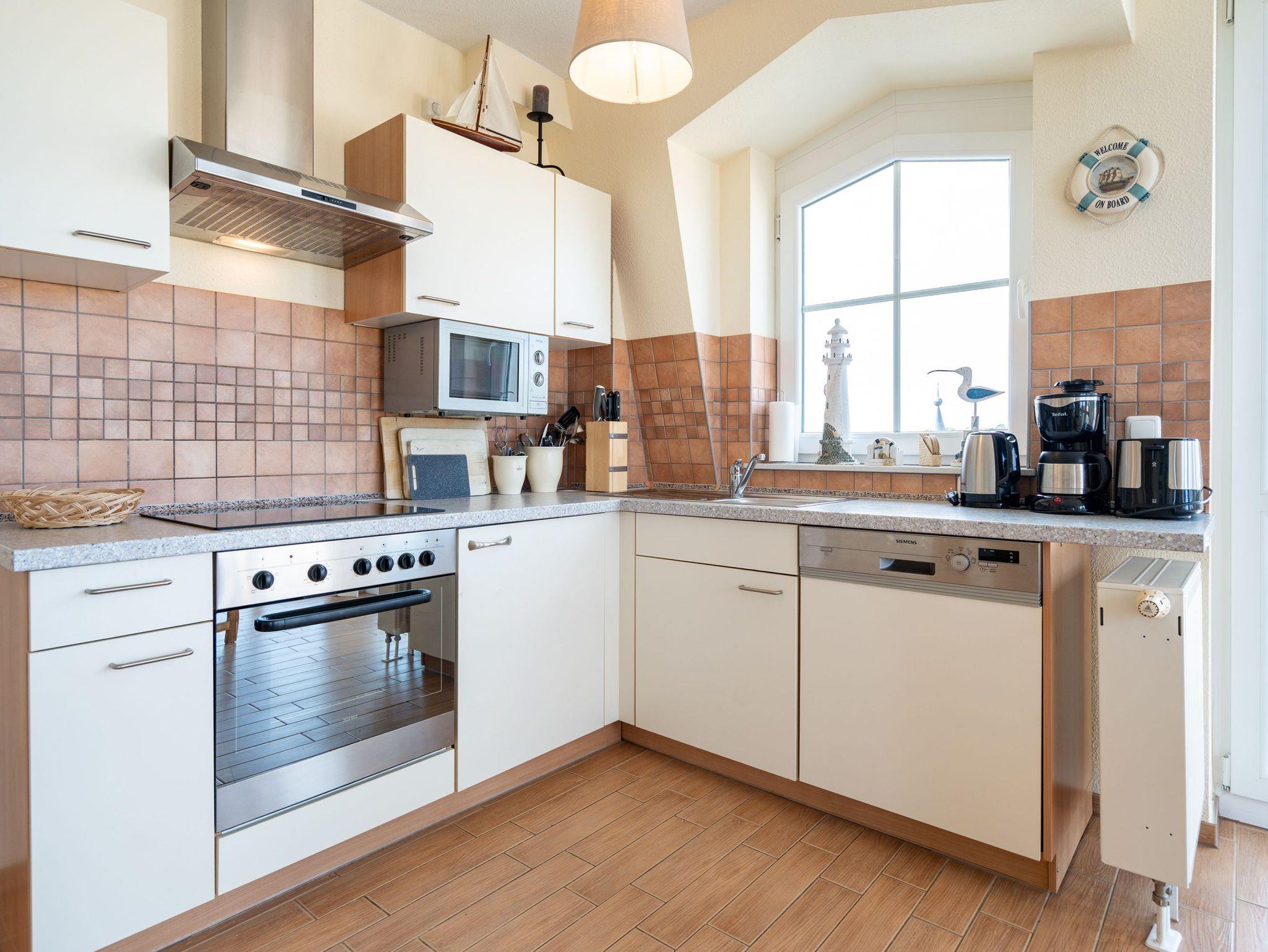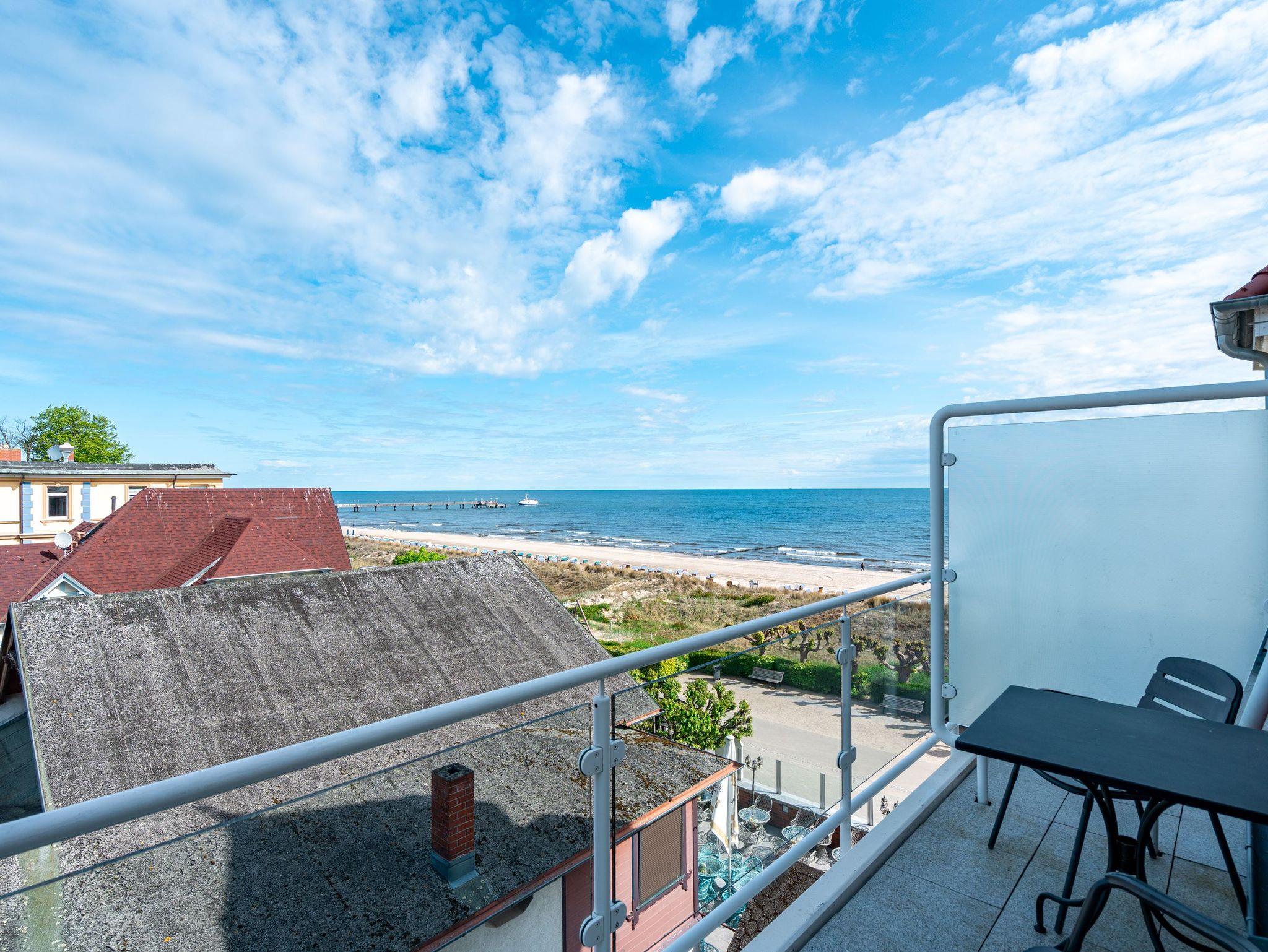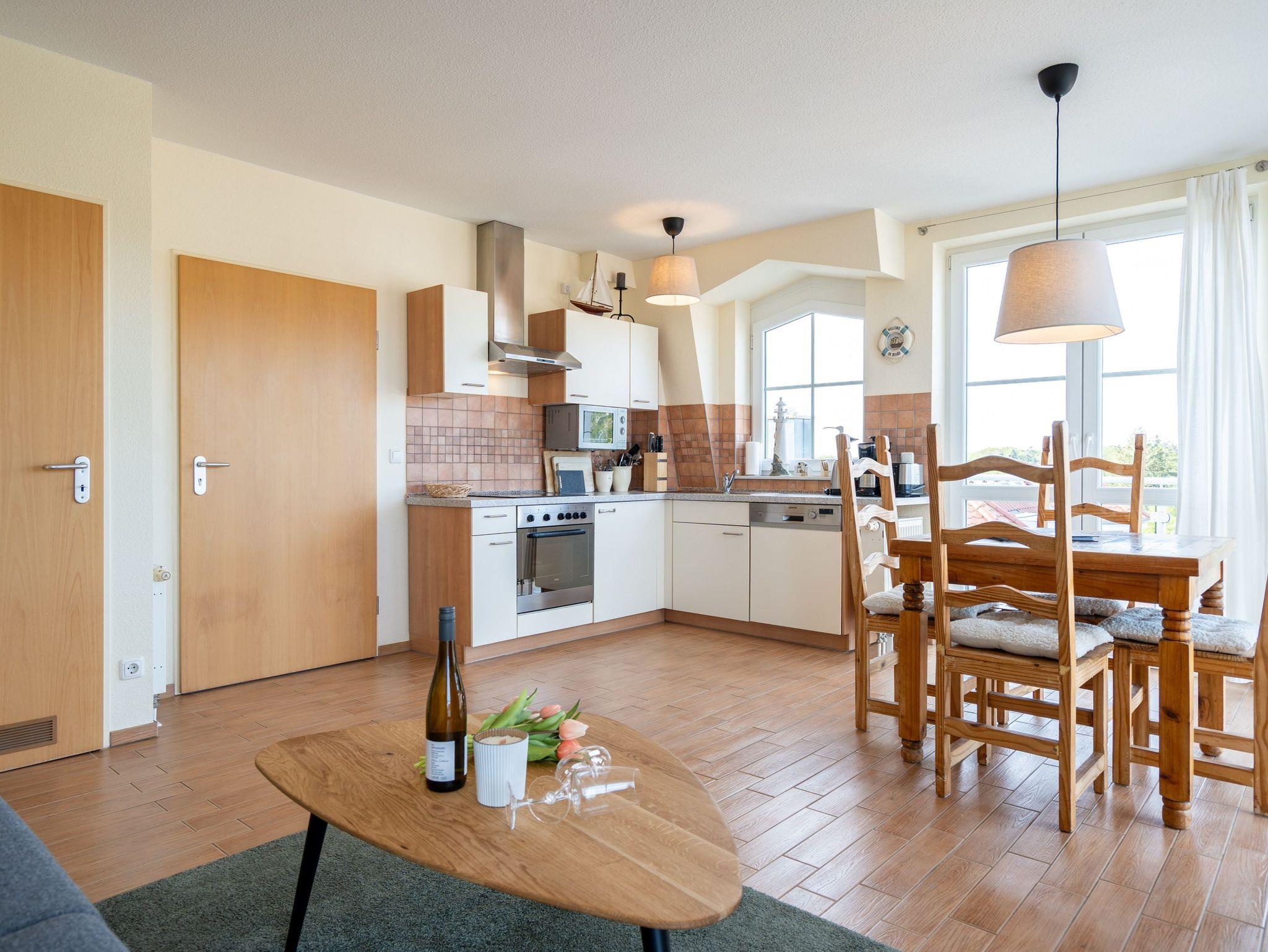 Die stilvoll eingerichtete 45 qm Ferienwohnung ist von Licht durchflutet und bietet einen schönen (seitlichen) Ausblick auf das Meer und den Strand (für max. 2 Erwachsene [&] 1 Kind bis 16 Jahre). Das Haus befindet sich in exponierter ruhiger Lage direkt an der Promenade und am Strand. Die Ferienwohnung verfügt über ein Wohnzimmer mit Einbauküche, Schlafzimmer, Duschbad, TV und 2 Balkone. Im Wohnbereich befindet sich als zusätzliche Schlafmöglichkeit eine Couch mit einer Liegefläche von 1,60 m mal 2 m. Auf Wunsch stellen wir für unsere kleinen Gäste ein Kinderreisebett (ohne zusätzliche Matratze [&] Bettzeug) und einen Kinderhochstuhl (gegen einen Aufpreis) zur Verfügung. Für Ihren Komfort sind die Betten bei der Anreise bezogen und Handtücher liegen bereit. Das WLAN-Netz ist kostenfrei nutzbar.