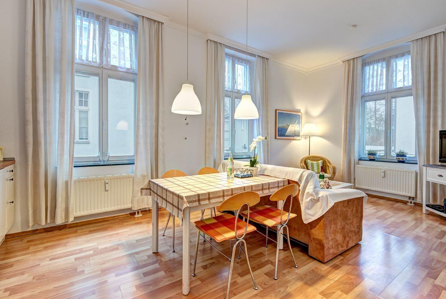 Die Wohnung ist ideal für zwei Personen und verfügt über ein gemütliches Schlafzimmer mit zwei Einzelbetten. Das gemütliche Schlafsofa bietet eine zusätzliche Aufbettungsmöglichkeit. Das helle Wohnzimmer mit offener, voll ausgestatteter Küche lädt zum Wohlfühlen ein, und der Essbereich ist harmonisch integriert.
