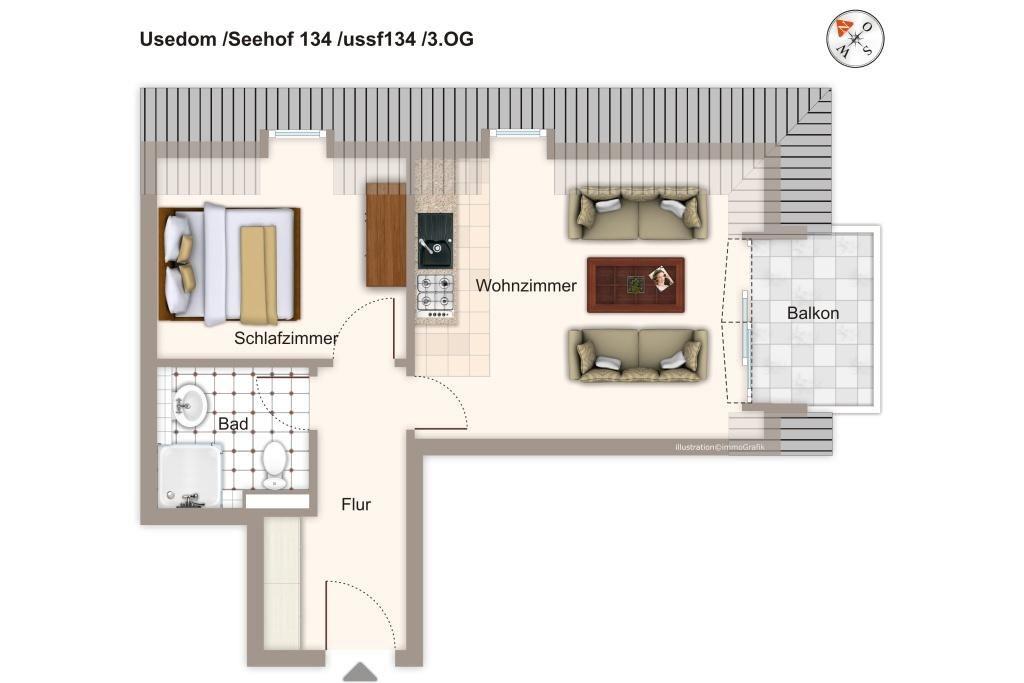 In Haus 1, in östlicher Lage, befindet sich diese Ferienwohnung auf der 3. Etage, im Dachgeschoss der beliebten und familienfreundlichen Apartmentanlage Seehof.