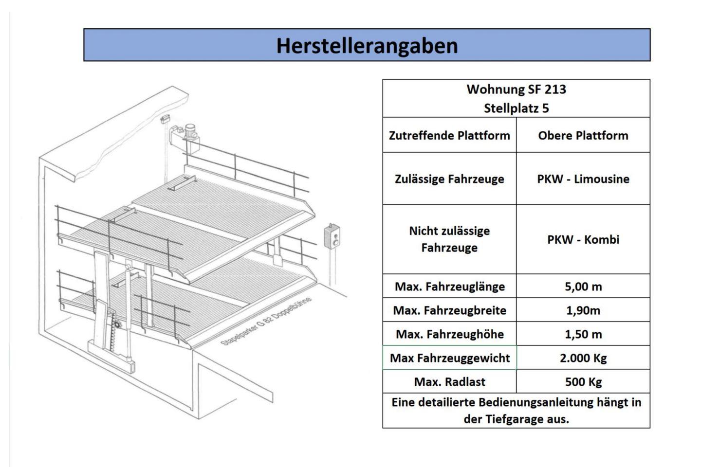 Ihr könnt einen PKW-Stellplatz in der hauseigenen Tiefgarage mit Doppelparksystem gegen Aufpreis hinzubuchen. Bitte gleicht die Maße eures PKW mit den Herstellerdaten sorgfältig im Vorfeld ab (siehe „Bildergalerie“). Alternativ kann euch die Gästebetreuung einen Stellplatz in der Tiefgarage Seepark, ca. 900 m entfernt, unter der Telefonnummer 038378-465020 reservieren (gegen Entgelt und nach Verfügbarkeit).