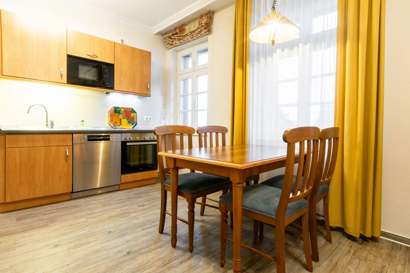 Die Ausstattung besteht weiterhin aus einer voll ausgestatteten offenen Küche mit Wasserkocher, Kaffeemaschine, Toaster, Backofen, Geschirrspüler, Mikrowelle und Tiefkühlfach.