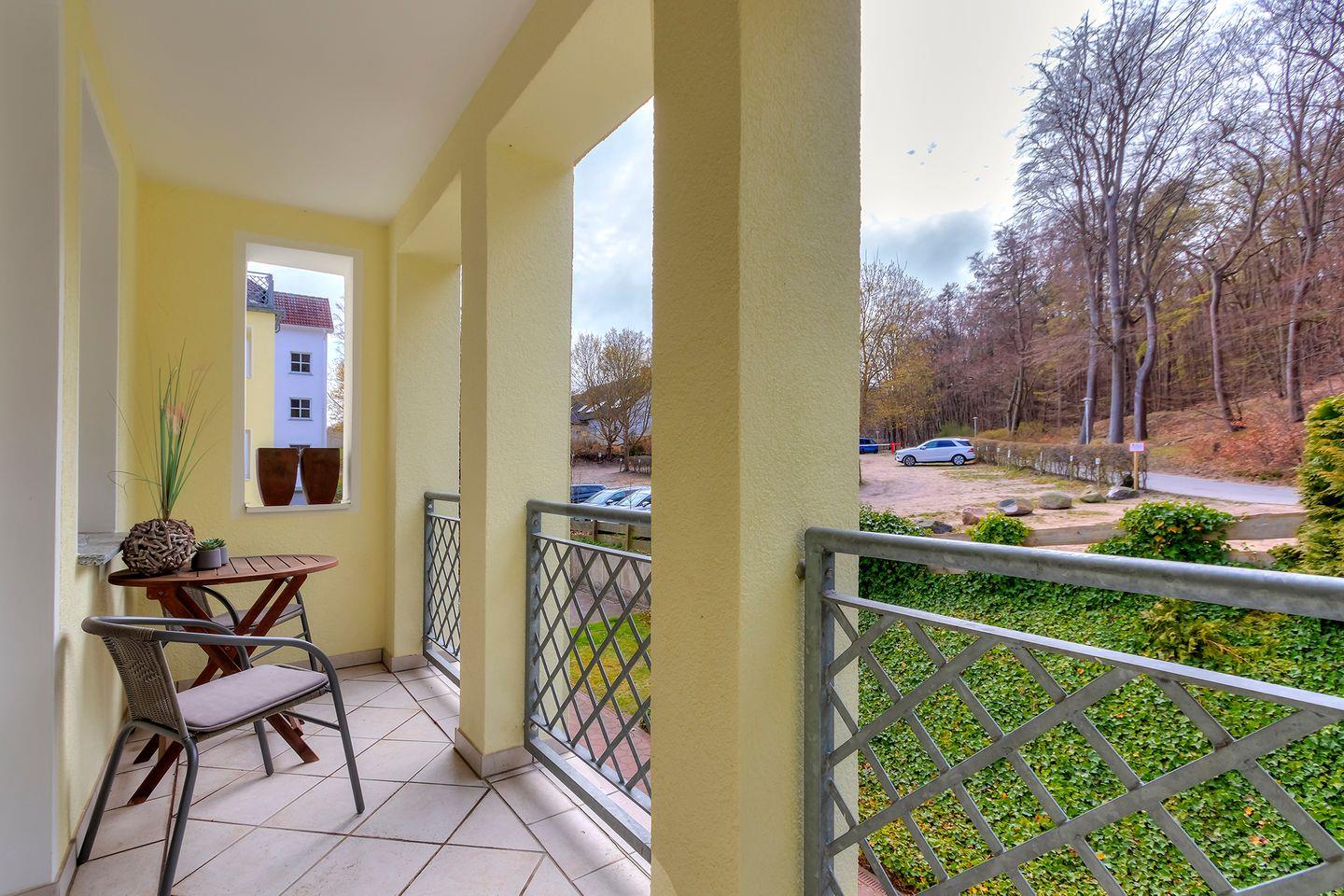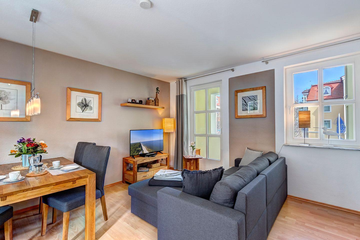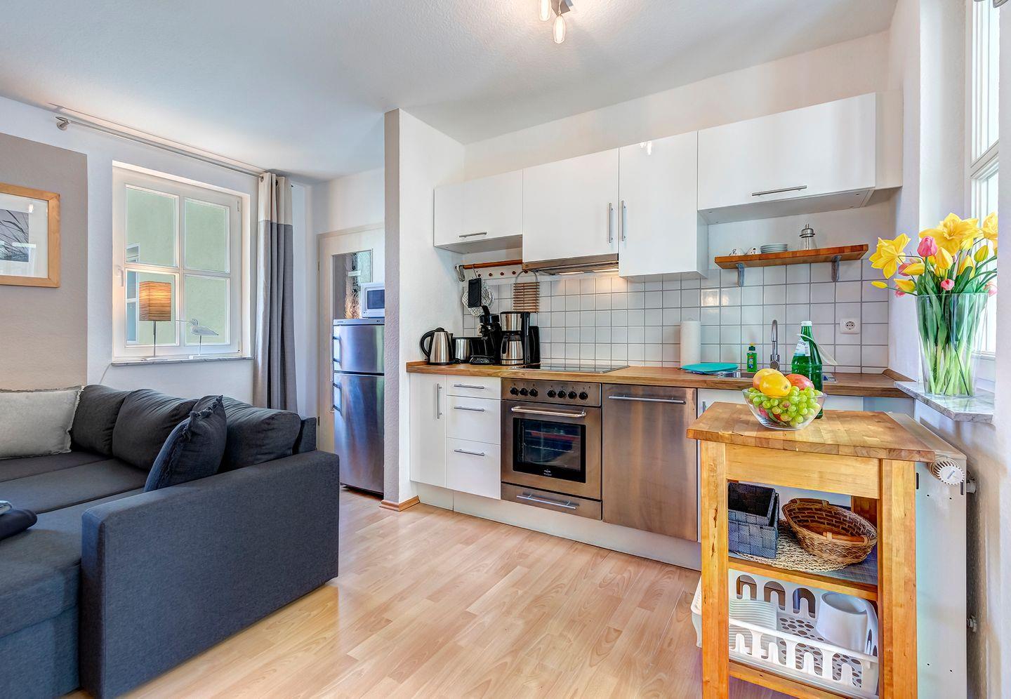 Diese im 1 Stock der Wohnanlage gelegene 2 Zimmer Wohnung hat eine absolut seltene Besonderheit. Durch die Architektur des Gebäudes verfügt das Wohnzimmer über eine Fensterfront mit einem kleinen Balkon in Nordrichtung (Ostsee) wie auch gleichzeitig über eine Fensterfront und einen großen Balkon in südlicher Ausrichtung (Sonnenseite).Die Einrichtung mit eleganten und hochwertigen Möbeln, einer komplett ausgestatteten Einbauküche lässt keine Urlaubswünsche an ein modernes Ferienappartement offen.