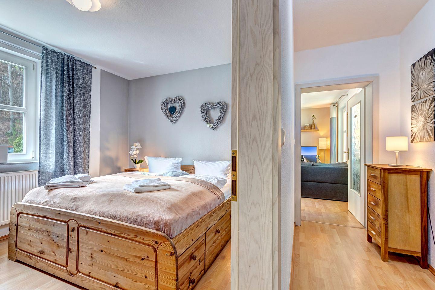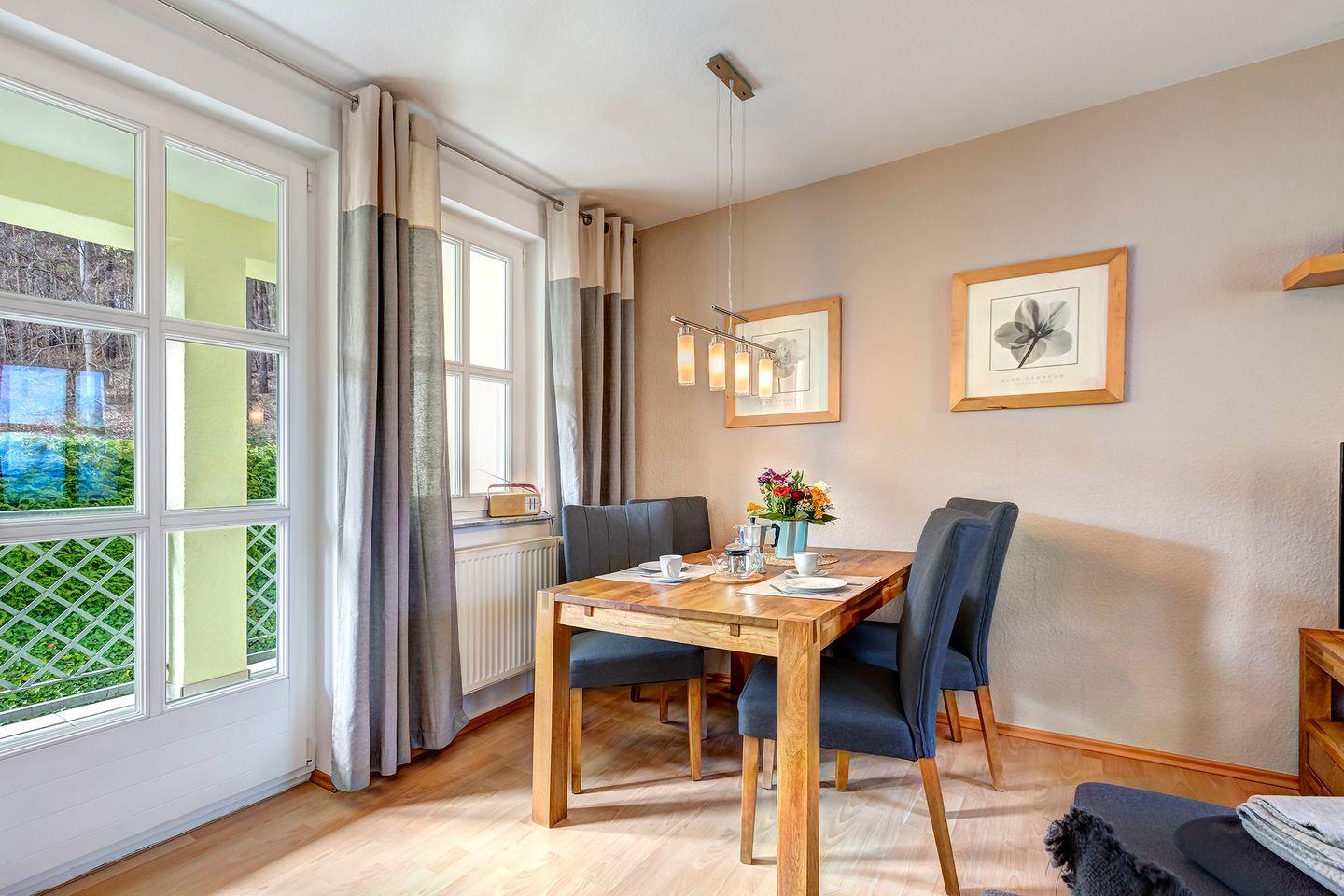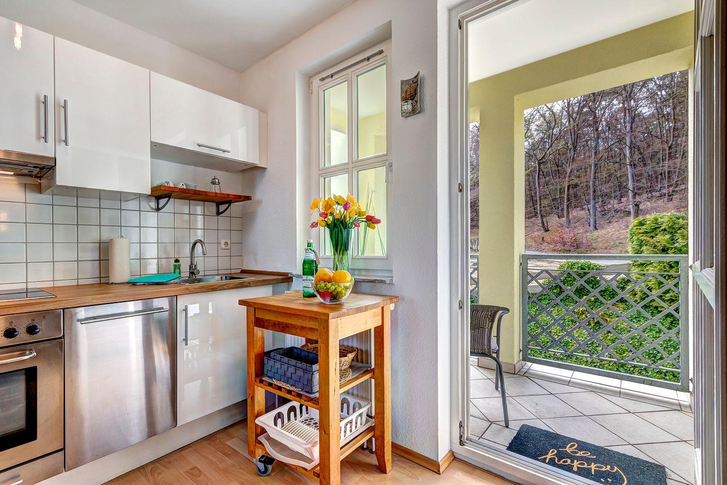 Diese im 1 Stock der Wohnanlage gelegene 2 Zimmer Wohnung hat eine absolut seltene Besonderheit. Durch die Architektur des Gebäudes verfügt das Wohnzimmer über eine Fensterfront mit einem kleinen Balkon in Nordrichtung (Ostsee) wie auch gleichzeitig über eine Fensterfront und einen großen Balkon in südlicher Ausrichtung (Sonnenseite).Die Einrichtung mit eleganten und hochwertigen Möbeln, einer komplett ausgestatteten Einbauküche lässt keine Urlaubswünsche an ein modernes Ferienappartement offen.