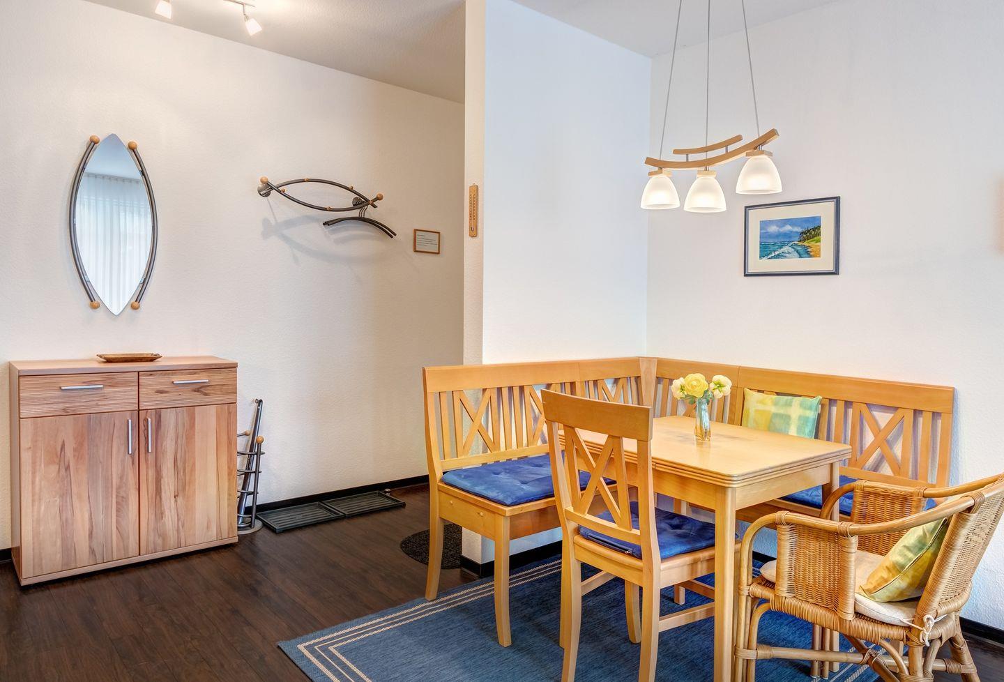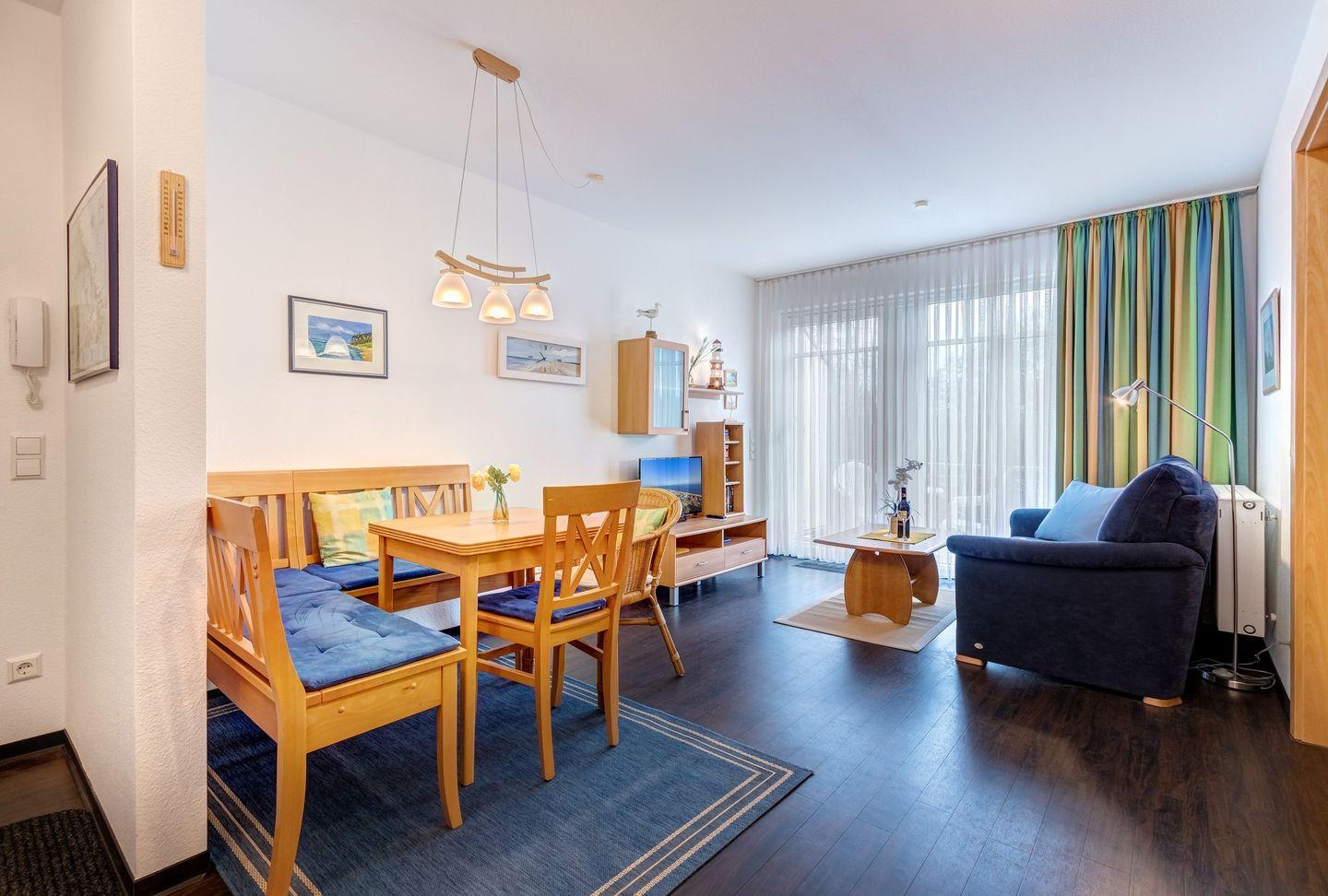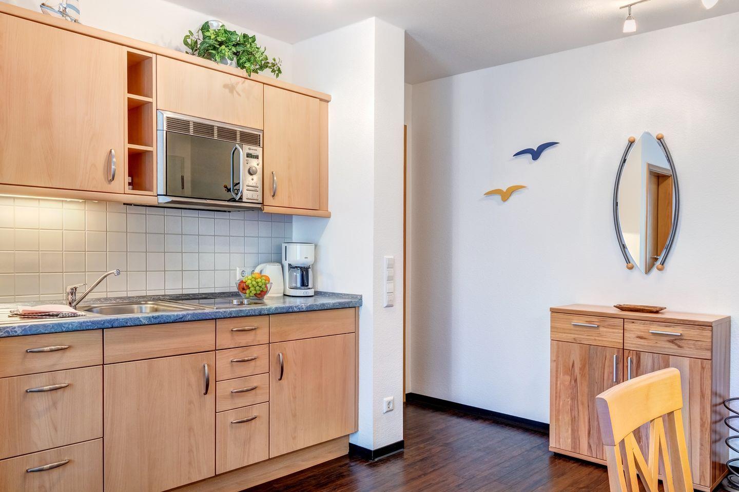 Der helle Wohn- und Essbereich bietet viel Raum für gemütliche Stunden, während die komplett ausgestattete Küche keine Wünsche offenlässt. Das Schlafzimmer sorgt mit seinem komfortablen Bett für erholsamen Schlaf, und das moderne Duschbad bietet zusätzlichen Komfort. Mit ihrer perfekten Lage und dem einladenden Ambiente ist diese Wohnung der ideale Rückzugsort für einen unvergesslichen Urlaub an der Ostsee.