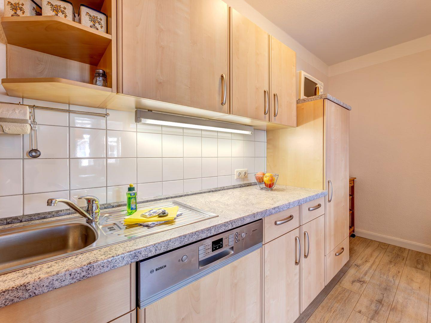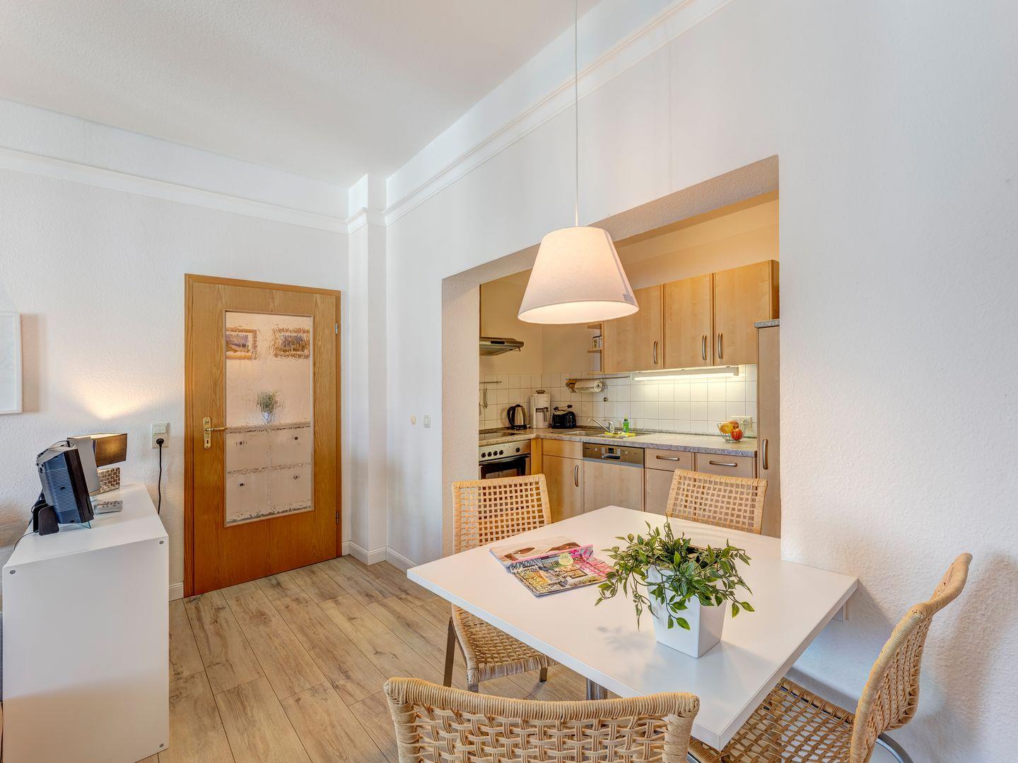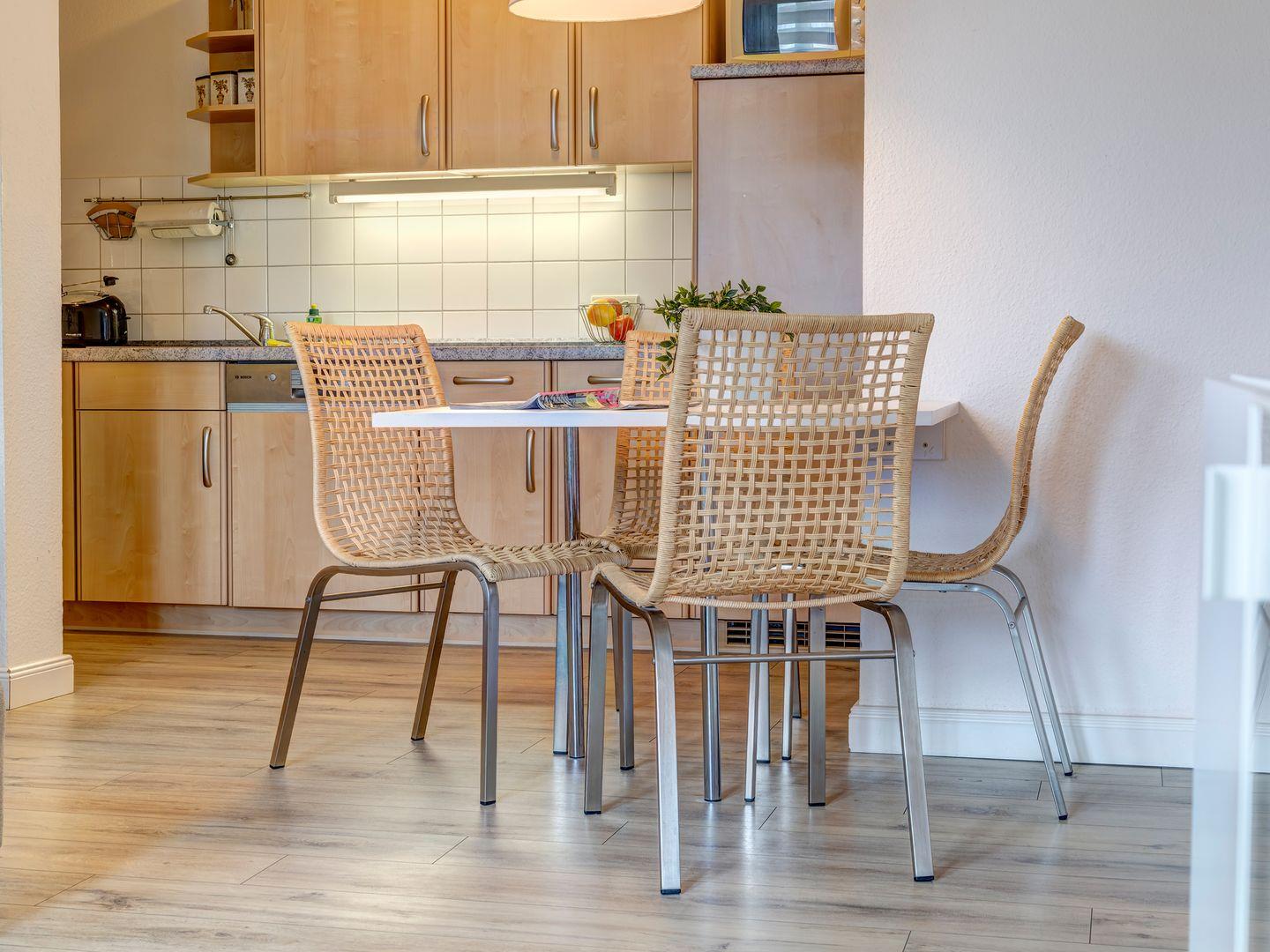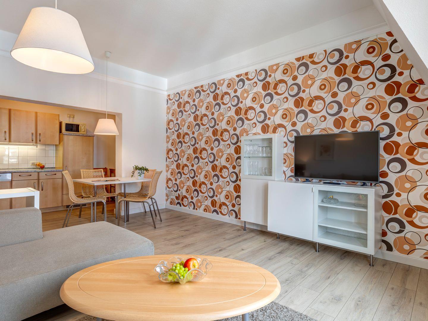 Der Wohnbereich ist groß und hell und bietet Platz für bis zu 4 Personen. Ebenso finden Sie einen gemütlichen Essbereich sowie den Durchgang zur modern ausgestatteten Küche