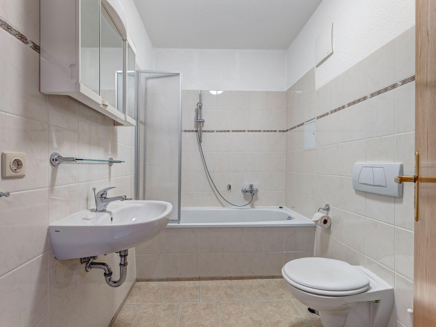 Das Bad ist mit WC, einer Badewanne ausgestattet, welche auch das Duschen ermöglich.