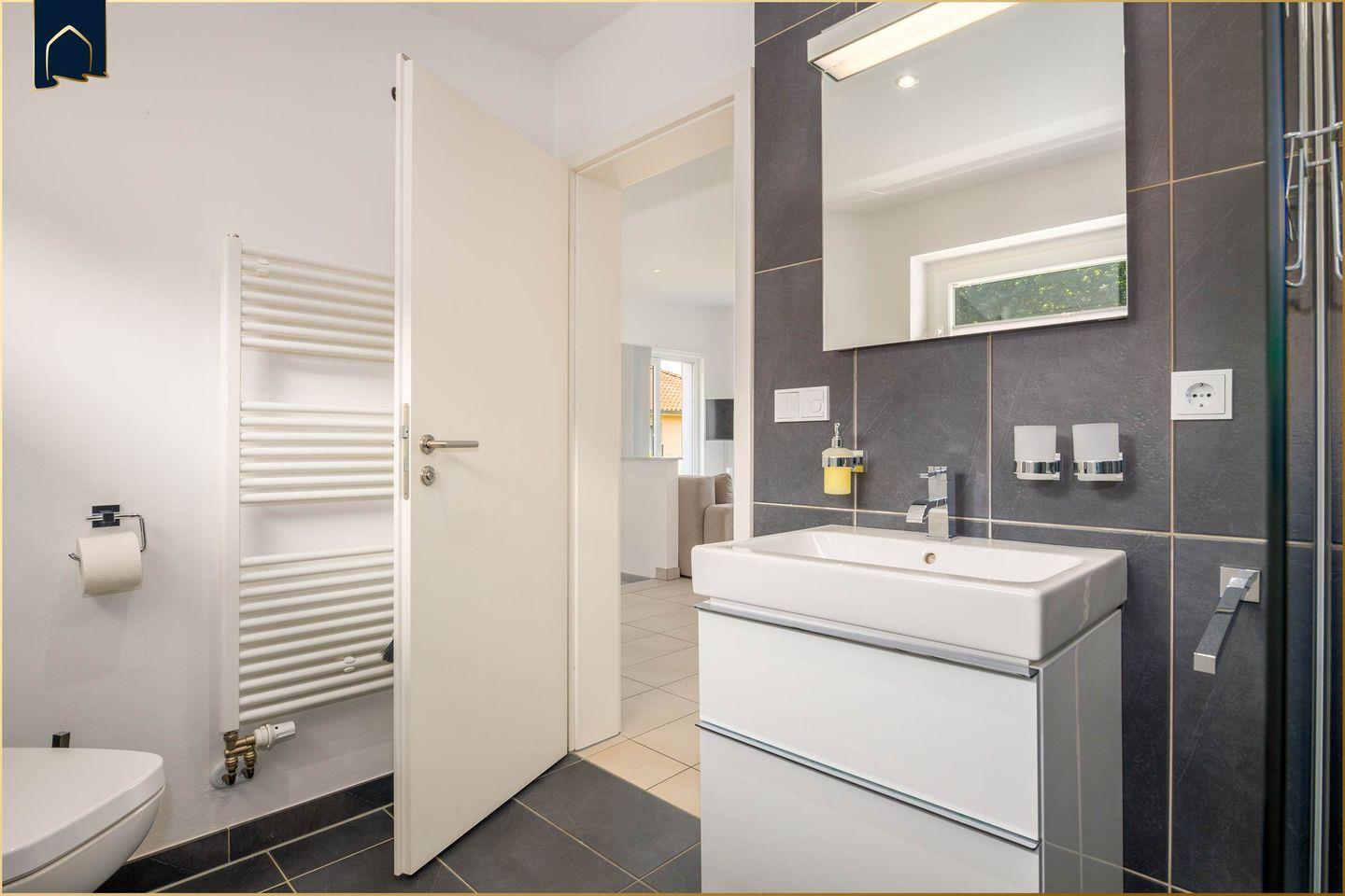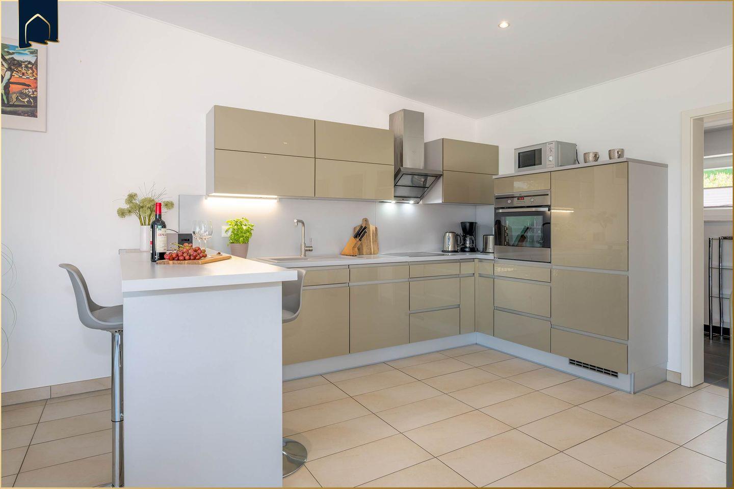Die voll ausgestattete Küche lässt keine Wünsche offen und eignet sich ideal für Selbstversorger. Zur Ausstattung gehören unter anderem eine Spülmaschine, Mikrowelle, Kaffeemaschine, Toaster sowie ausreichend Geschirr und Kochutensilien. Das separate Schlafzimmer bietet ein komfortables Bett für erholsame Nächte, während das moderne Badezimmer mit Dusche funktional und stilvoll gestaltet ist. WLAN, Smart-TV, Fußbodenheizung und ein privater Parkplatz stehen selbstverständlich zur Verfügung.