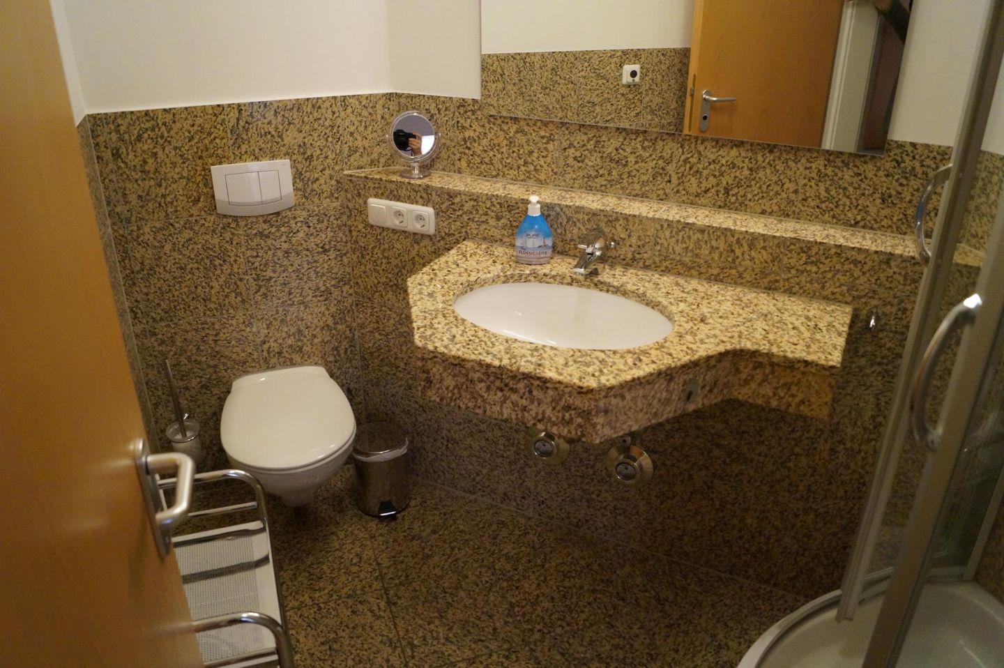Das Badezimmer verfügt neben der Dusche, dem Waschbecken und WC auch über einen praktischen Handtuch-Heizkörper.