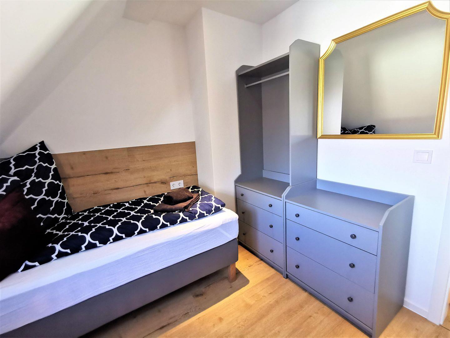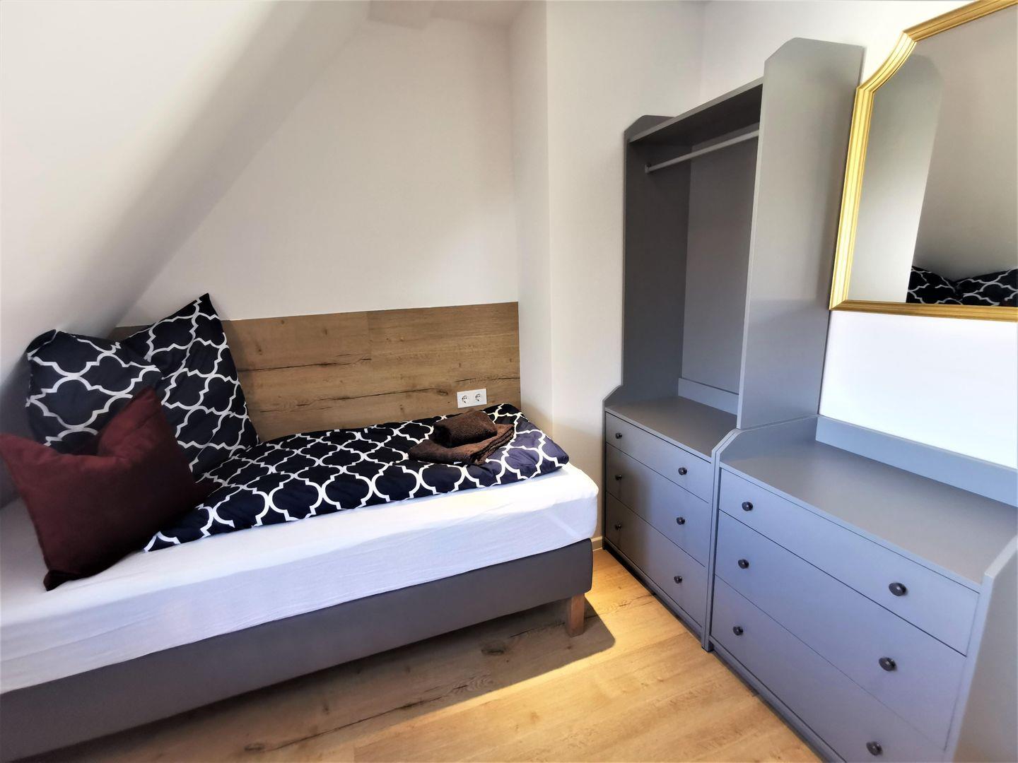 Für Free-TV nutzen Sie die Apps von ARD und ZDF sowie von Samsung TV. Das 2. Schlafzimmer mit einem Einzelbett ist zusätzlich mit einem Schreibtisch mit Tageslicht ausgestattet.