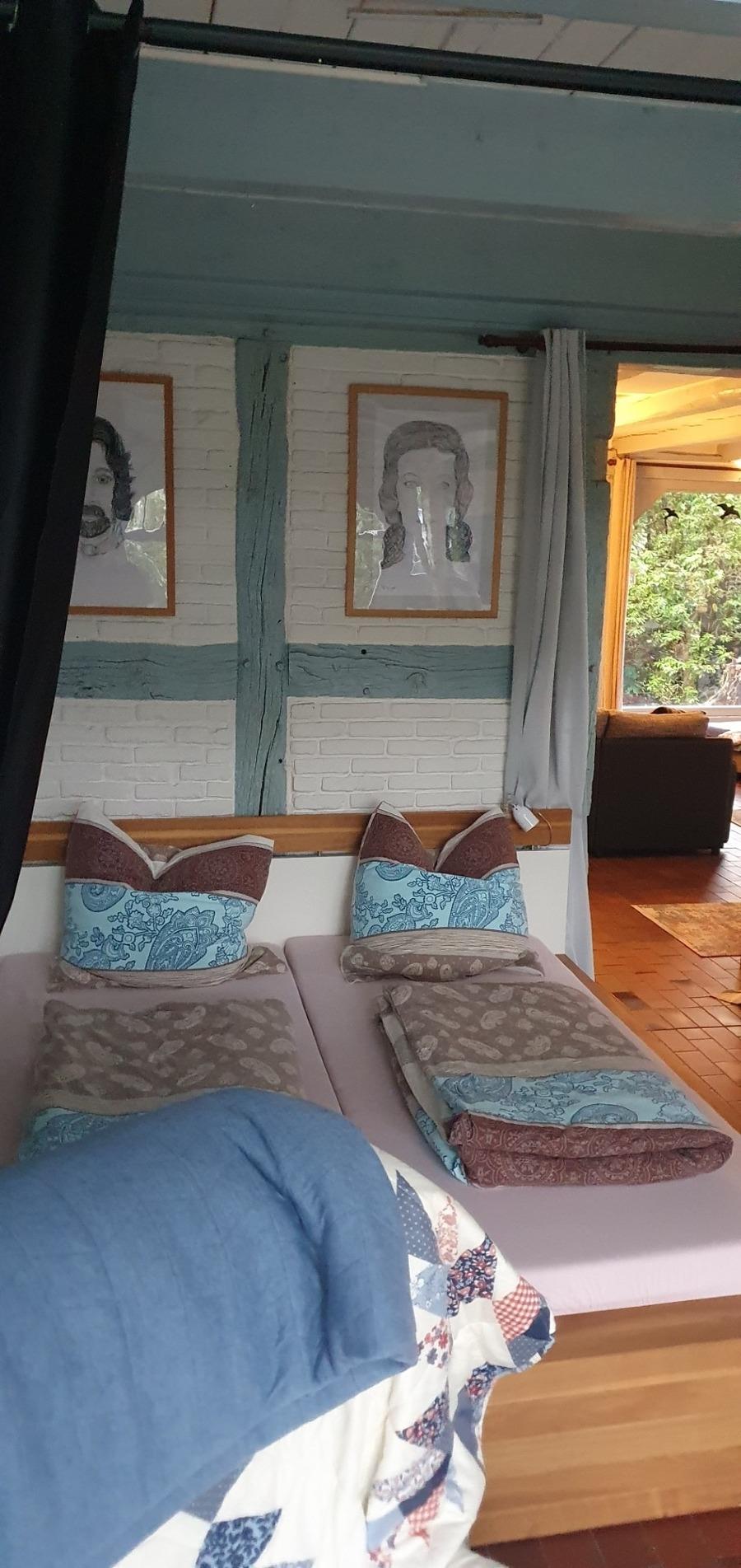 Im 1. Stock gelangt man durch einen Raum mit 2 Einzelbetten in ein lichtdurchflutetes großes Schlafzimmer mit einem Doppelbett (Hülsta). Weiter befindet sich im 1. Stock das 2. Bad.