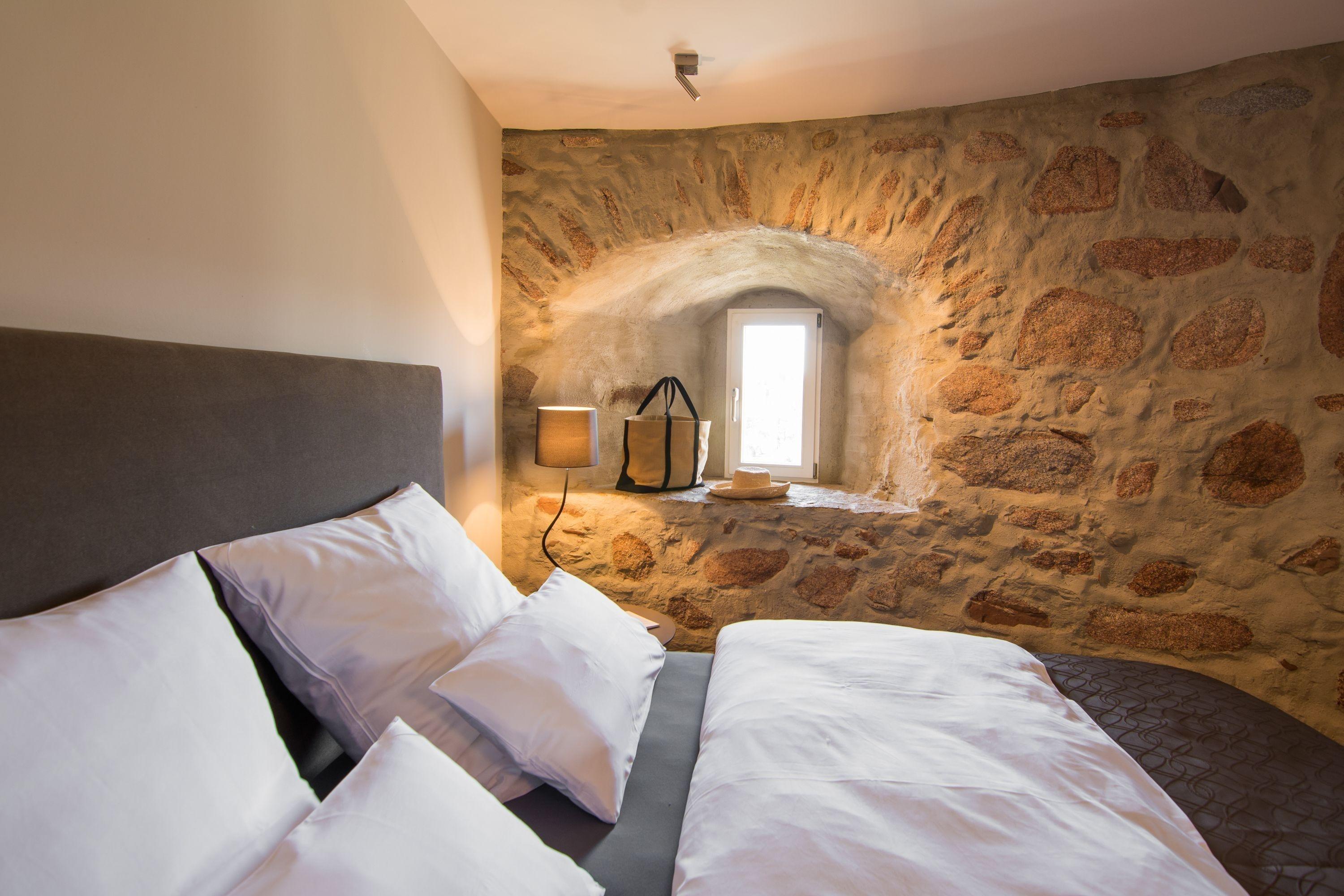 Das Turmzimmer ist von malerischem Natursteinmauerwerk umrandet, besitzt eine Kaffeeküche, die Unabhängigkeit beim Frühstück garantiert sowie ein eigenes Bad. Die Fenster sorgen für eine lichtdurchflutete Atmosphäre. Insgesamt vereint das Zimmer den historischen Charme alten Mauerwerks mit einem modern Ambiente.