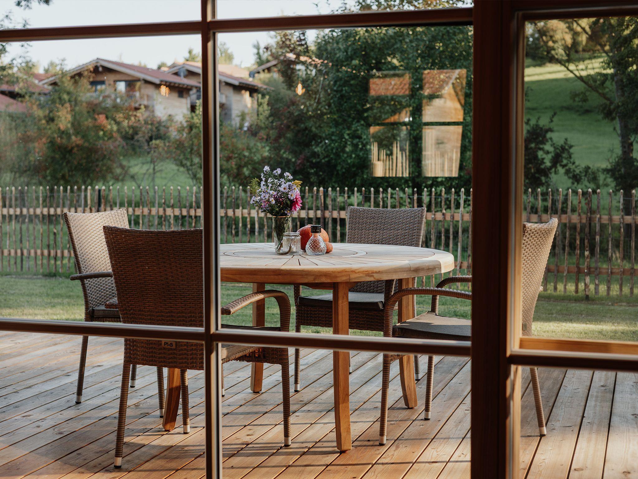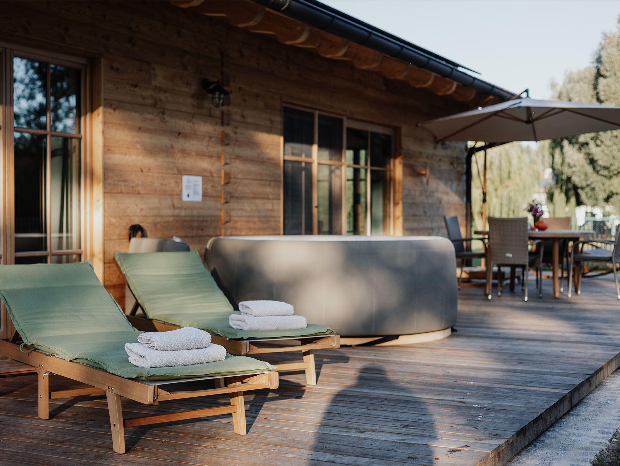Jedes Chalet besitzt einen eigenen Softub-Whirlpool auf der Terrasse.