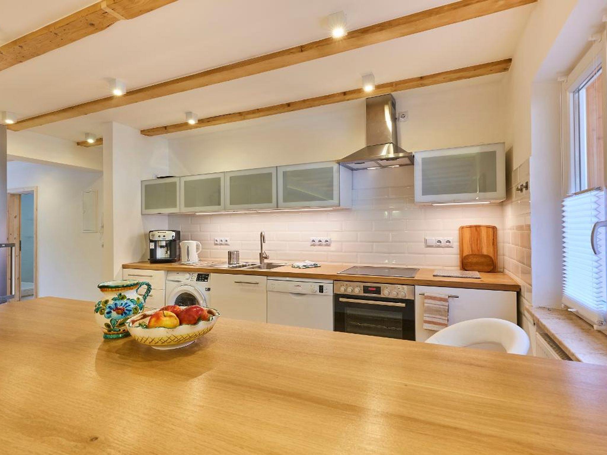 Eine weitgehend offen gestaltete Loft mit großem Wohn-Essbereich und Zugang zum Südbalkon. Zwei Schlafzimmer (mit Doppelbett und zwei Einzelbetten) liegen auf der Rückseite des Hauses zur kleinen Defernik hin gelegen, deren leichtes Rauschen zu hören ist. Das Bad verfügt über eine eigene Sauna. Die komplett eingerichtete Küche verfügt über einen Kühlschrank mit Gefrierfach, Wasch- und Spülmaschine und natürlich ein Kaffeevollautomat. Die Wohnung ist ausgestattet mit vier Boxspringbetten, die bei Bedarf auch zu zwei Doppelbetten umgestellt werden können.
