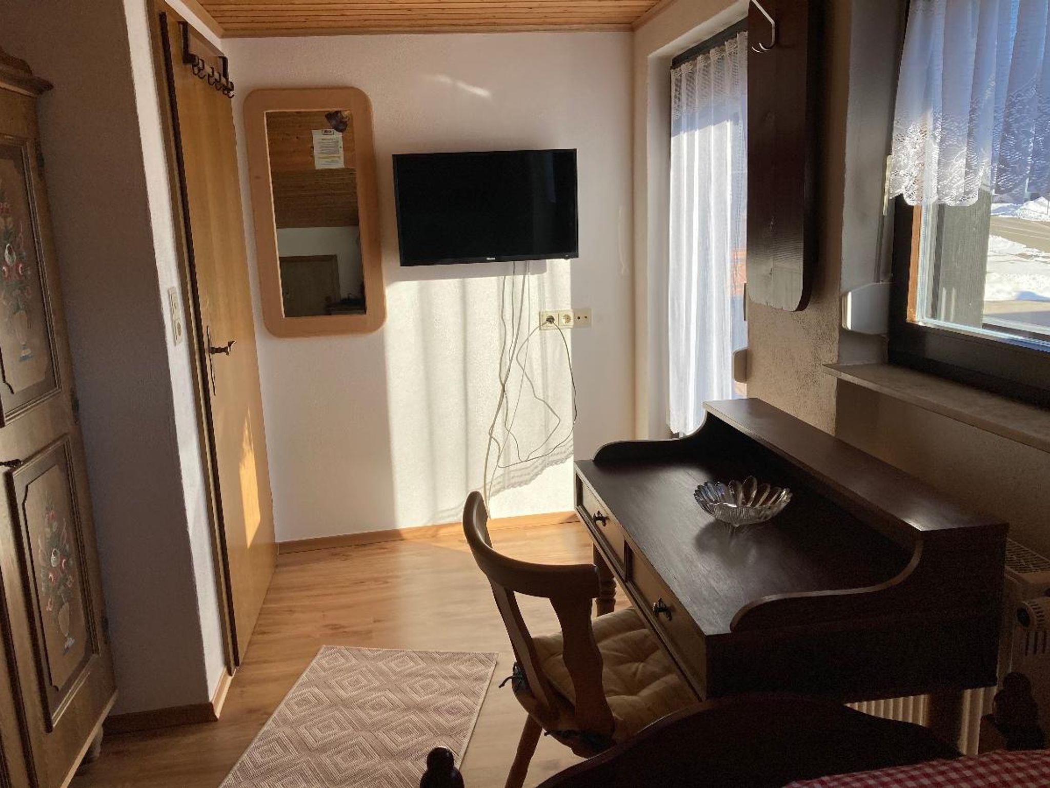 SAT-TV und ein kleiner Tisch. Das Bad besteht aus Dusche und WC. Auf