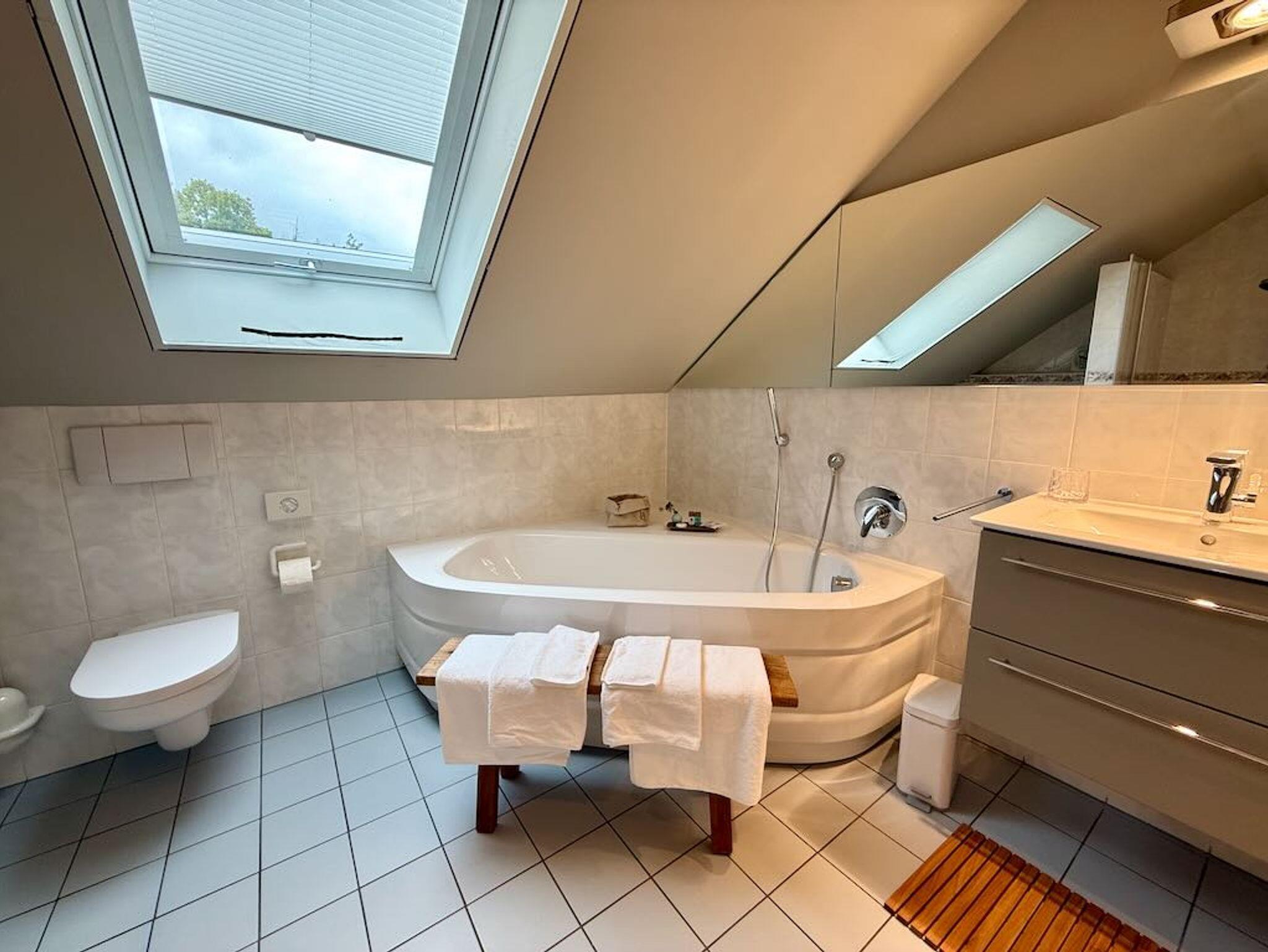 Das Badezimmer unserer Ferienwohnung präsentiert sich als modernes Tageslichtbad und luxuriöser Rückzugsort, der zum Wohlfühlen einlädt. Es ist ausgestattet mit hochwertigen Armaturen, edlen Materialien sowie einem Doppelwaschbecken und einem ansprechenden Design. Die geräumige Dusche und eine entspannende Badewanne bieten vielfältige Möglichkeiten zur Erfrischung und Erholung. Helle Farben und die natürliche Belichtung schaffen eine einladende und saubere Atmosphäre. Hier finden Sie alle Annehmlichkeiten, um sich nach einem ereignisreichen Tag zu revitalisieren und verwöhnen zu lassen.