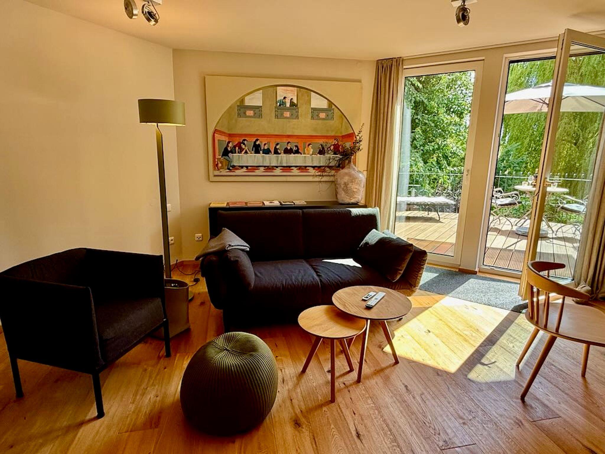 Das Herzstück der Ferienwohnung Elsa bildet ein äußerst geräumiger und offener Bereich, der Wohnzimmer, Küche und Garderobe elegant miteinander verbindet. Auf den insgesamt ca. 90 Quadratmetern der Wohnung strahlt dieser Hauptraum pure Eleganz und einladende Gemütlichkeit aus. Großzügige Fensterfronten fluten den Bereich mit Tageslicht und betonen die hochwertige Möblierung sowie das moderne Interieur. Hier finden Sie komfortable Sitzgelegenheiten, die zu entspannten Stunden einladen, sei es bei einem Filmabend auf dem modernen Flachbildfernseher oder angeregten Gesprächen. Besonders hervorzuheben ist der direkte Zugang zum Balkon, der den Wohnraum nahtlos ins Freie erweitert und ein offenes und luftiges Wohngefühl schafft.