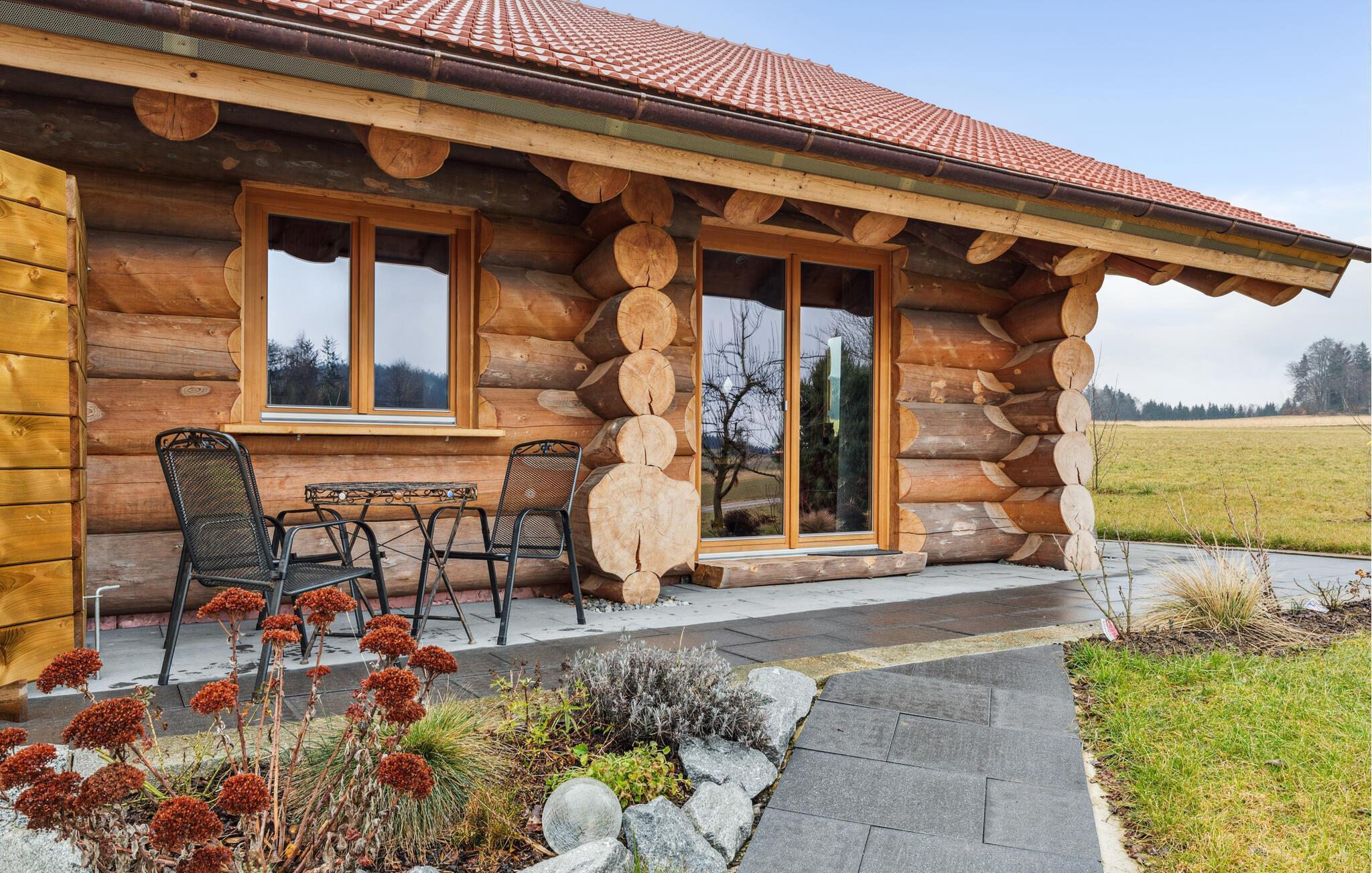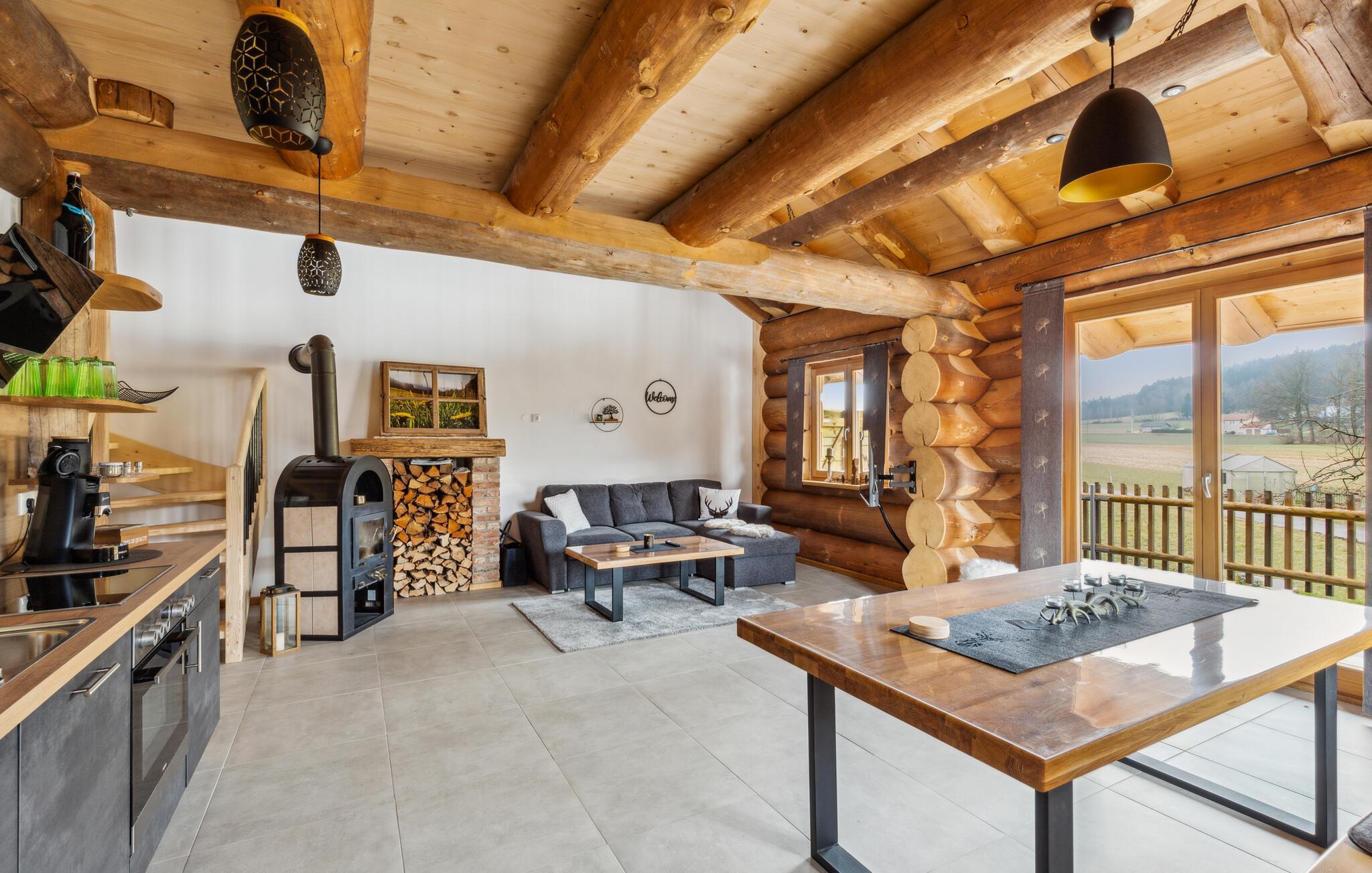 Glæd jer til en afslappende ferie i denne unikke bjælkehytte i den bayerske skov. Omgivet af bølgende bakker og maleriske enge tilbyder dette feriehus en smuk blanding af rustik charme og moderne komfort. Kom ind og lad jer fortrylle af den varme atmosfære i de solide træbjælker og den åbne opholdsstue. Find jer godt til rette på den hyggelige sofa ved brændeovnen eller nyd hyggelige aftener ved det store spisebord. Det moderne køkken lægger op til selv at tilberede regionale specialiteter. I kan også trække jer tilbage til øverste etage, hvor et læsehjørne og en bordfodbold sørger for hygge, leg og sjov. Nyd den smukke udsigt over landskabet heroppefra. Efter en begivenhedsrig dag sikrer husets sauna behagelig afslapning.