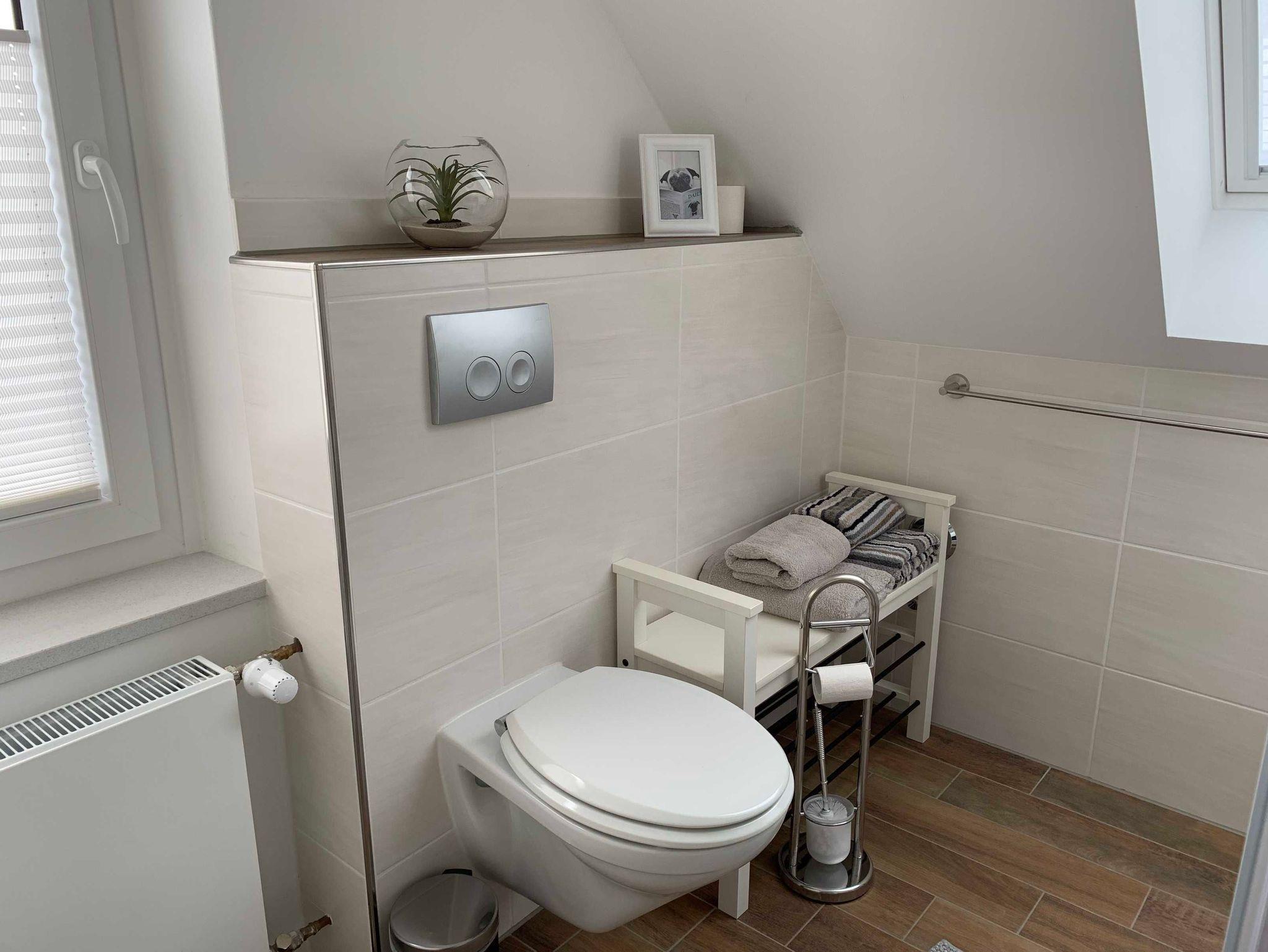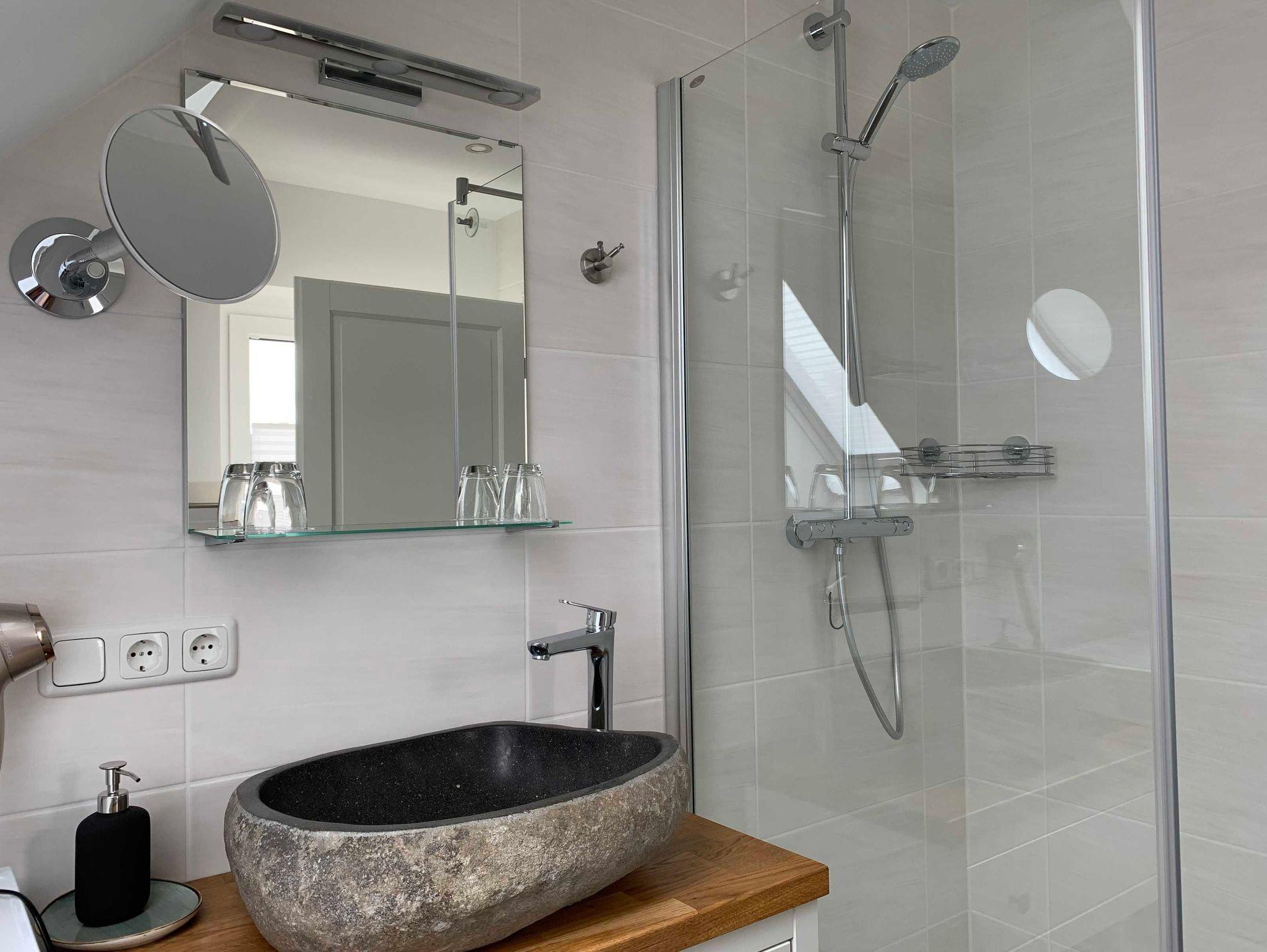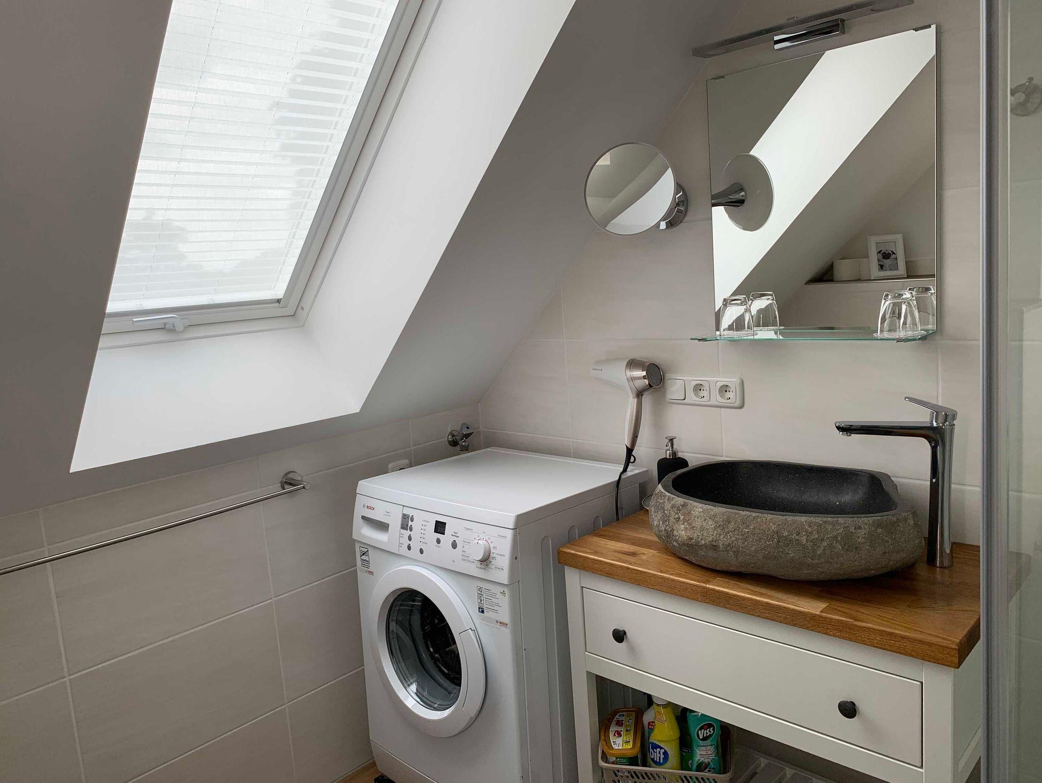 Das Badezimmer ist modern eingerichtet. Besonders die 90 mal 90 Zentimeter Glasduschkabine mit Rainshower-Dusche sowie das Natursteinwaschbecken machen das Urlaubsfeeling komplett. Im Badezimmer steht eine Waschmaschine zur Benutzung zur Verfügung. Auch ein Fön liegt für Sie bereit.