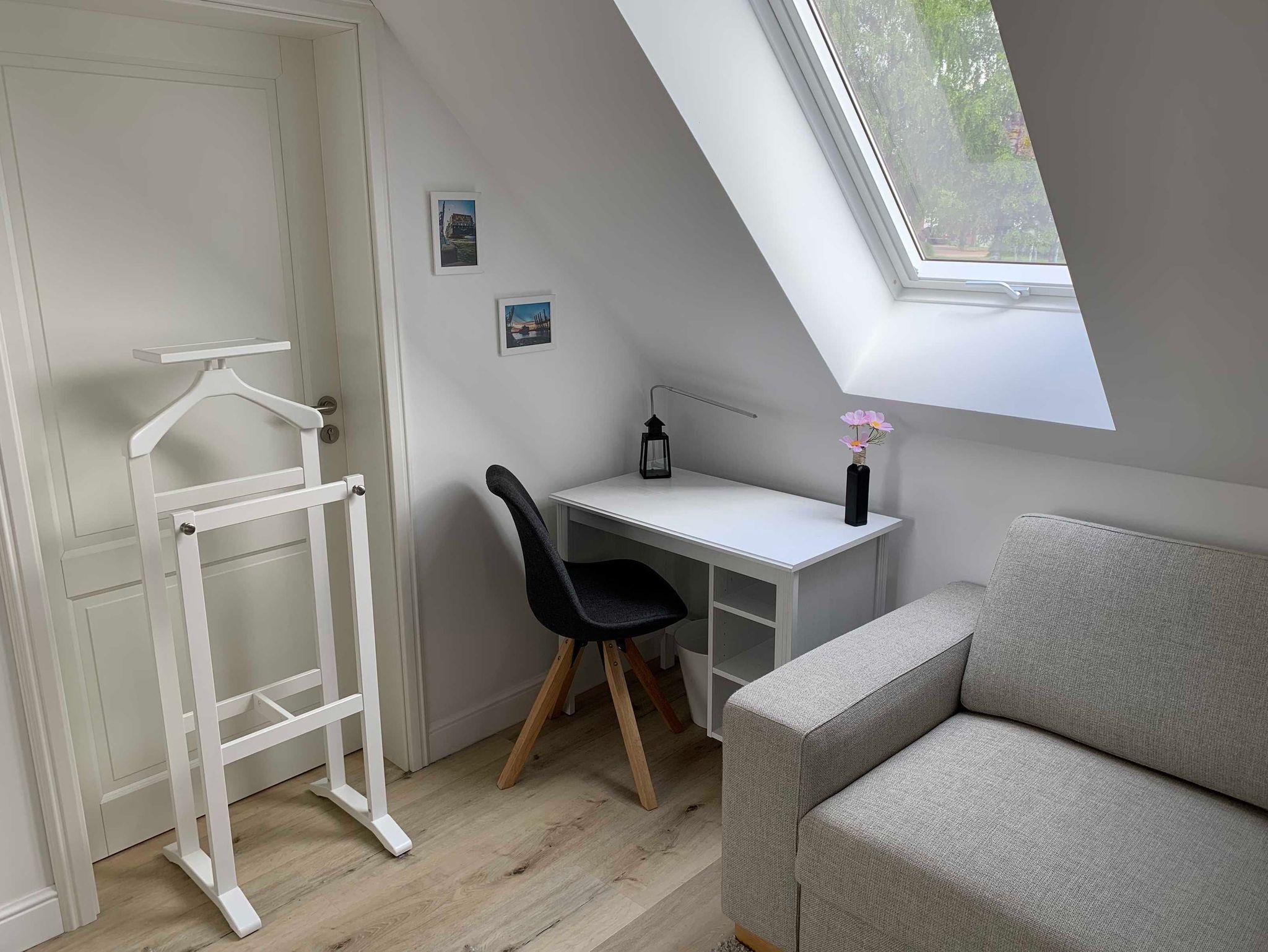 Ein moderner Flachbildfernseher sowie ein separater Schreibtisch komplettieren die Ausstattung des Wohnbereiches.