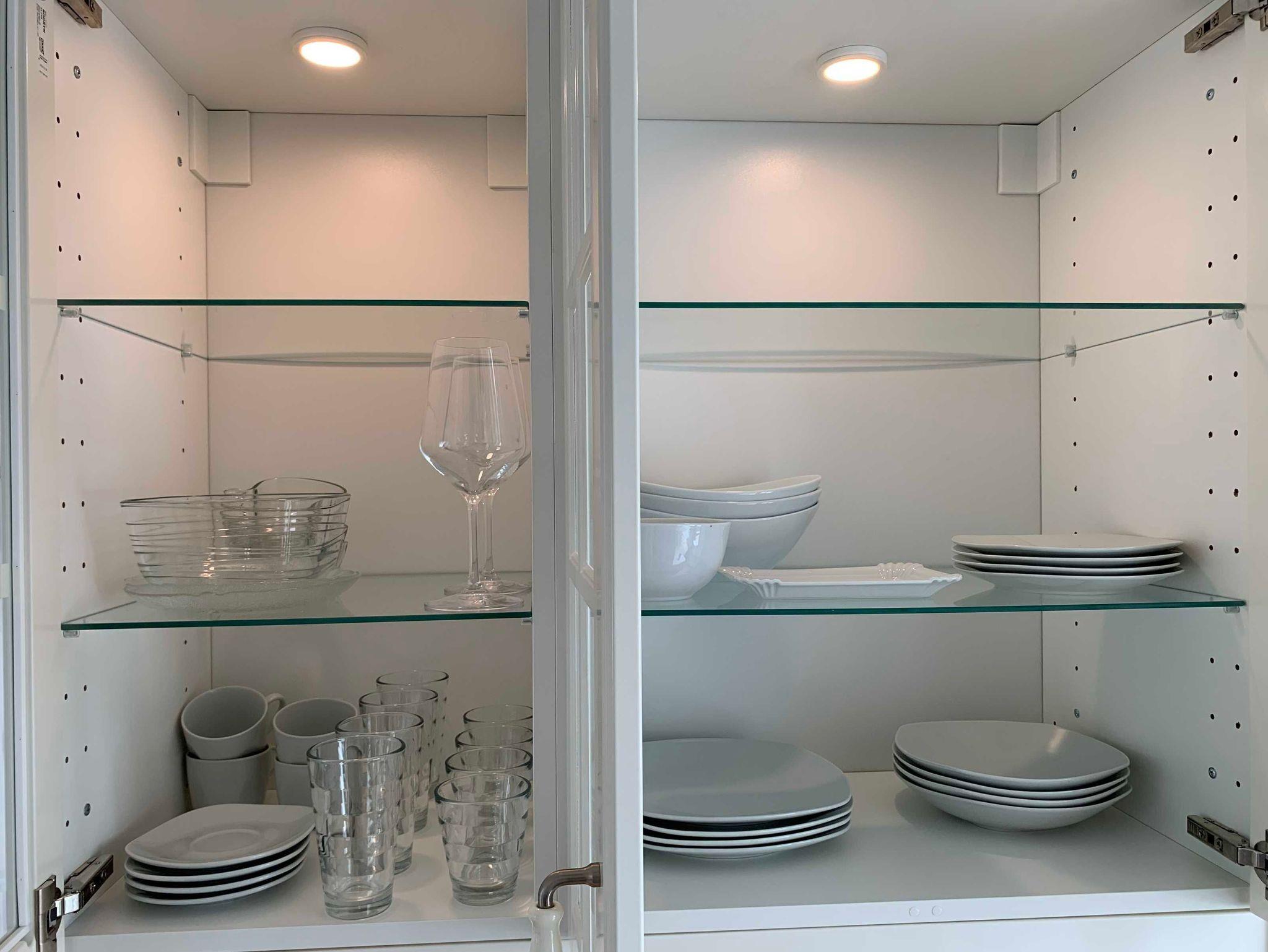 Nach dem Betreten der lichtdurchfluteten Wohnung können Sie es sich direkt auf dem Sofa gemütlich machen oder in der Küche Platz nehmen, um sich mit einem Getränk zu erfrischen. Die Gläser hierfür hält der beleuchtete Hängeglasschrank bereit.