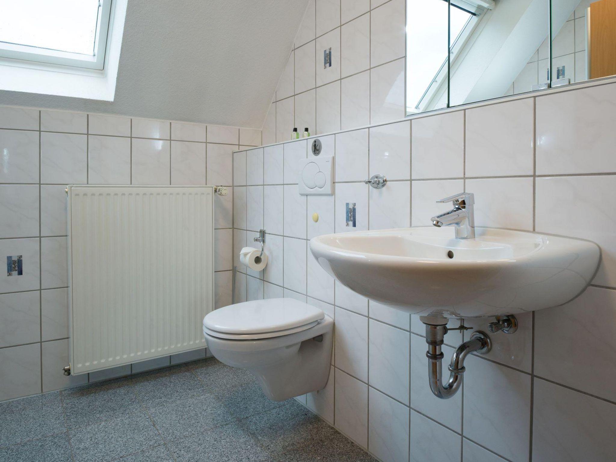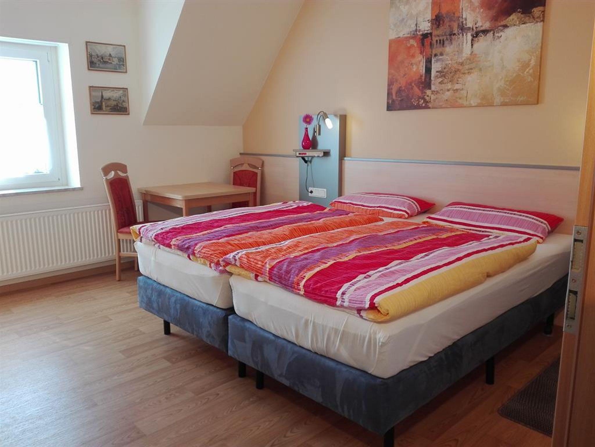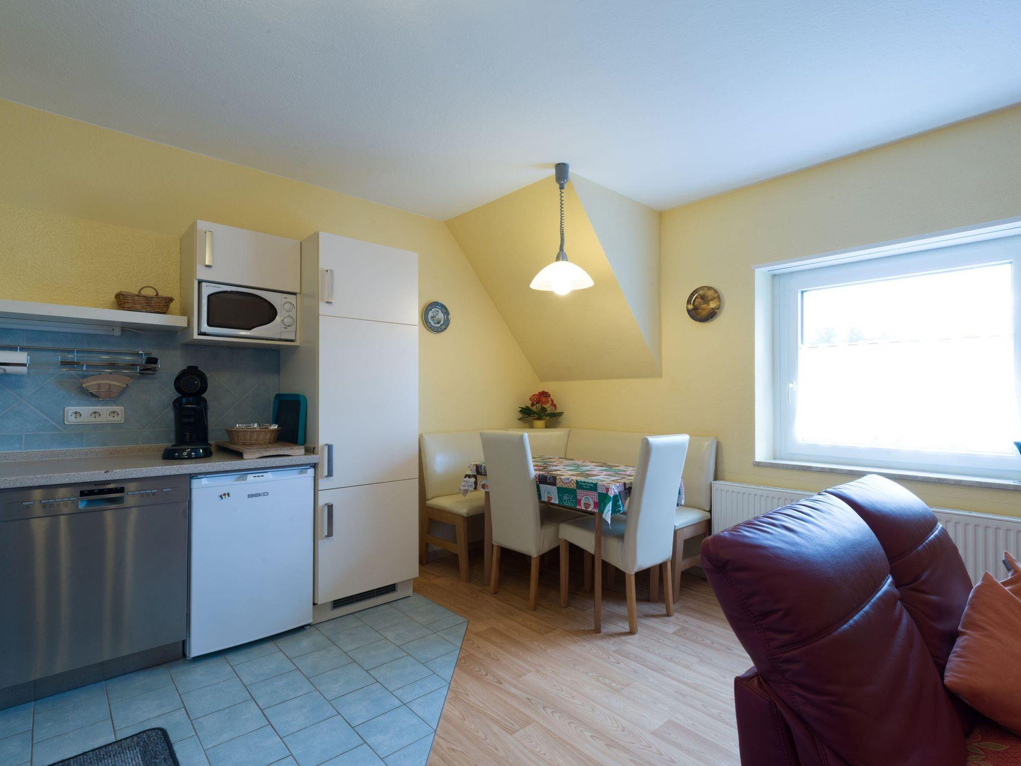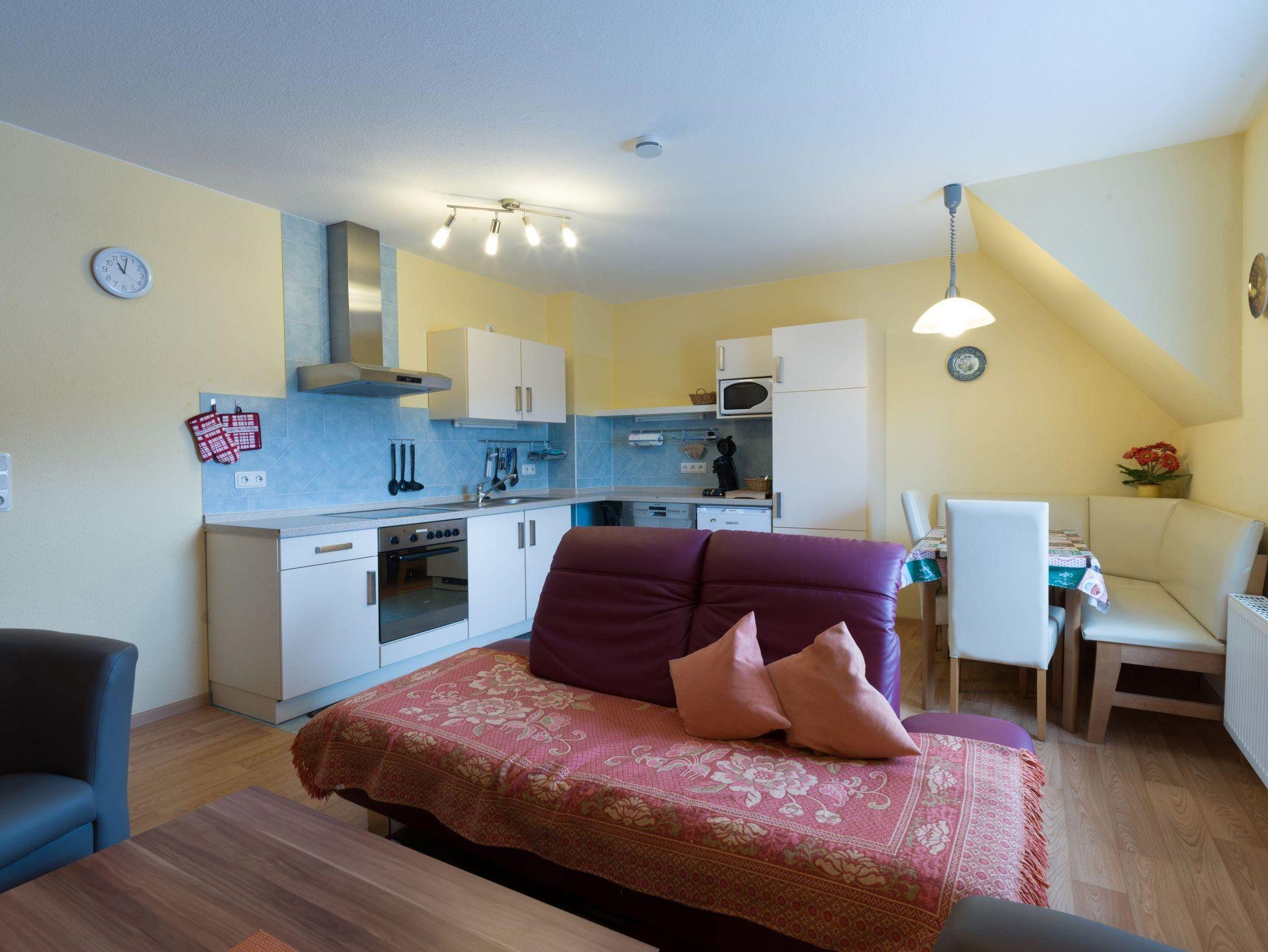 Diese Ferienwohnung ist ca. 70 m² groß und befindet sich in der oberen Etage. Sie verfügt über 2 Schlafzimmer, Wohnküche mit Essecke, Dusche/WC und Außenbalkon ca 10m². Die Küche ist komplett eingerichtet mit Kaffee/Kaffeepadmaschine, Toaster, Wasserkocher, Eierkocher, Elektroherd mit Backofen, Spülmaschine