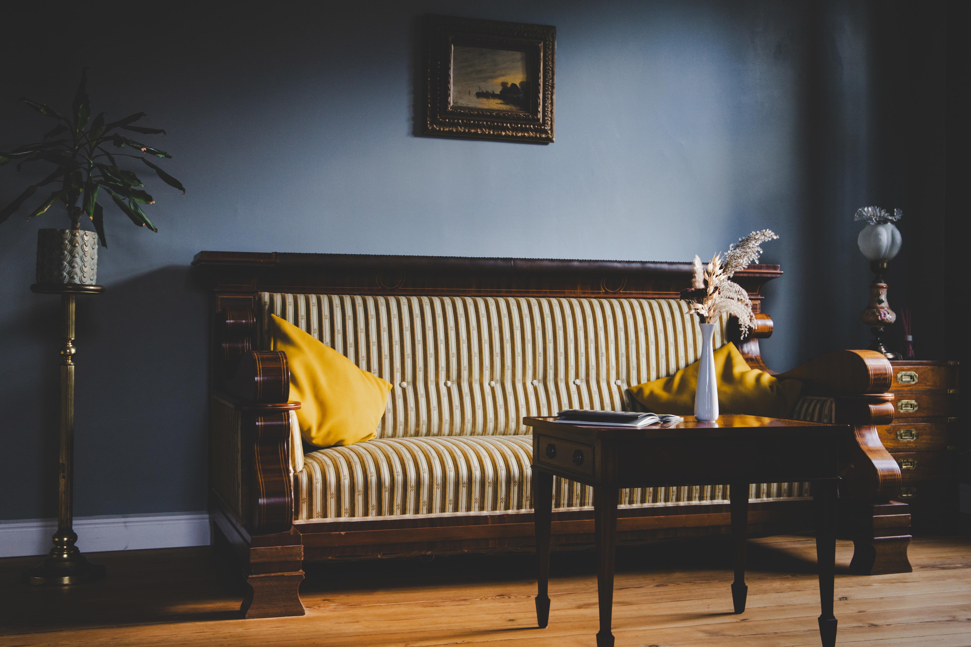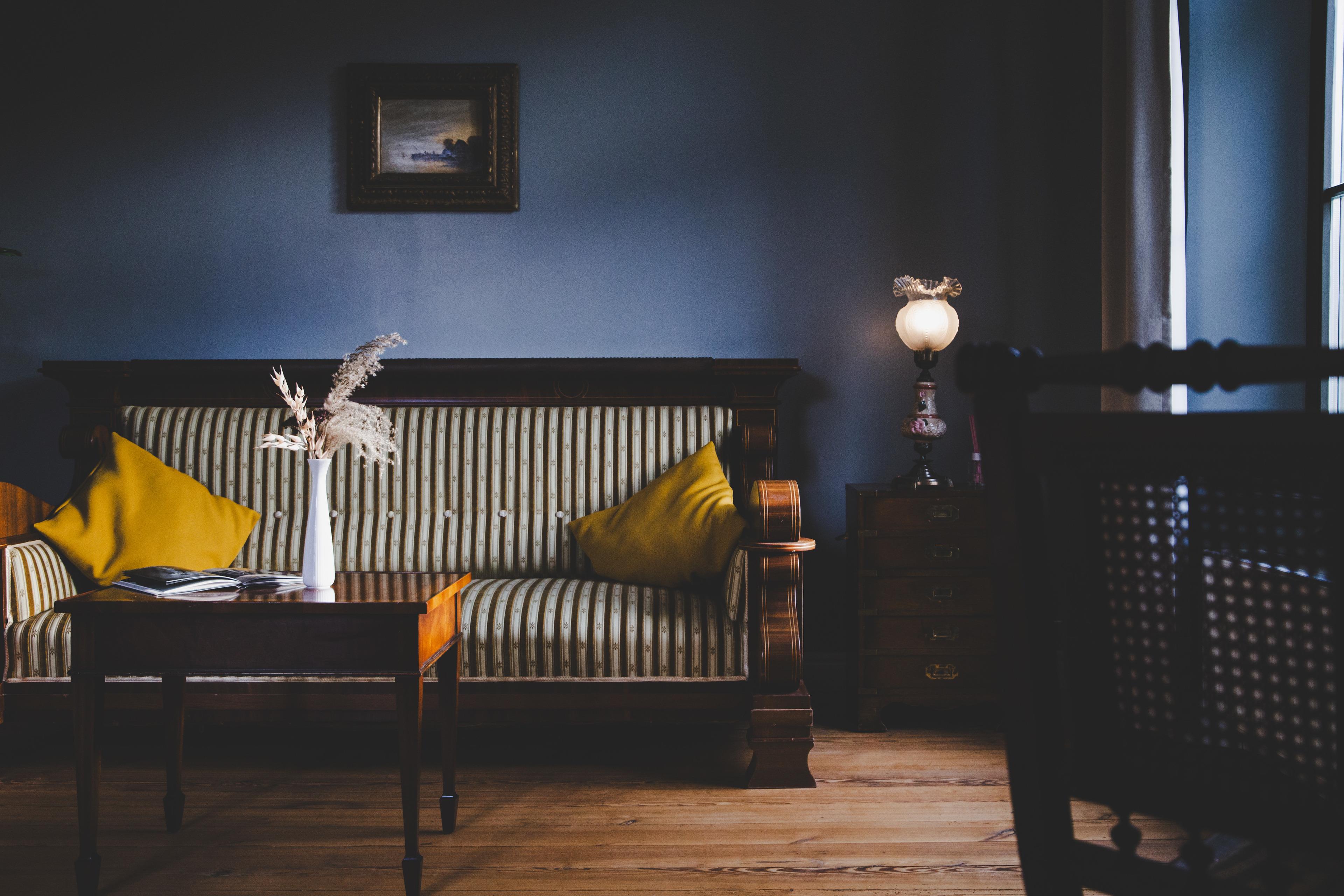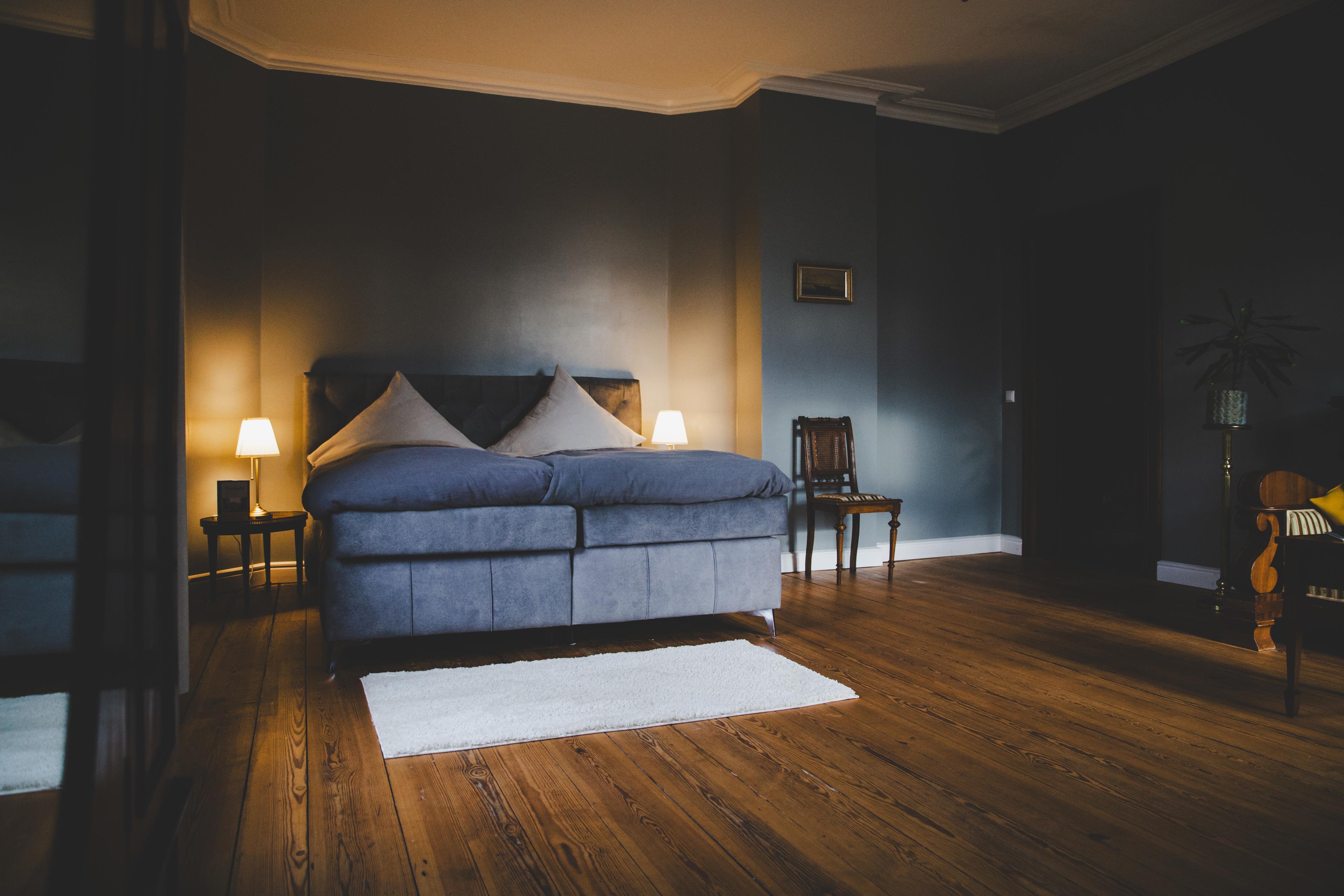 Das großzügige Schlafzimmer bietet mit seinem Kingsize-Bett unseren Gästen einen erholsamen Schlaf und bei offenem Vorhang beschert der Blick auf den einzigartigen Sternenhimmel romantische Abendstunden. Das große historische Sofa und die hochwertige Ausstattung versetzen unsere Gäste in die herrschaftlichen Zeiten und hinterlassen einen bleibenden Eindruck.