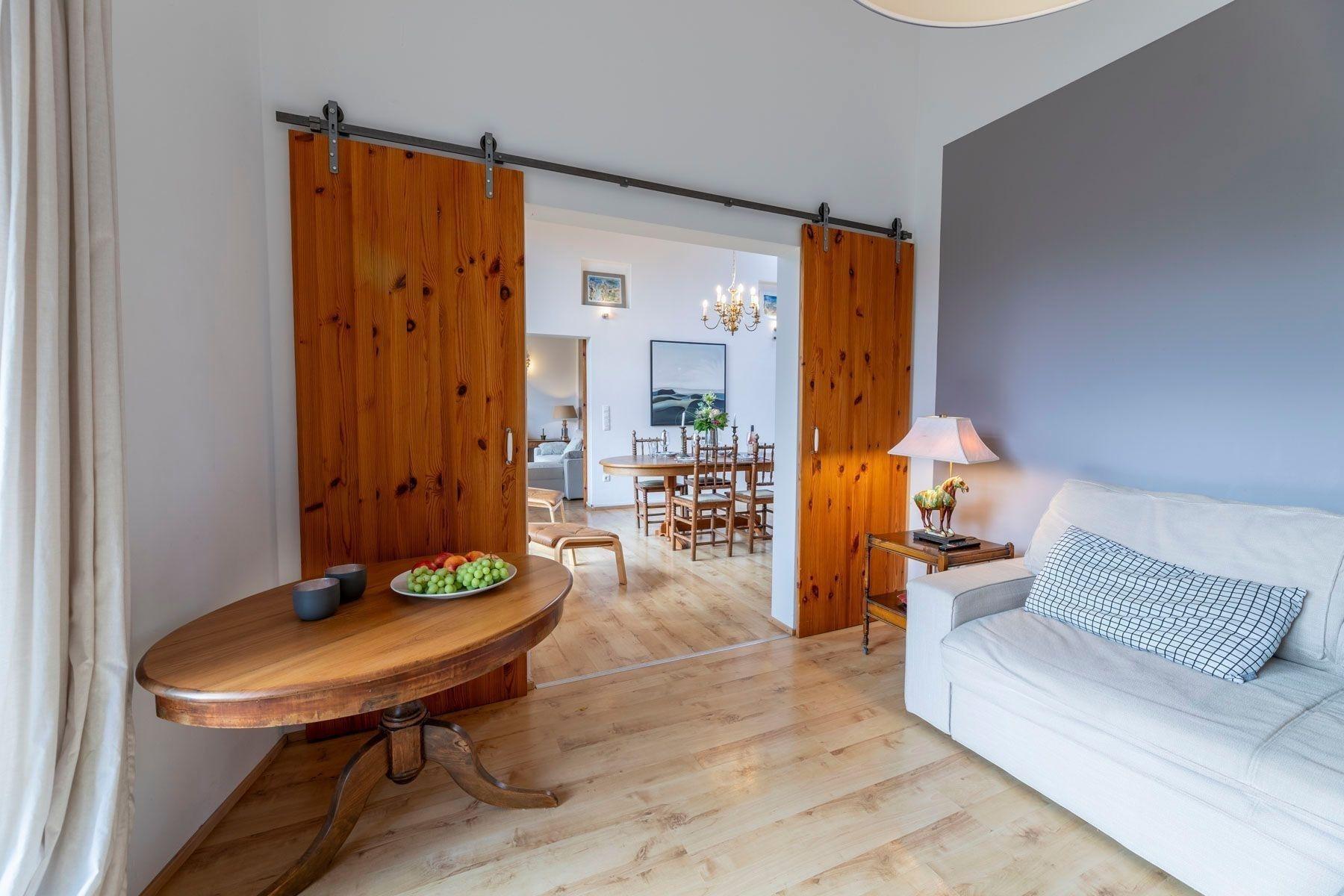 Das freistehende Haus Meerzeit in Behrensdorf bietet mit einer großzügigen Wohnfläche von 120 m² und fünf Zimmern idealen Komfort für bis zu 4 Personen. Zwei separate Schlafzimmer gewährleisten Privatsphäre, während die beiden Badezimmer mit Dusche, Waschbecken, WC sowie zusätzlichen Annehmlichkeiten wie Badewanne und Bidet ausgestattet sind. Die beiden Wohnzimmer, jeweils mit TV und Couch/Schlafsofa, bieten Möglichkeiten zur individuellen Entspannung. Die moderne, offene Küche ist mit Cerankochfeld, Backofen, Kühlschrank, Geschirrspüler und weiteren Küchengeräten bestens ausgestattet. Eine HiFi-Anlage und WLAN sorgen für Unterhaltung und Verbindung. Die integrierte Infrarotsauna bietet Entspannung nach einem Tag am Strand. Zudem stehen Waschmaschine und Trockner zur Verfügung. Die lichtdurchfluteten Räume und die durchdachte Ausstattung machen dieses Haus zum idealen Rückzugsort für erholsame Ferien.