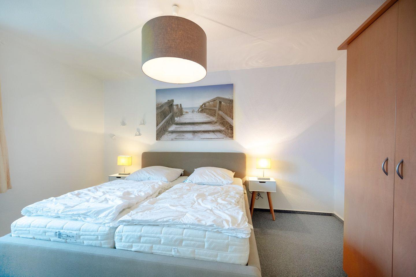 Schlafzimmer 1: Ein großes Doppelbett, Nachttische mit Leselampen und viel Stauraum.
