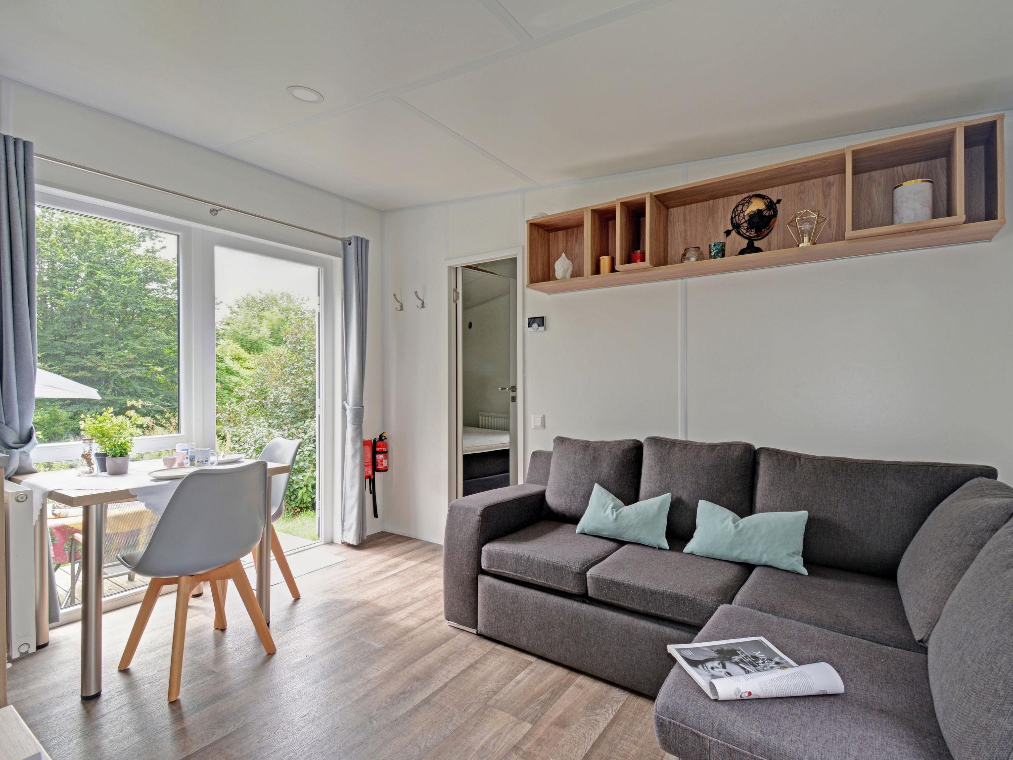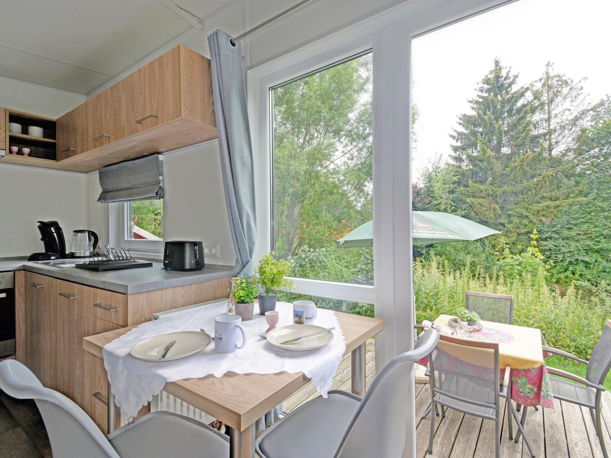"Tiny Haus Sonnendeck", 2-room mobile home 25 m2. Object suitable for 2 adults + 2 children. Cosy furnishings: living/sleeping room with 1 sofabed (120 cm, length 170 cm), satellite TV. Exit to the terrace. 1 room with 1 french bed (140 cm, length 200 cm). Open kitchen (oven, Gas stove, 2 gas rings, kettle, electric coffee machine). Shower/WC. Gas heating. Terrace. Terrace furniture. Parking (1 car) at the house. Please note: non-smoking house. Maximum 1 pet/ dog allowed. coffee pad machine.