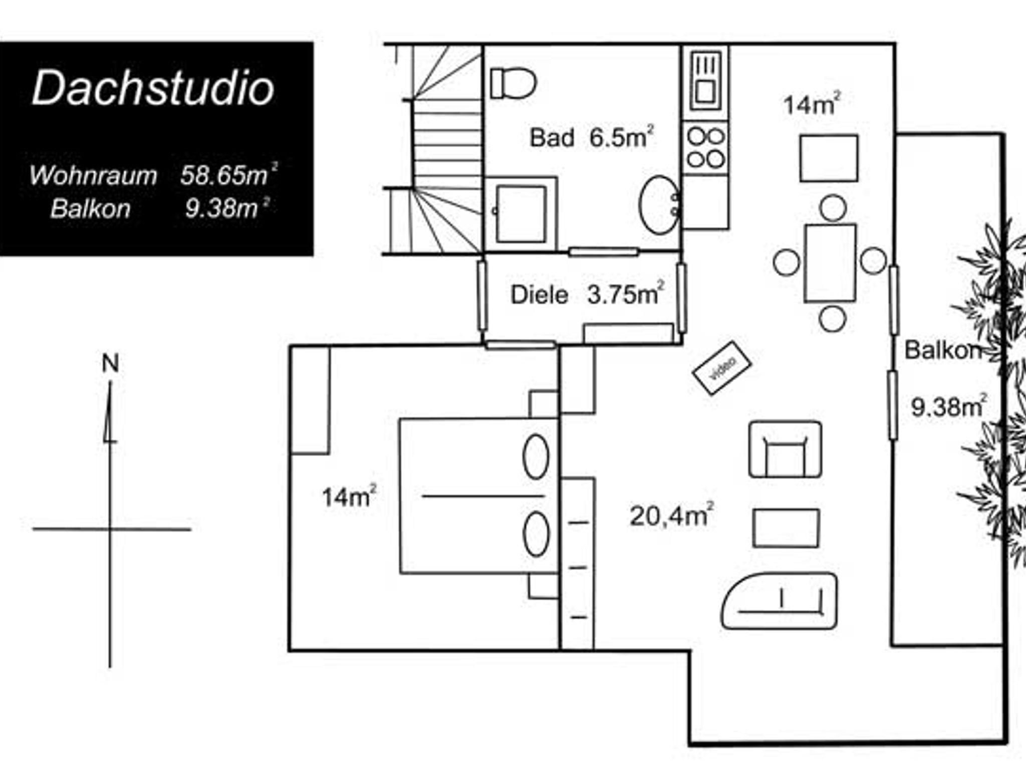 Abgeschlossene, gemütlich eingerichtete Dachgeschosswohnung in Südostlage, Diele mit Garderobe, geräumiges, helles Bad mit Fenster, Dusche/WC, Spiegelschrank und Föhn, Schlafzimmer, Wohnzimmer mit Sofa, Couchtisch, Schrankwand, Schreibtisch und Flachbild-TV, Küche mit Backofen und Ceranplatte, Kühlschrank inkl. Gefrierfach, Mikrowelle, Wasserkocher, Toaster und Kaffeefilter, Essplatz mit direktem Zugang zum großen möblierten Balkon; WLAN, Garage für Fahrräder, E-Ladestation.