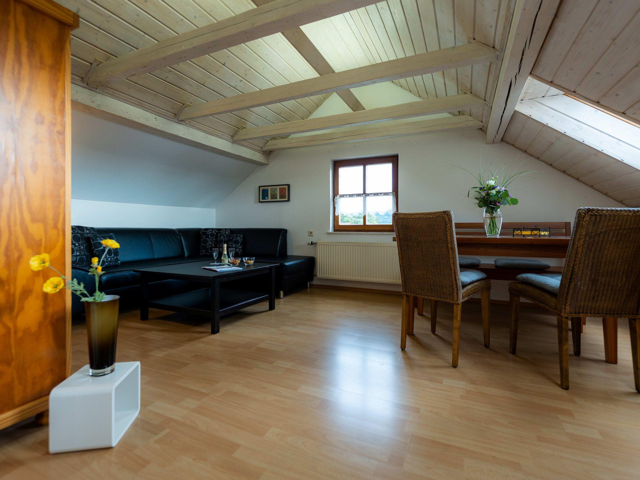 Unsere Dachgeschossferienwohnung mit herrlichem Ausblick auf Schloss Hirschberg und auf den Arzberg hat eine Wohnfläche von 70 m² und befindet sich im 2. Stock. Sie ist über ein eigenes Treppenhaus erreichbar und bietet ein großzügiges Platzangebot für 2 Personen. Durch die Dachschrägen und die sichtbare Balkenkonstruktion hat unsere Wohnung einen attraktiven Charakter. Aufgrund der vielen Fenster im Wohnbereich wird sie sehr hell und freundlich. Selbstverständlich können diese mit elektrischen Rollläden und Fensterläden ausreichend verdunkelt werden. Ca. 200 m zum Freibad, Nähe Radweg, 10 Gehmin. zur Stadtmitte.